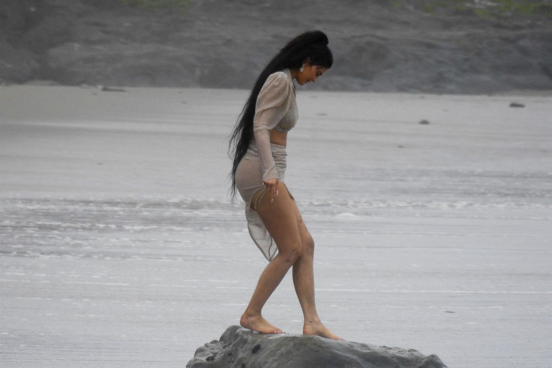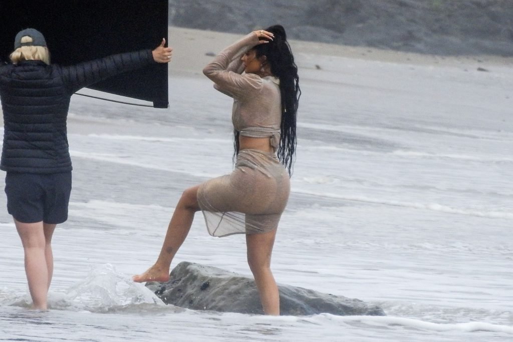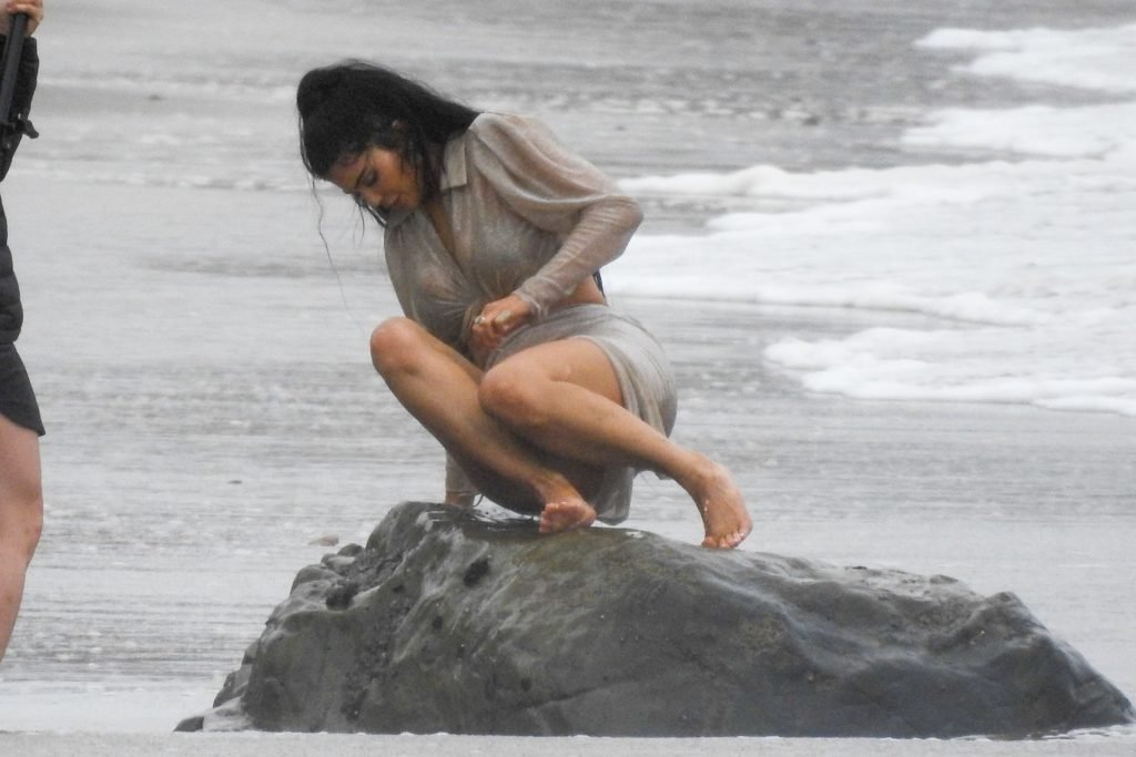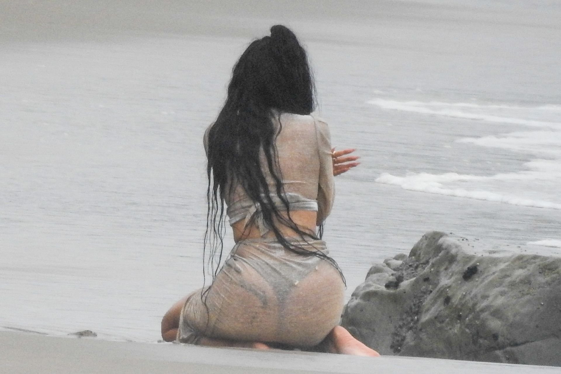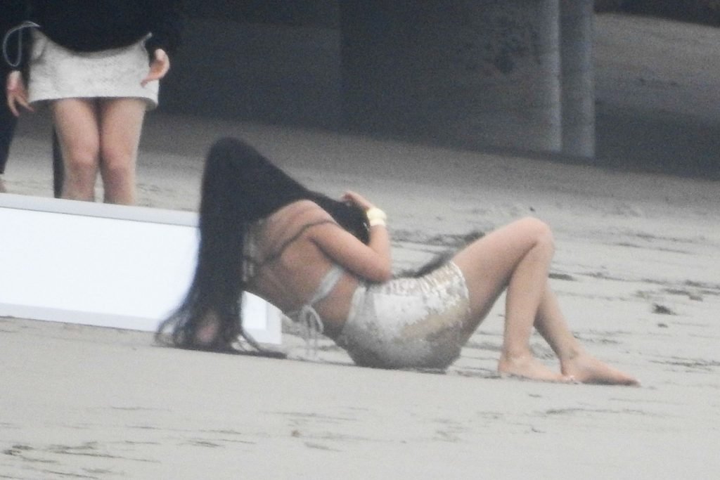 Kylie Jenner arrasou com transparências e lantejoulas durante um ensaio fotográfico muito sexy em Malibu, 04/06/2019. A estrela da realidade exibiu suas curvas deslumbrantes enquanto posava nas pedras usando uma tanga e uma saia transparente com um top leve que mostrava seu abdômen definido.