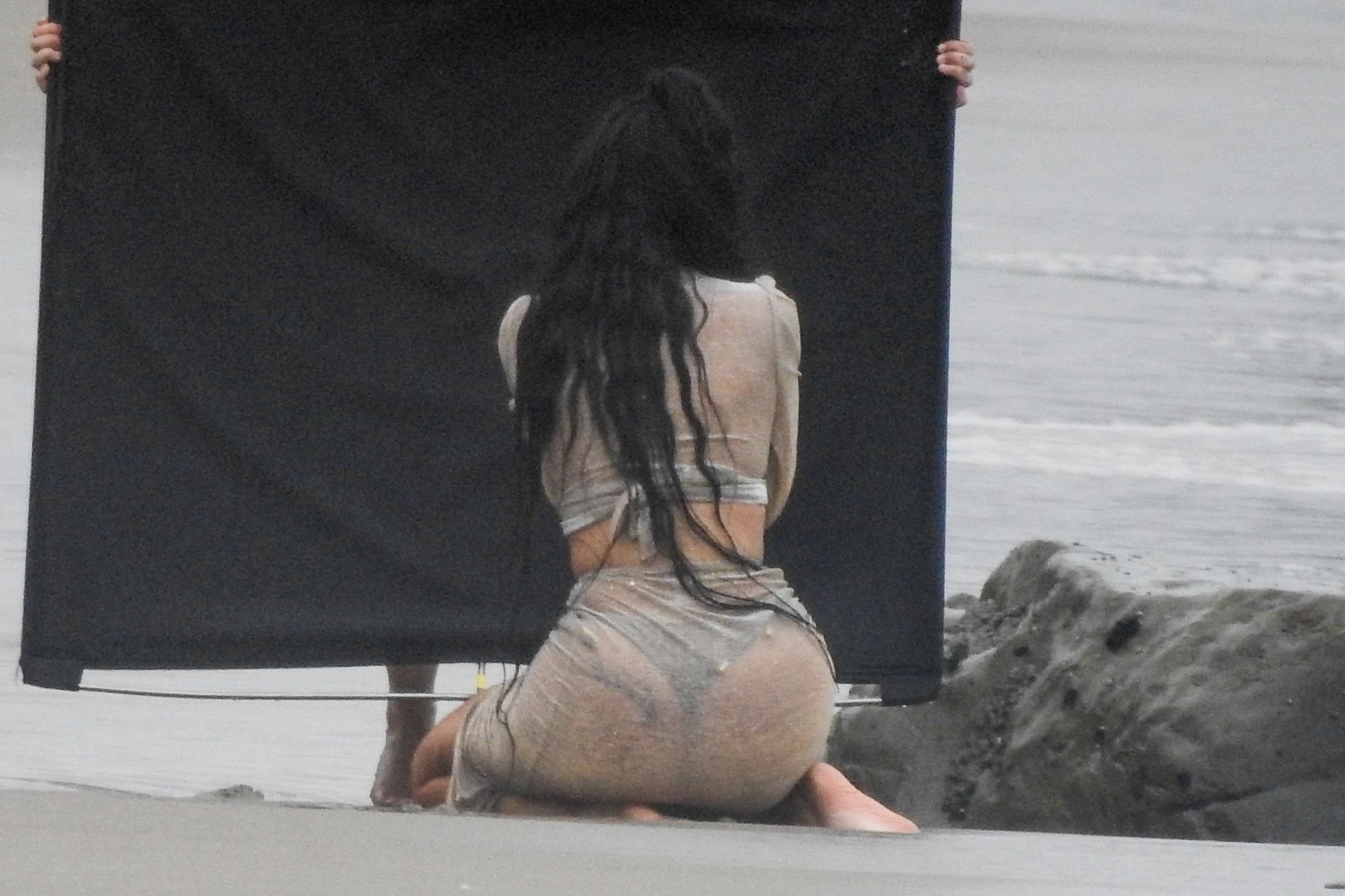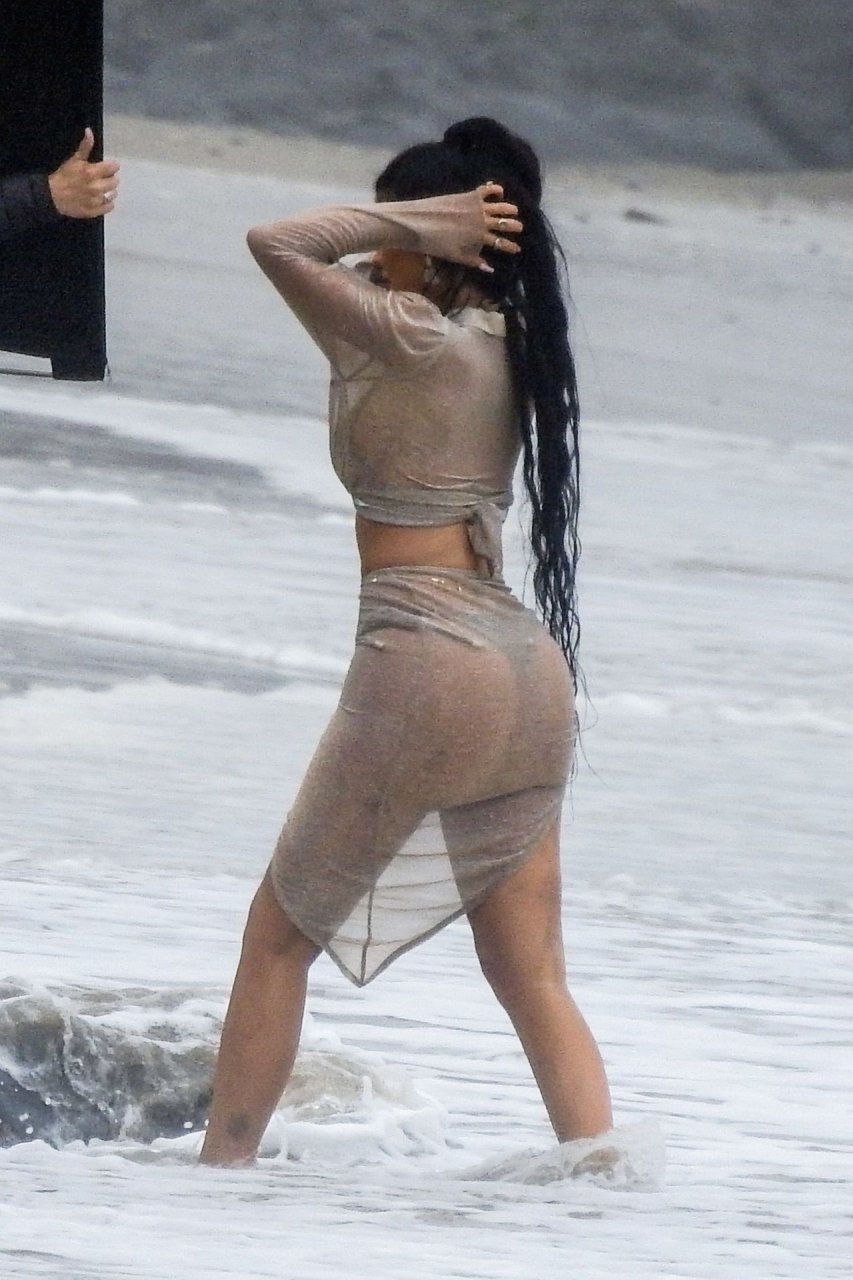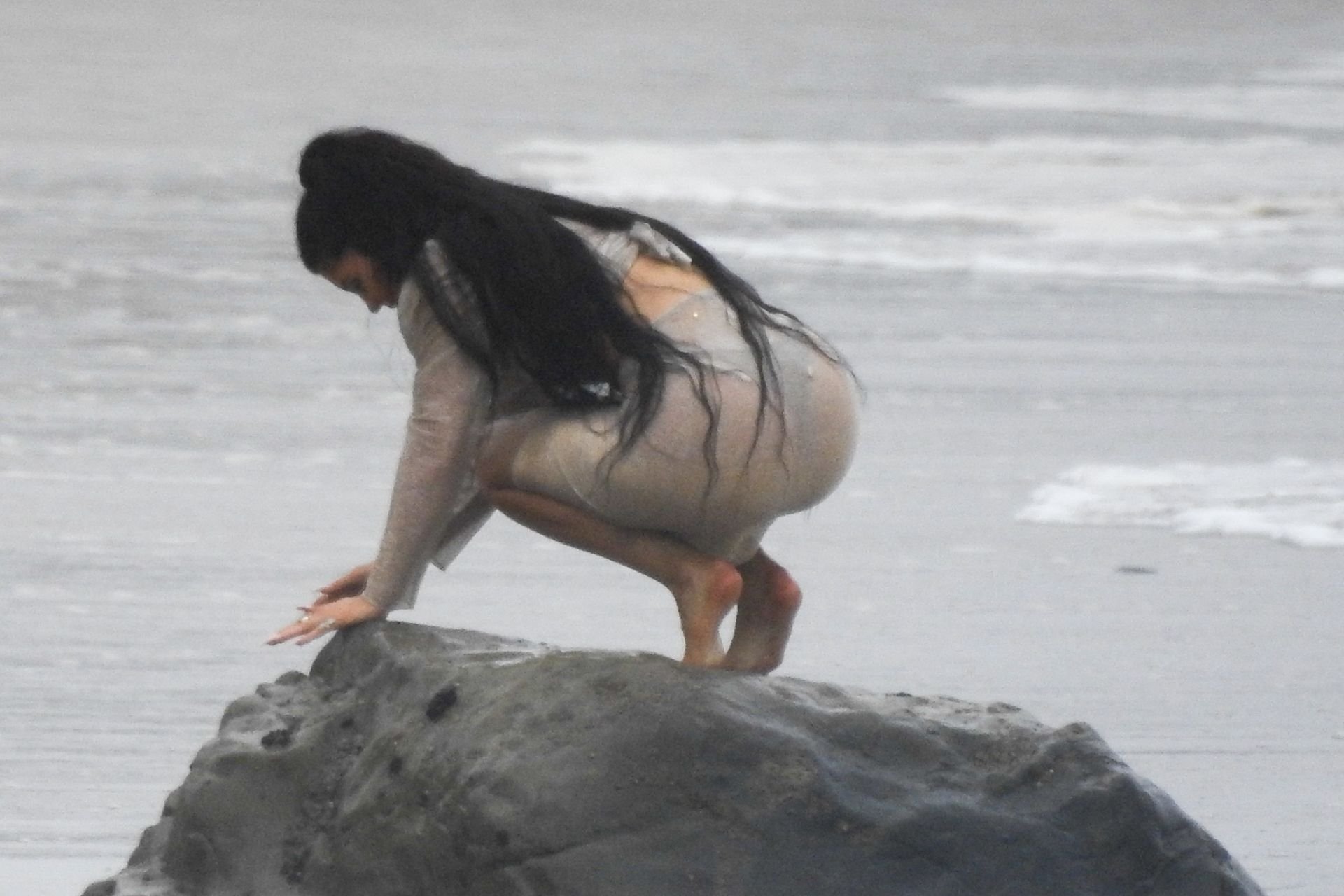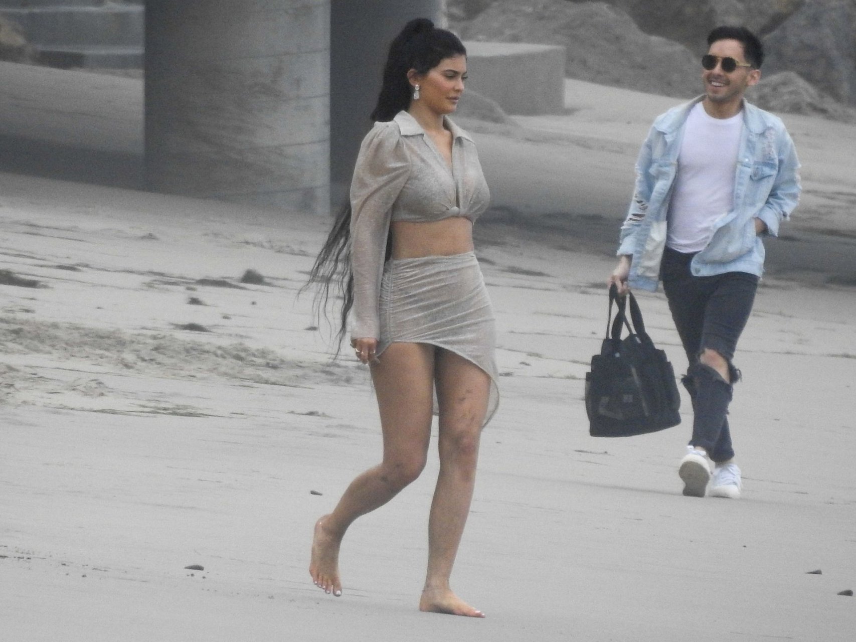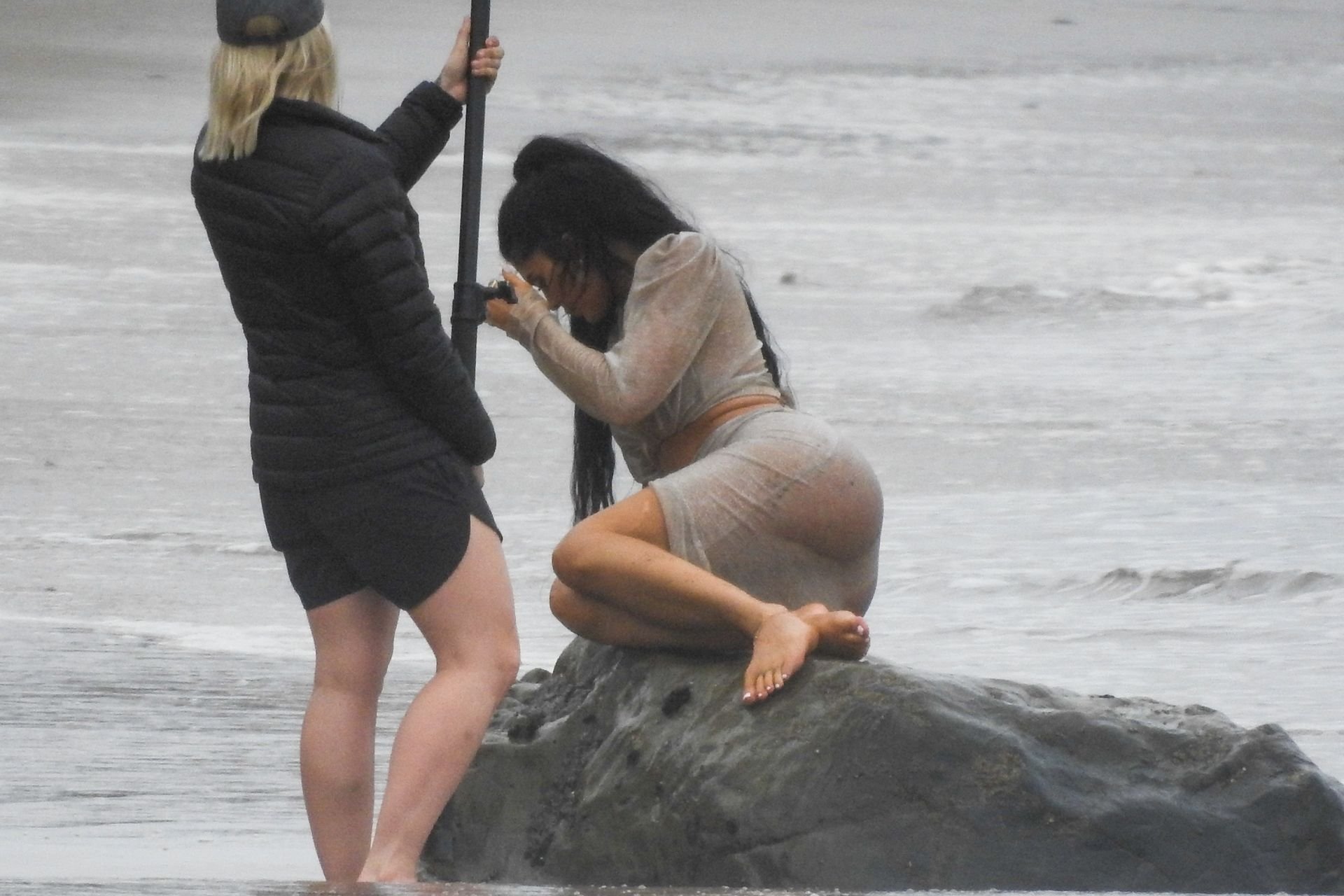 Kylie Jenner arrasou com transparências e lantejoulas durante um ensaio fotográfico muito sexy em Malibu, 04/06/2019. A estrela da realidade exibiu suas curvas deslumbrantes enquanto posava nas pedras usando uma tanga e uma saia transparente com um top leve que mostrava seu abdômen definido.