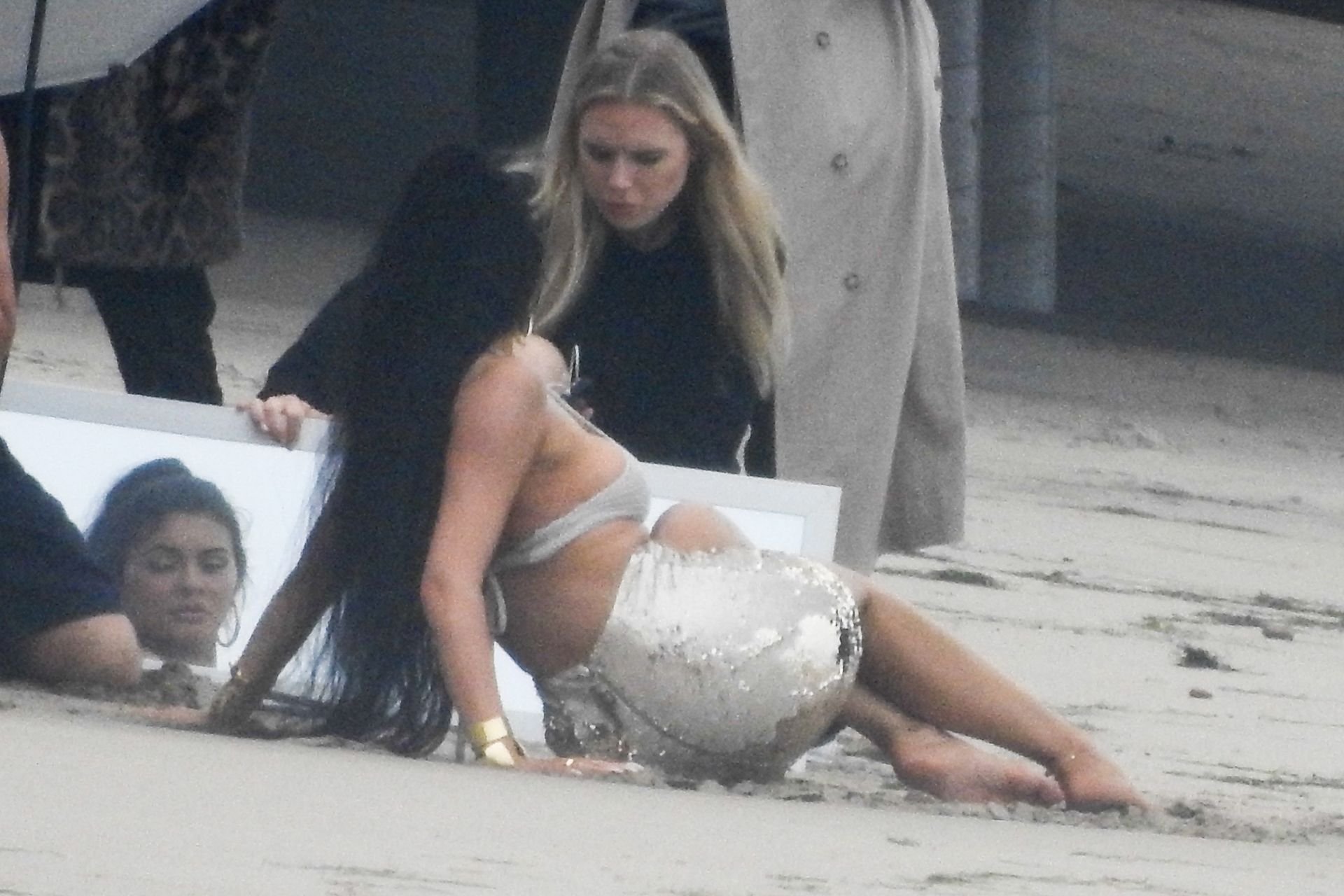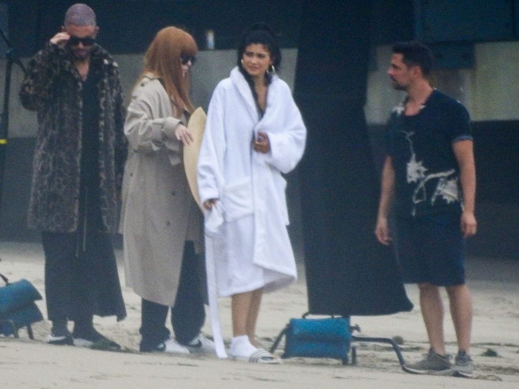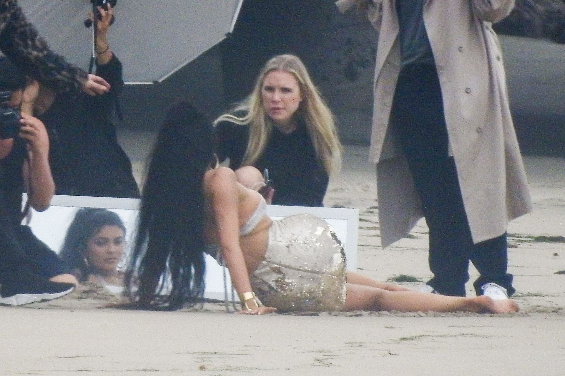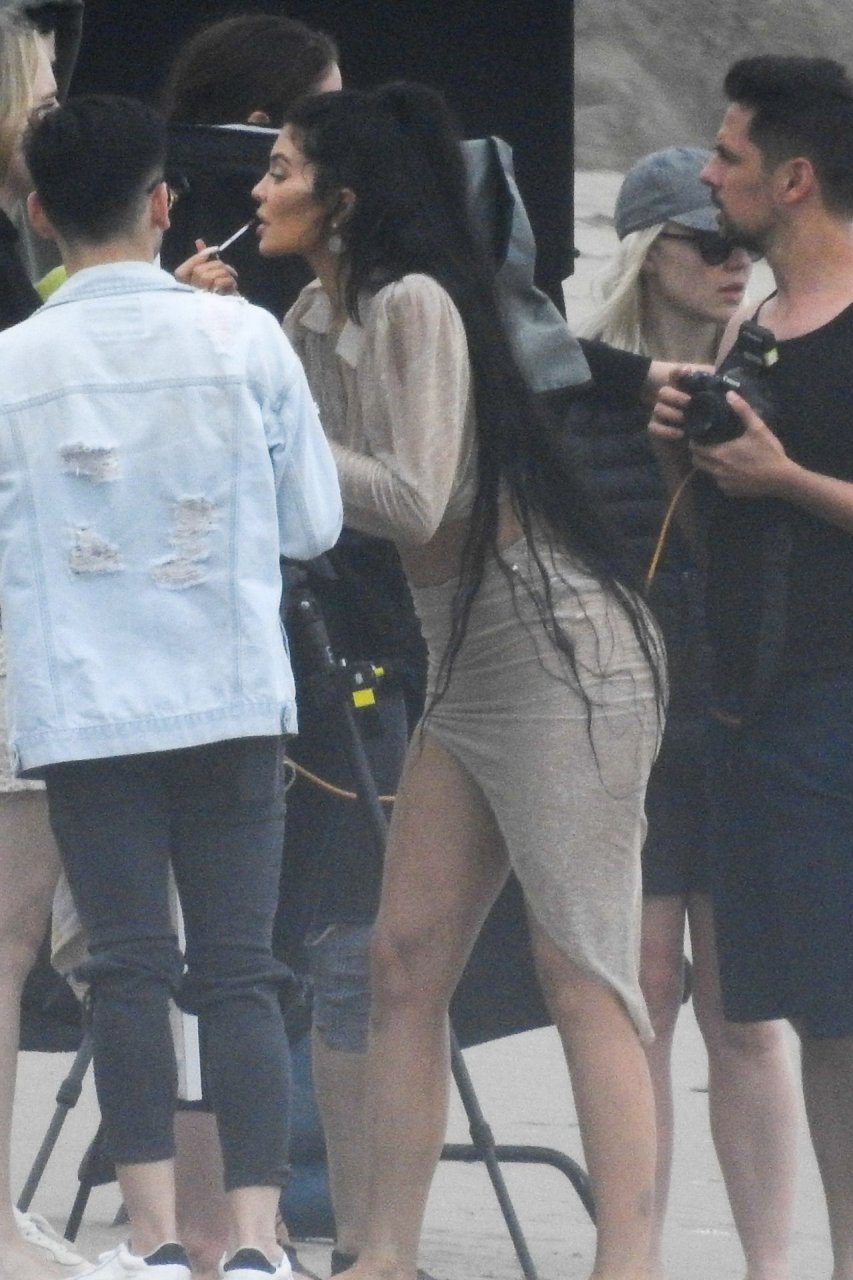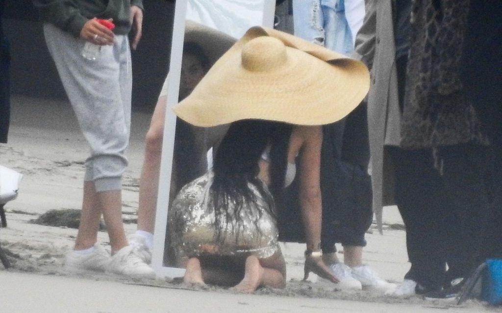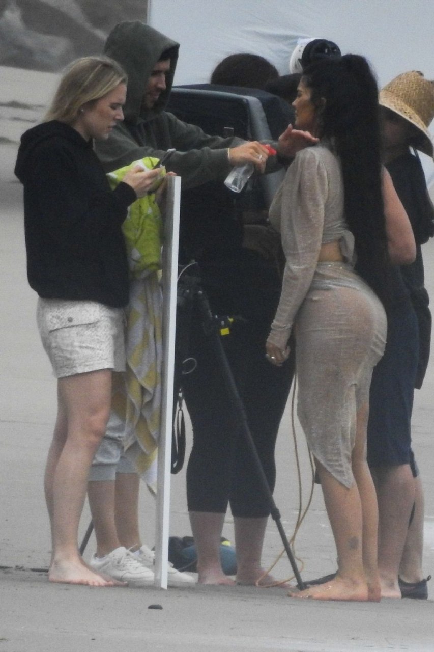 Em outro cenário, Kylie usou um top de biquíni, saia de lantejoulas e um chapéu de praia oversized enquanto posava na areia em frente a um espelho. Bastante equipe estava presente para ajudar, e um assistente sortudo teve a tarefa exaustiva de borrifá-la com uma garrafa de água, garantindo que ela tivesse a quantidade certa de água e areia grudada nas pernas.