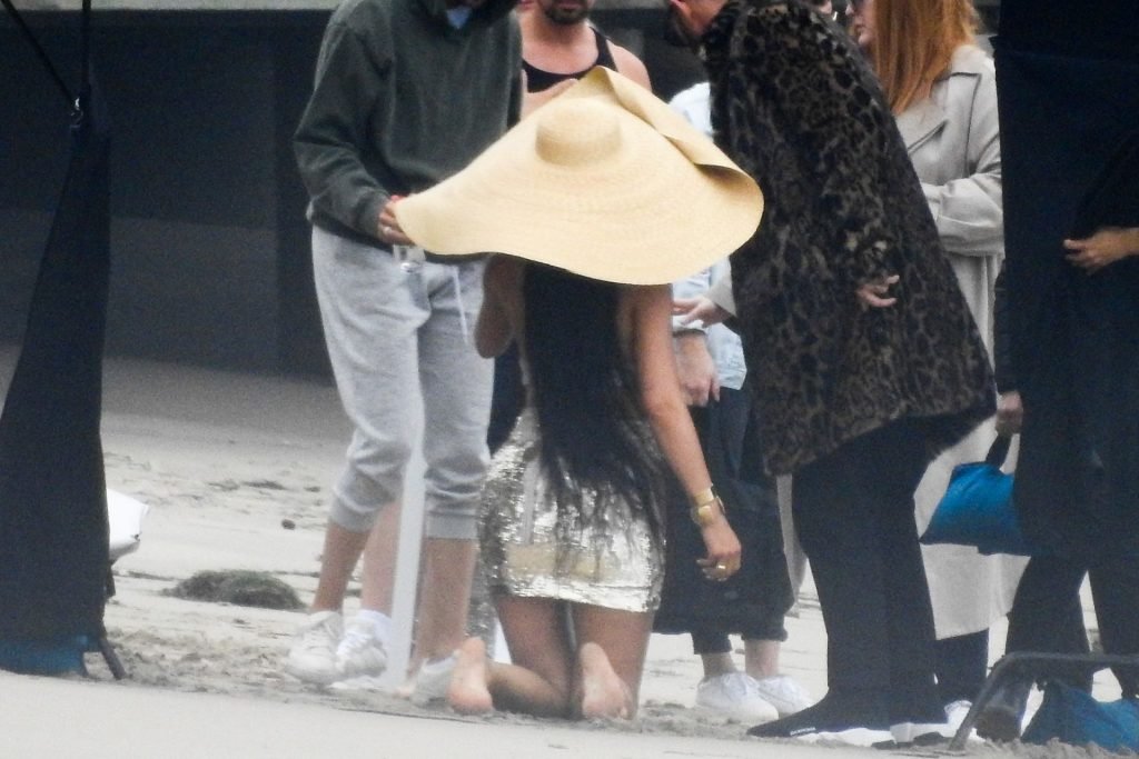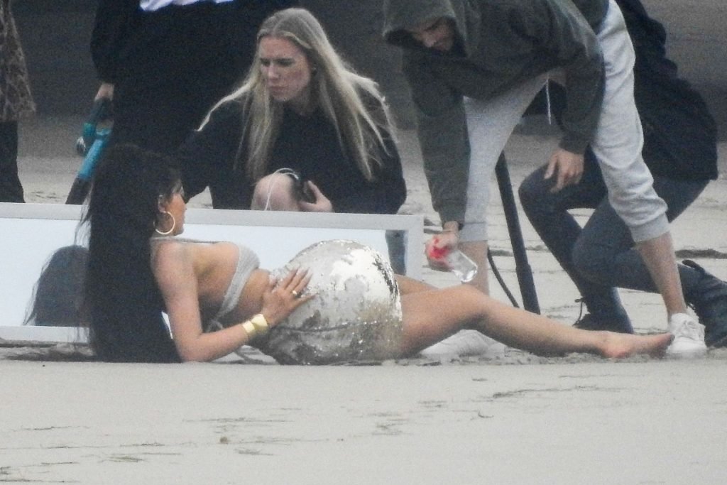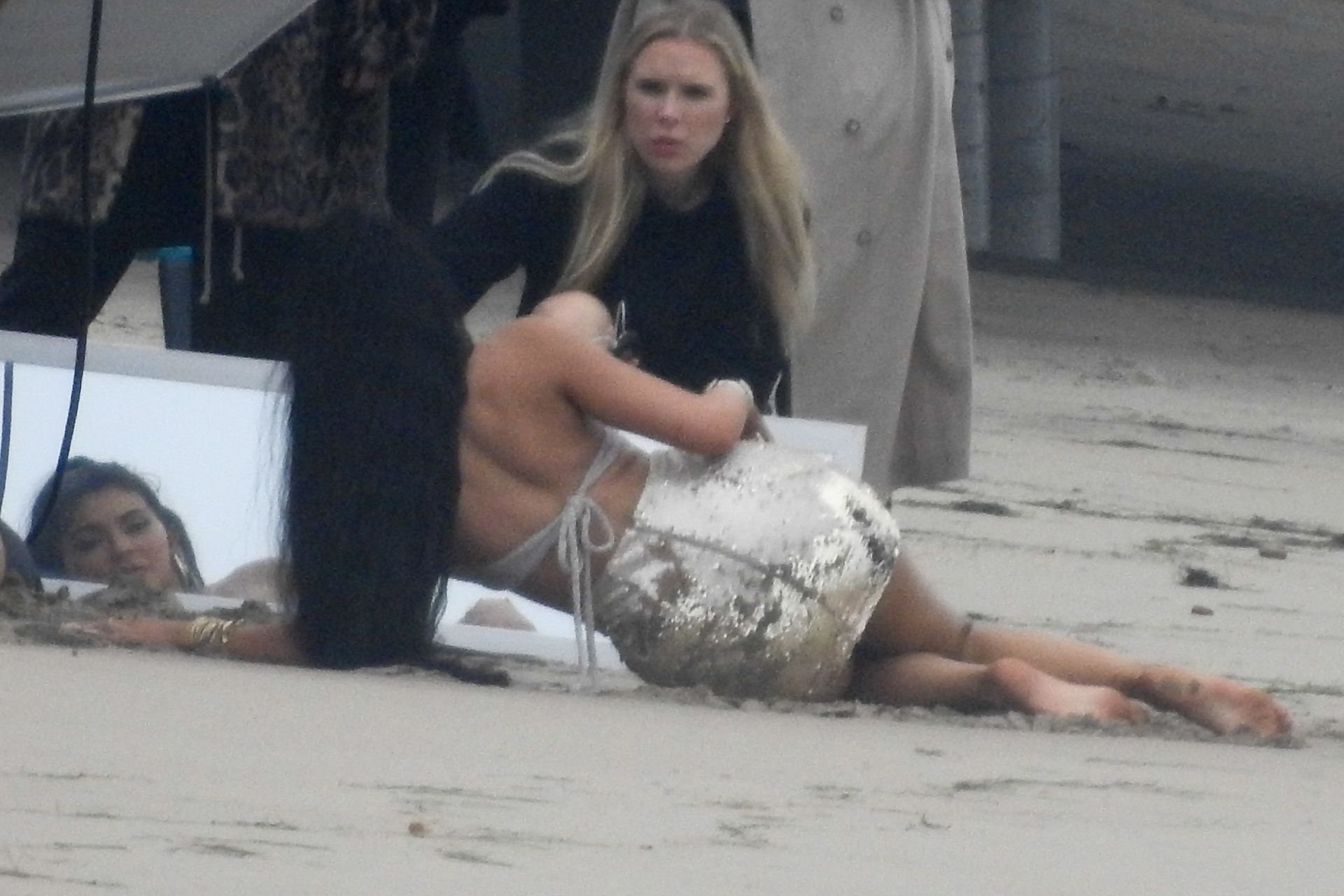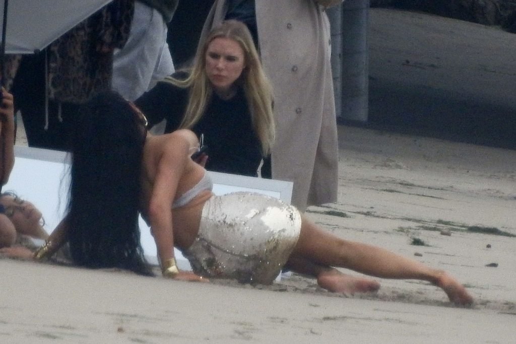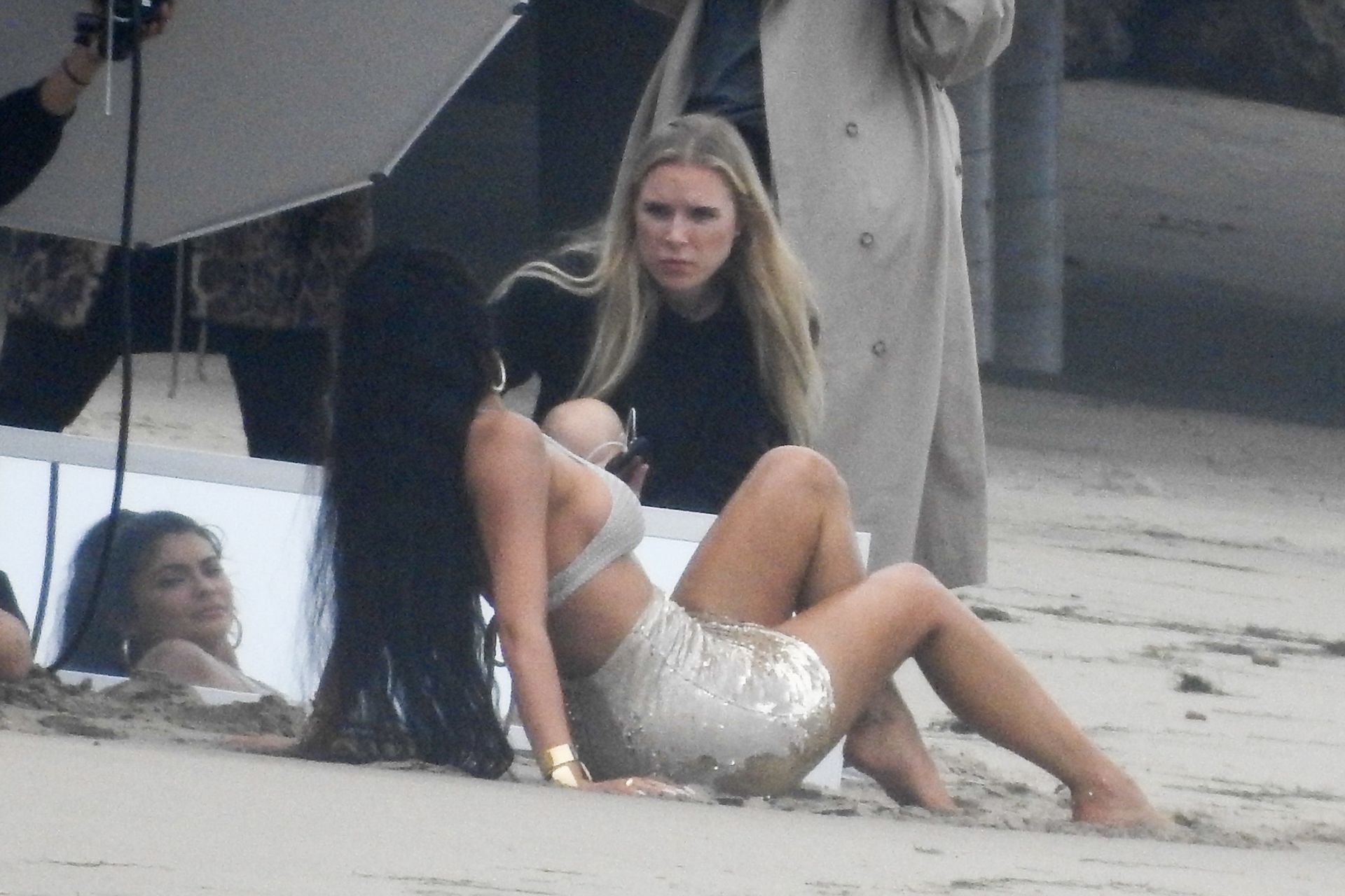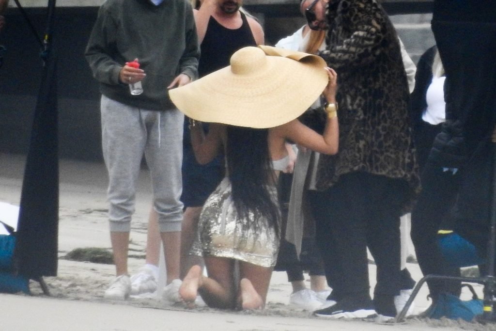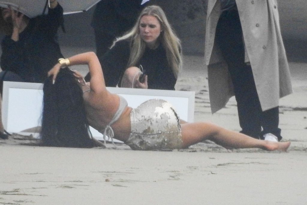 Em outro cenário, Kylie usou um top de biquíni, saia de lantejoulas e um chapéu de praia oversized enquanto posava na areia em frente a um espelho. Bastante equipe estava presente para ajudar, e um assistente sortudo teve a tarefa exaustiva de borrifá-la com uma garrafa de água, garantindo que ela tivesse a quantidade certa de água e areia grudada nas pernas.