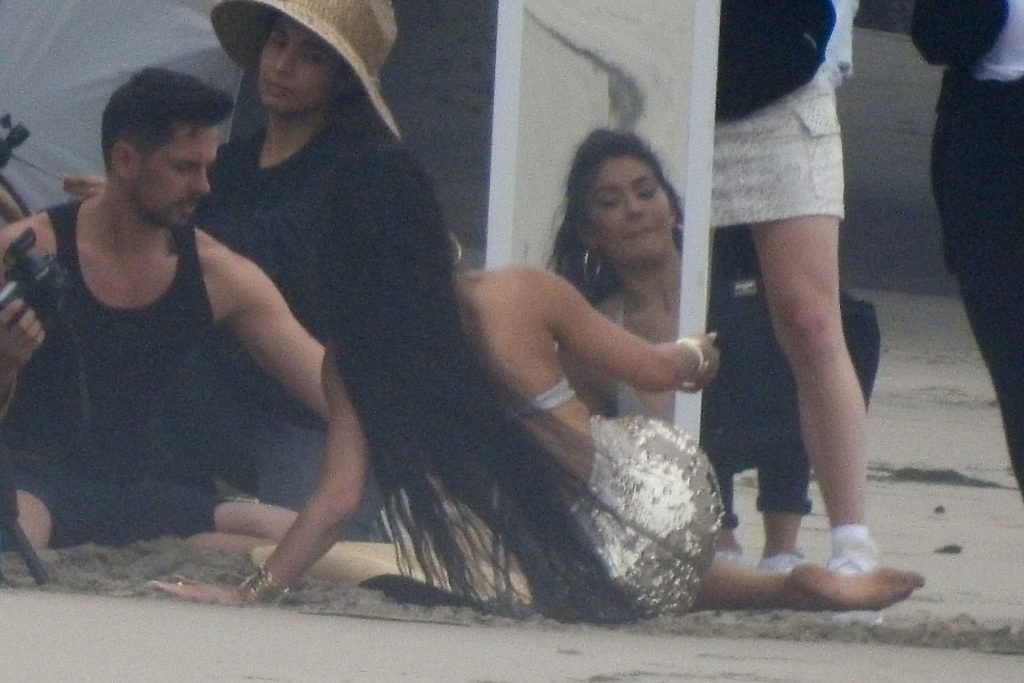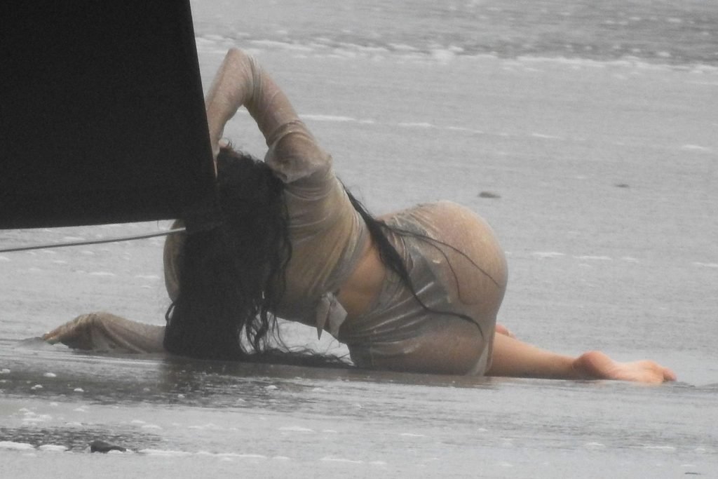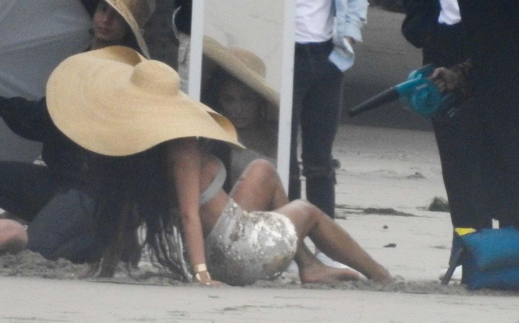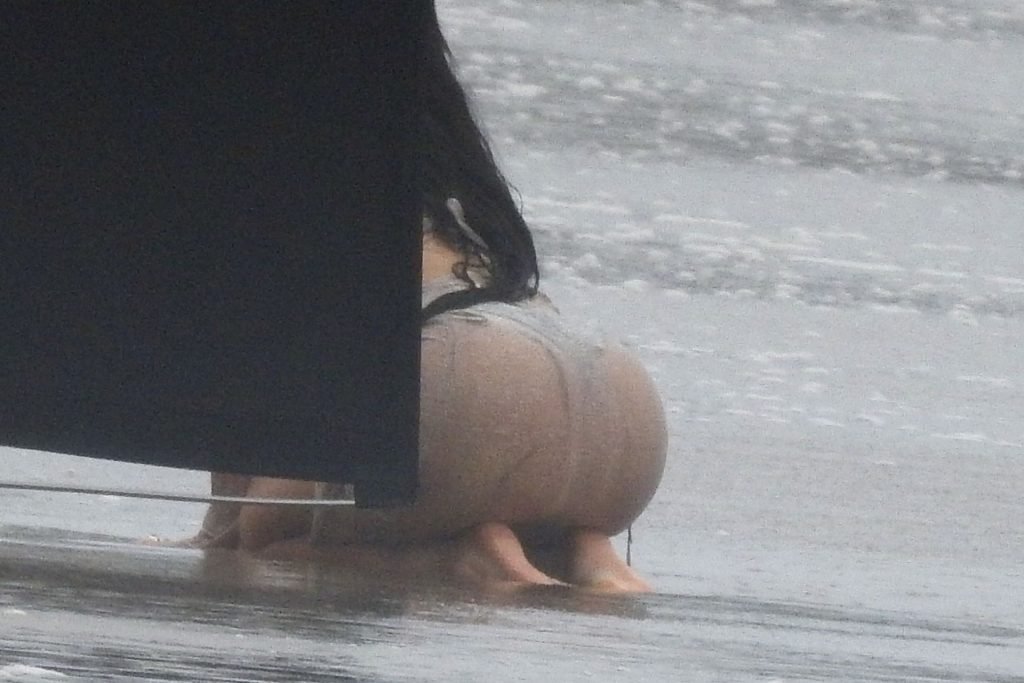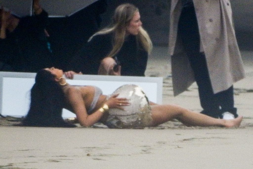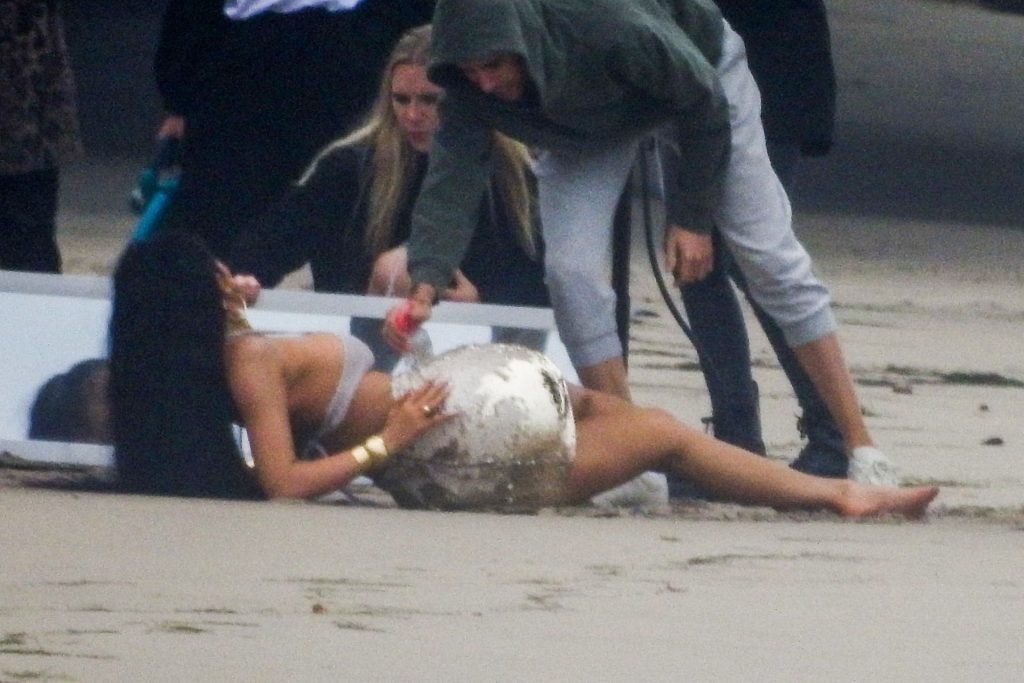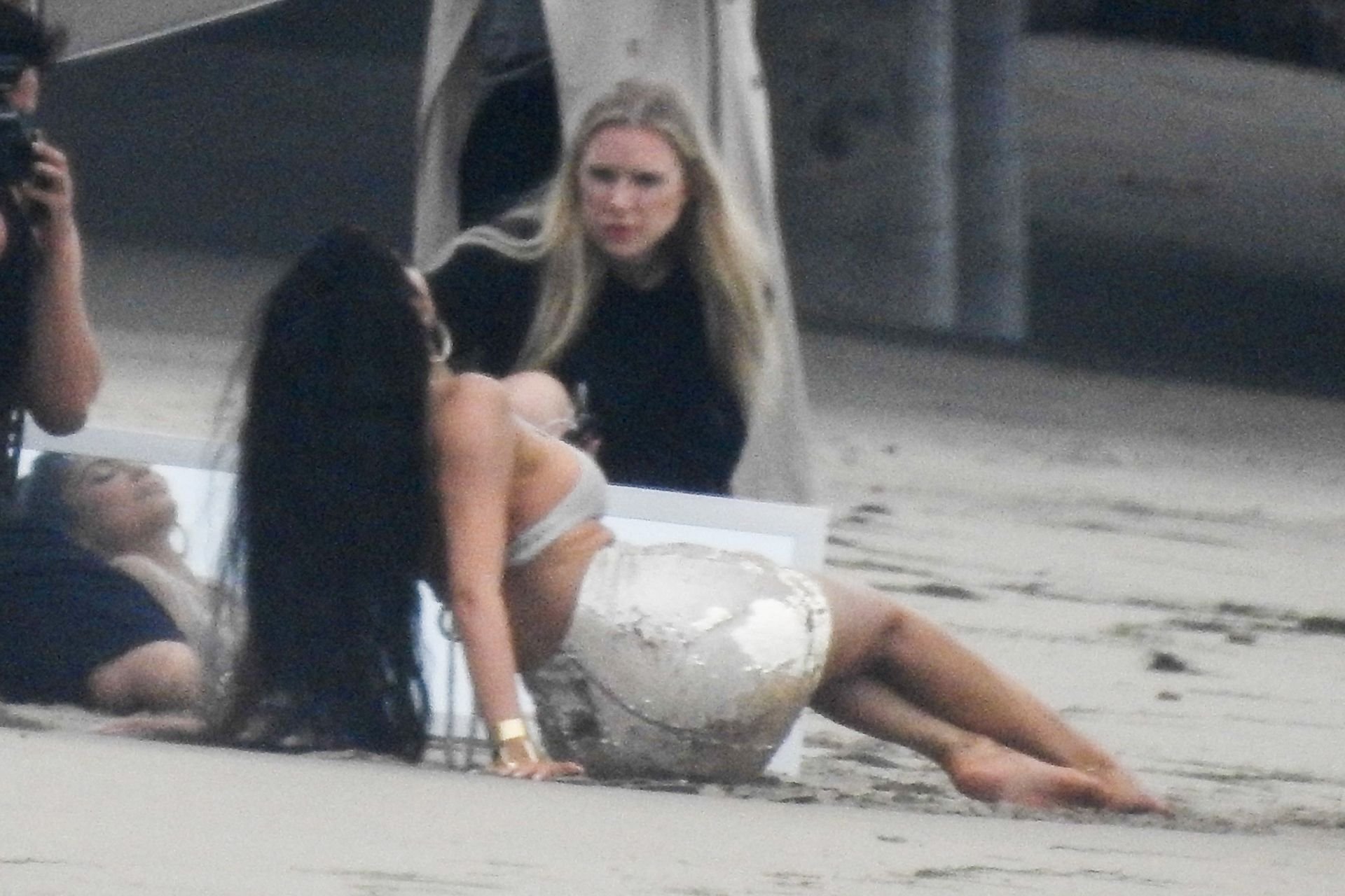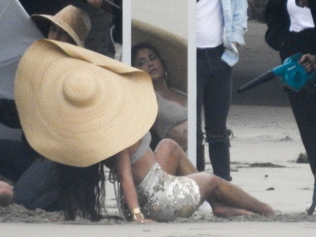 Em outro cenário, Kylie usou um top de biquíni, saia de lantejoulas e um chapéu de praia oversized enquanto posava na areia em frente a um espelho. Bastante equipe estava presente para ajudar, e um assistente sortudo teve a tarefa exaustiva de borrifá-la com uma garrafa de água, garantindo que ela tivesse a quantidade certa de água e areia grudada nas pernas.