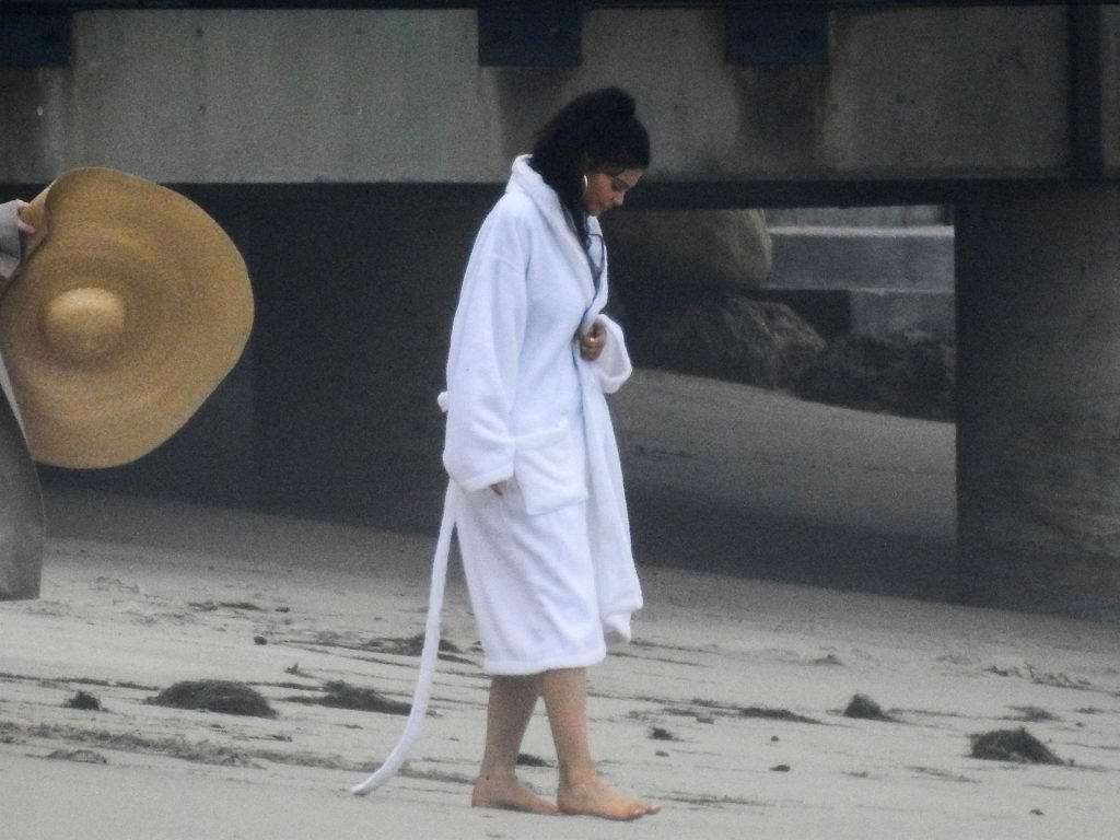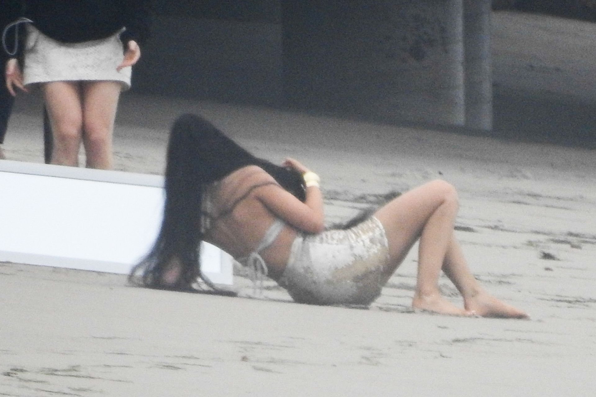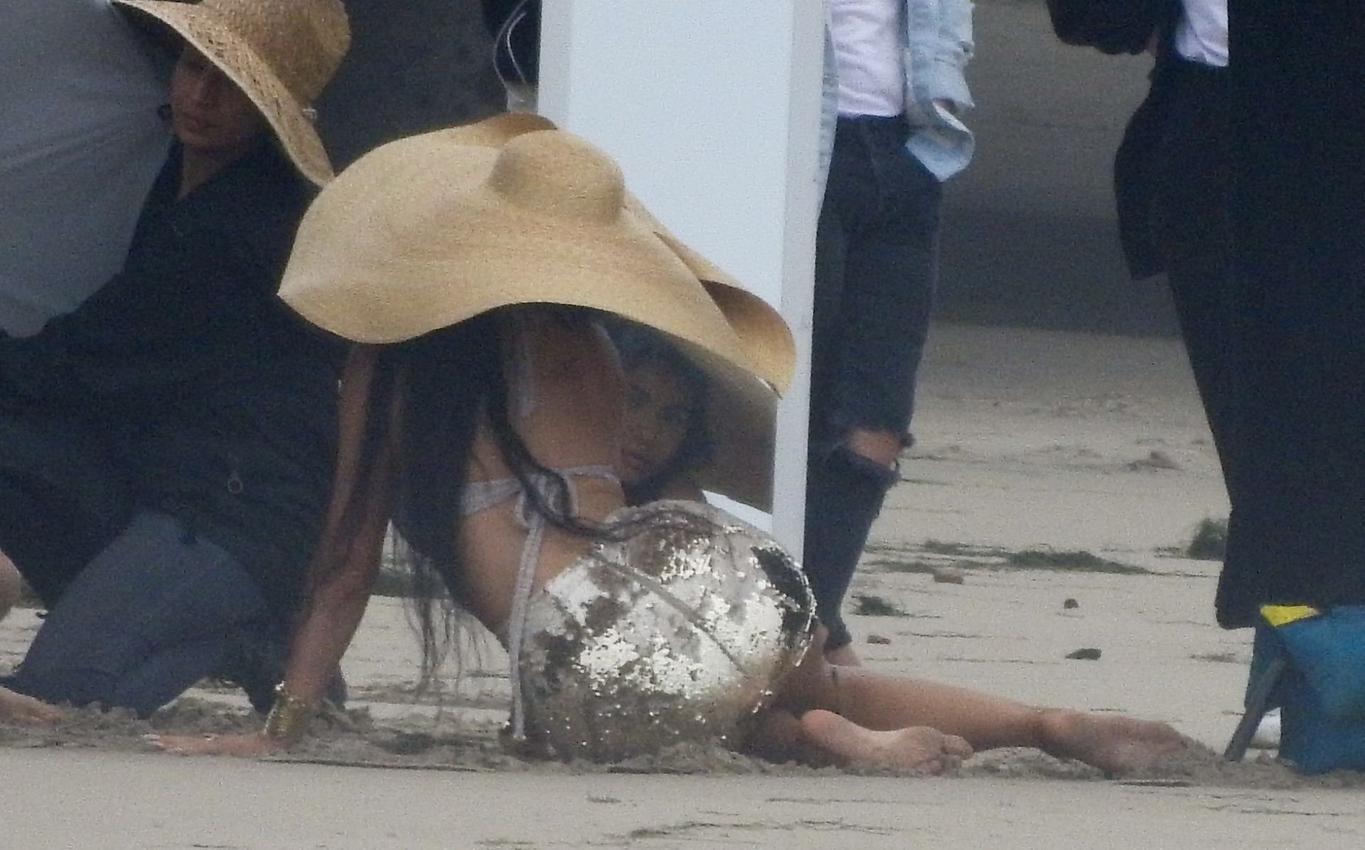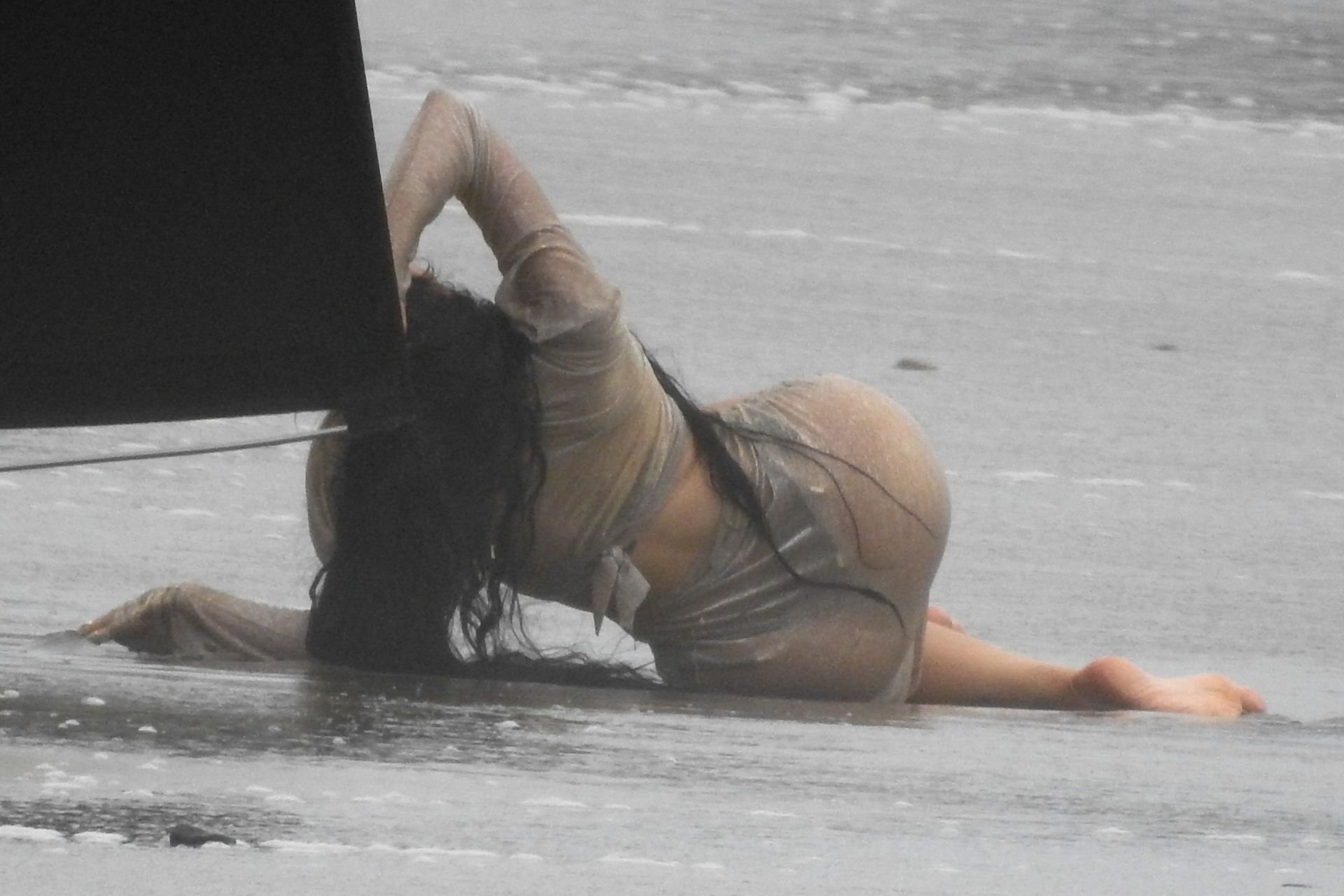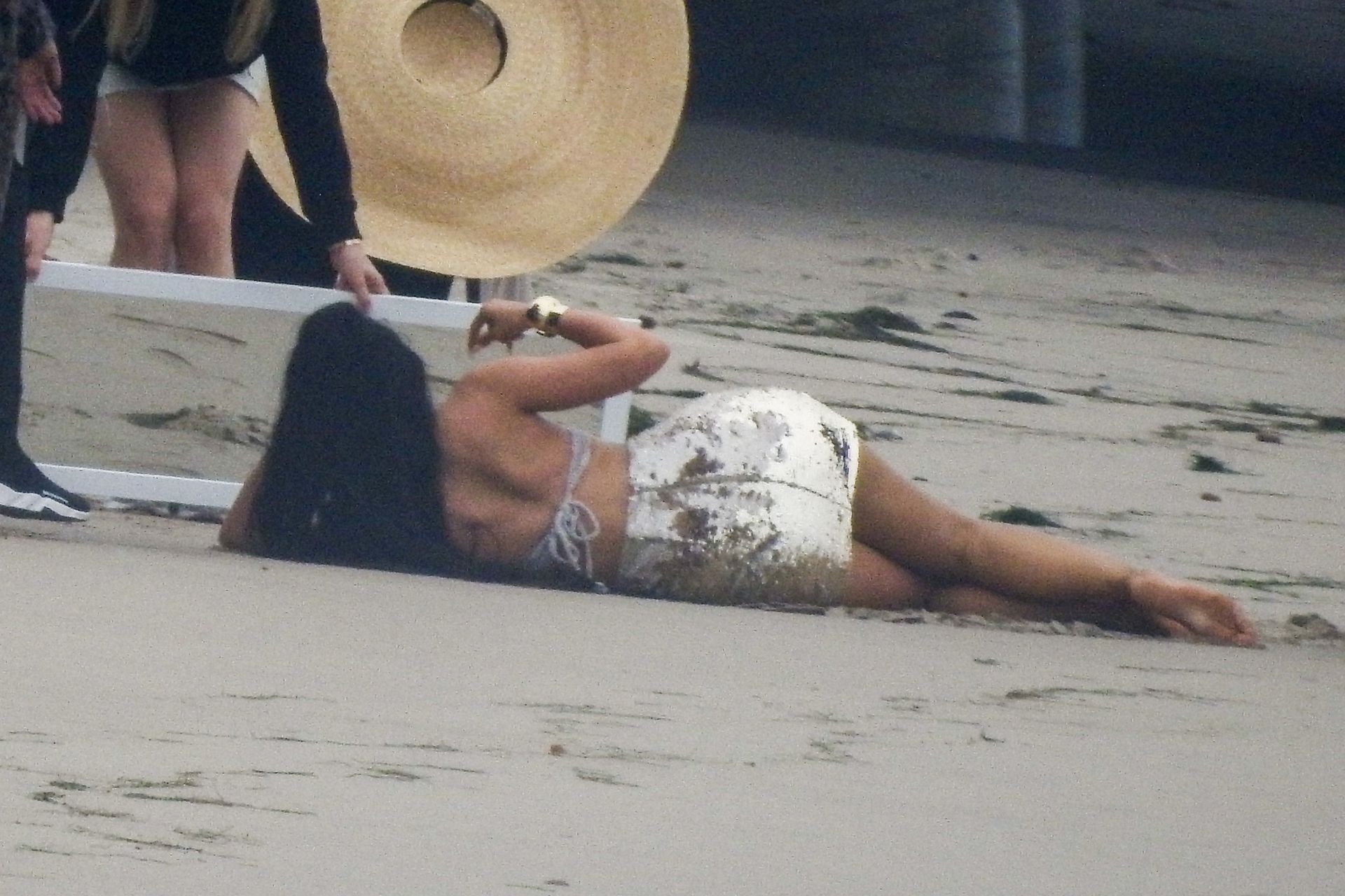 Em outro cenário, Kylie usou um top de biquíni, saia de lantejoulas e um chapéu de praia oversized enquanto posava na areia em frente a um espelho. Bastante equipe estava presente para ajudar, e um assistente sortudo teve a tarefa exaustiva de borrifá-la com uma garrafa de água, garantindo que ela tivesse a quantidade certa de água e areia grudada nas pernas.