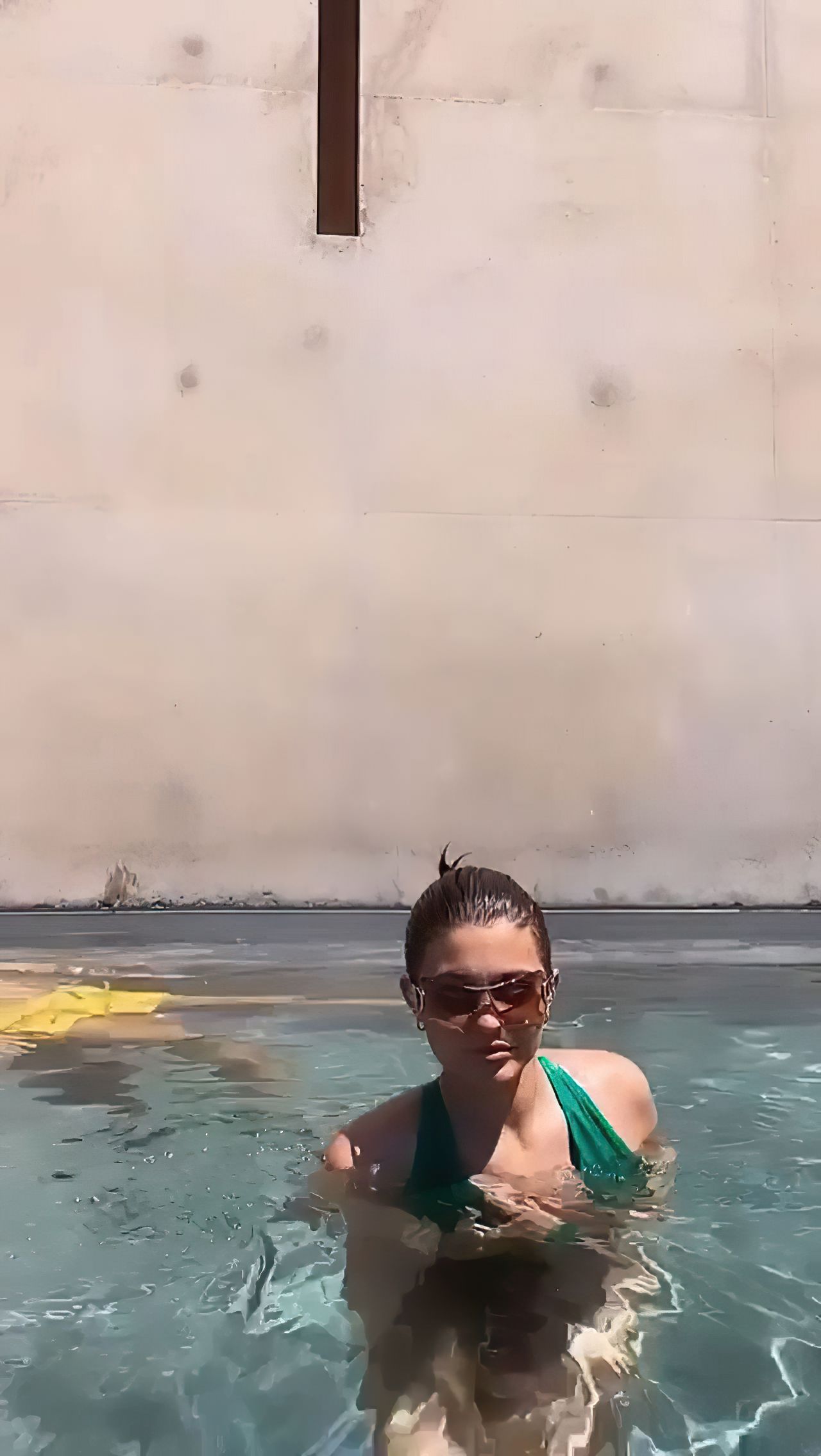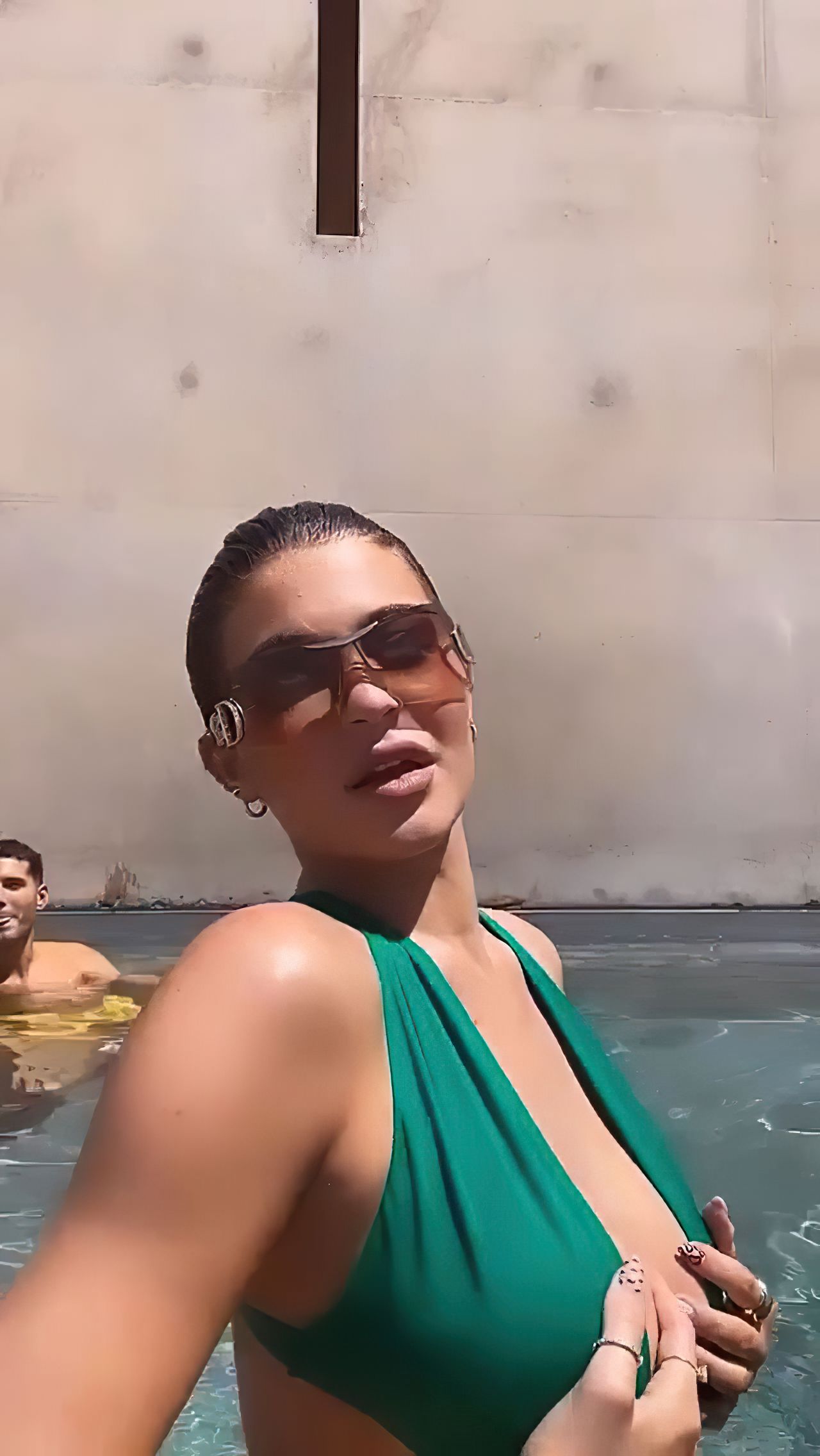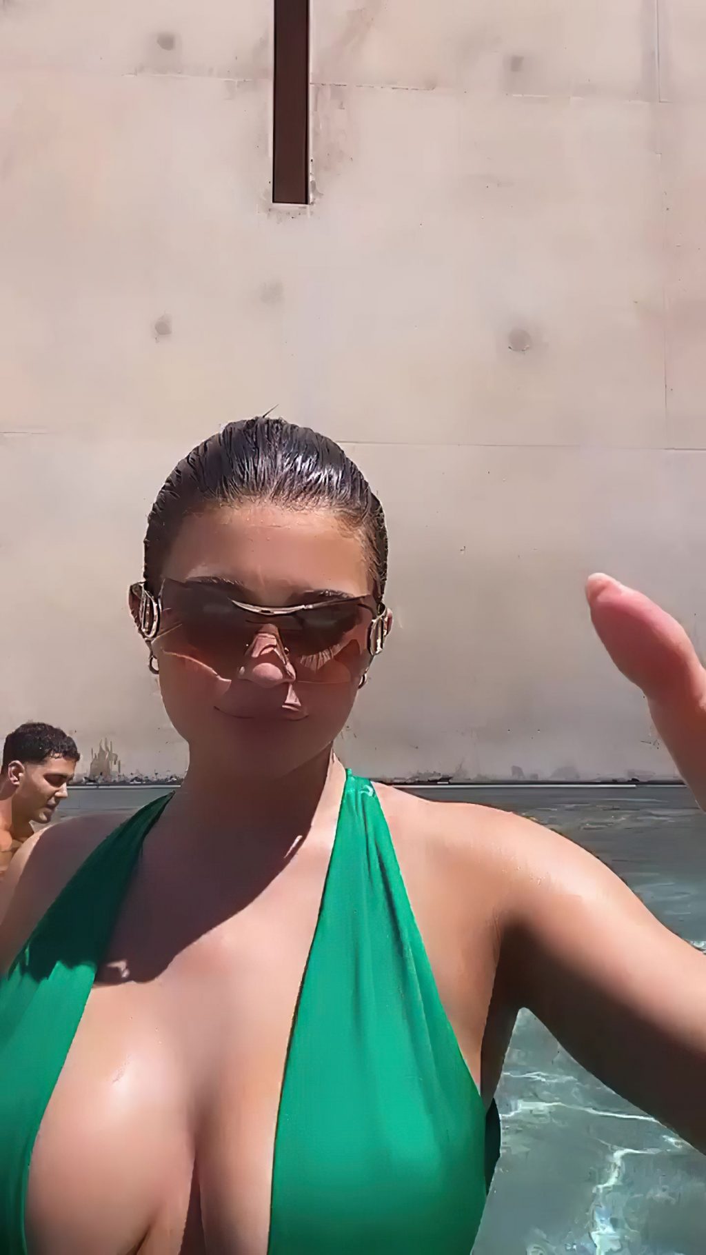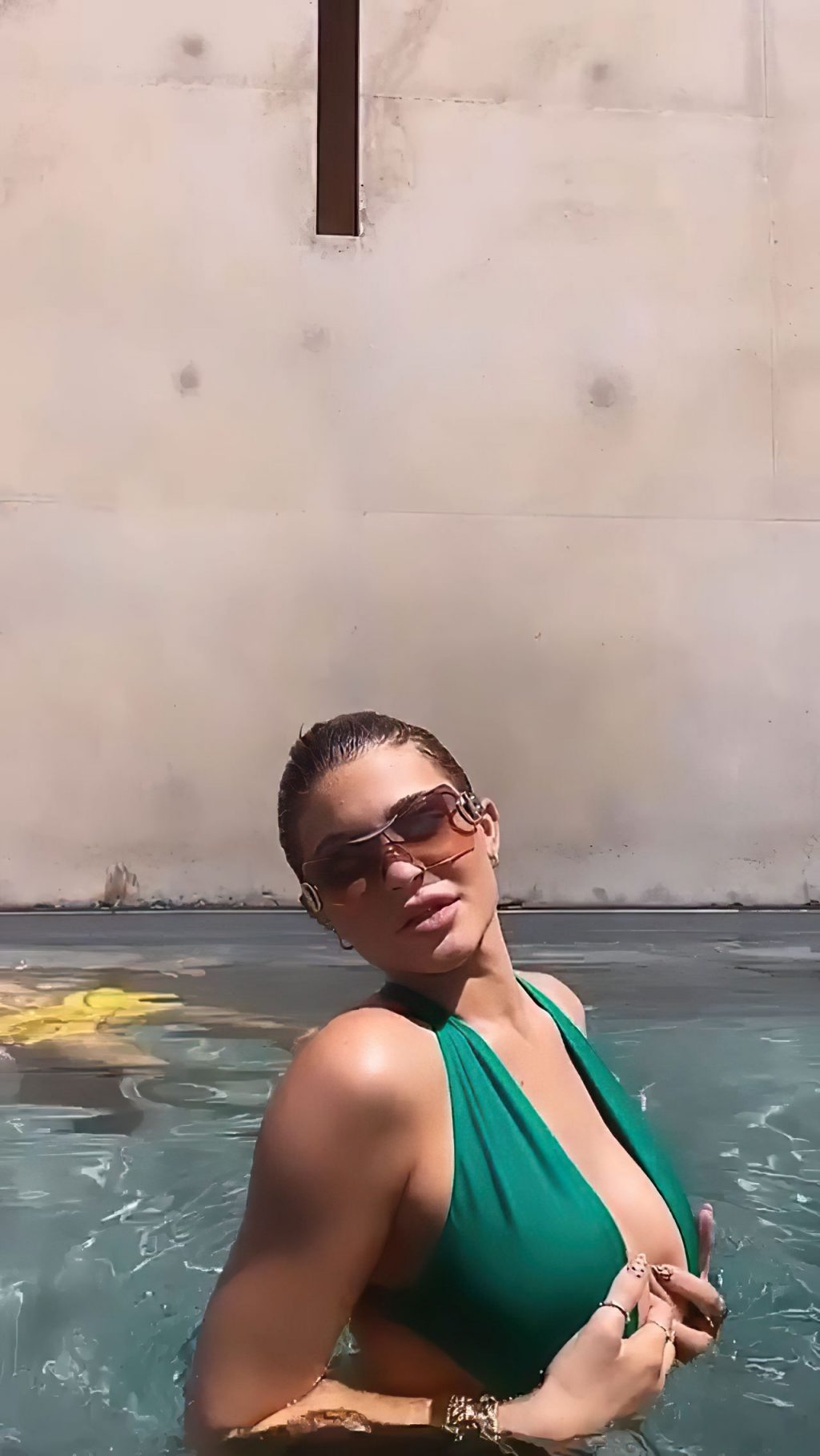 Confira as novas fotos, gifs e vídeo sexy de Kylie Jenner do Instagram, 07/07/2020. A morena exibiu seus seios posando em uma piscina com um maiô verde.
