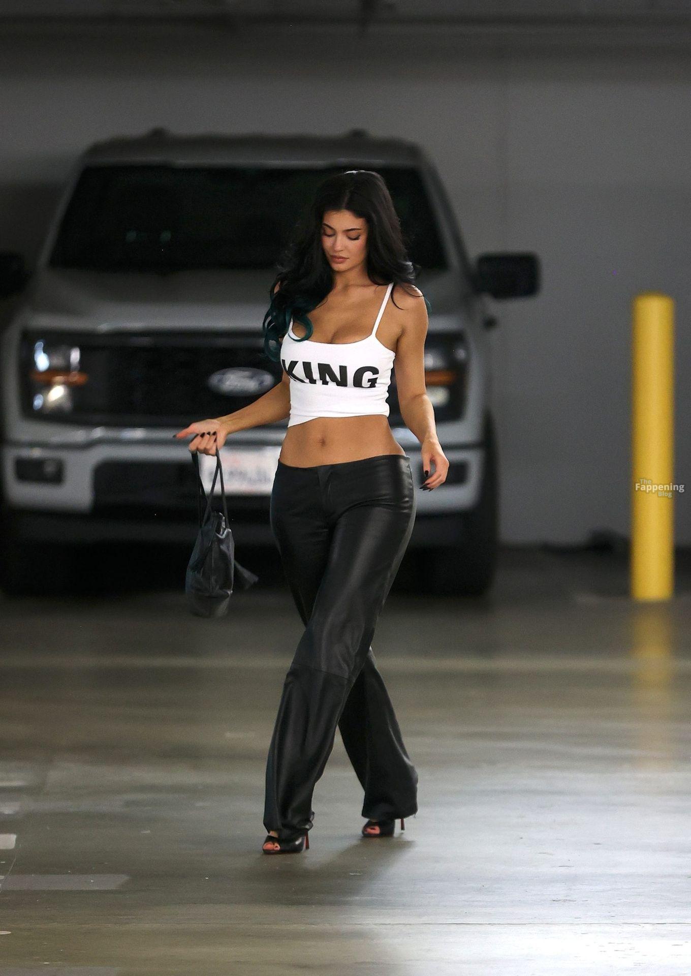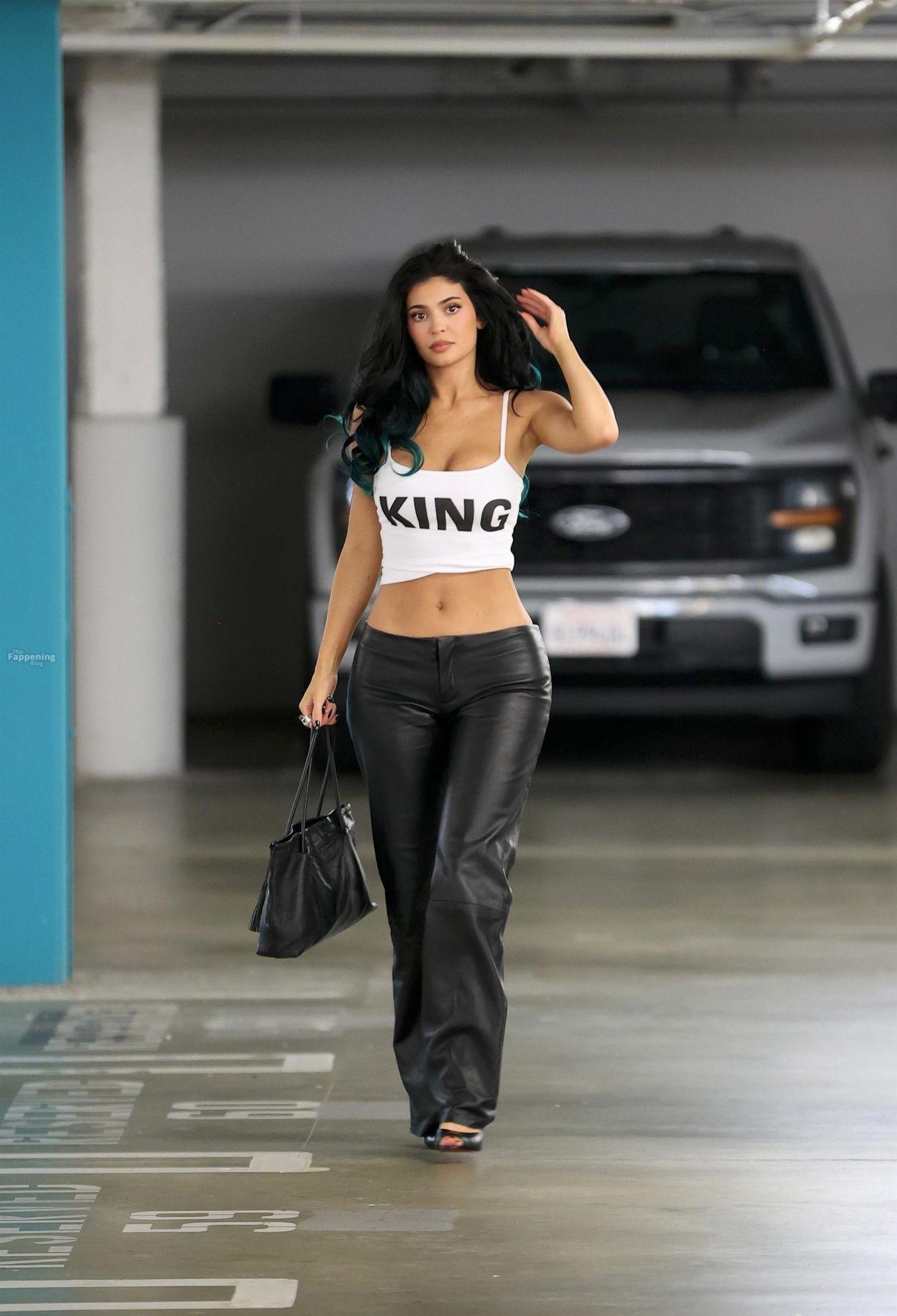 Kylie Jenner foi vista em LA, usando uma pequena blusa “KING” e calças de couro justas. Decote e abdômen estavam à mostra para todos verem.
