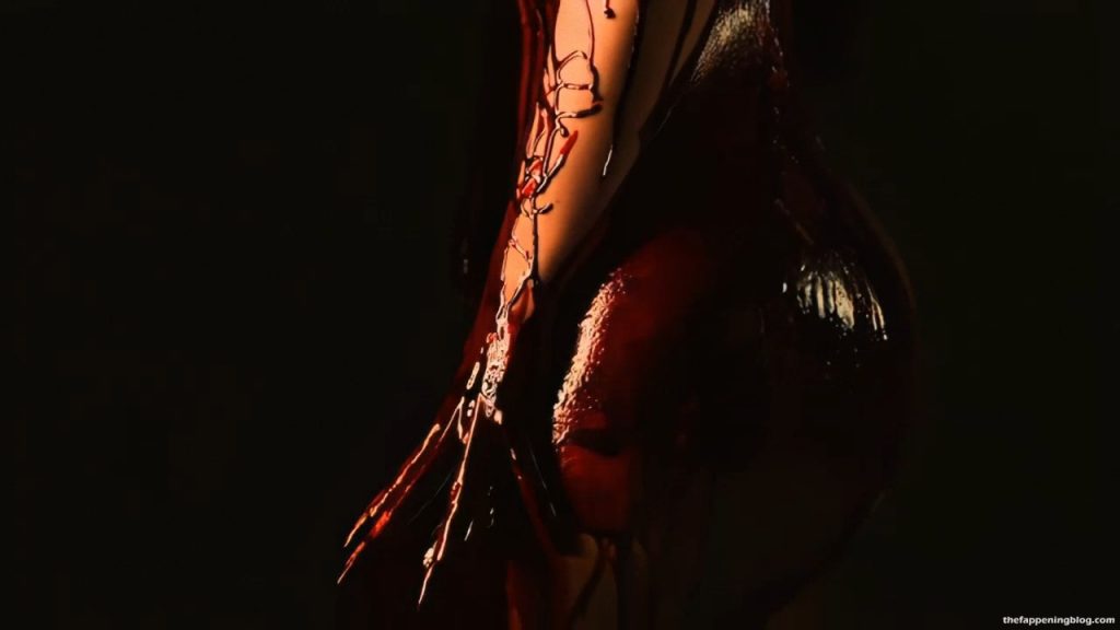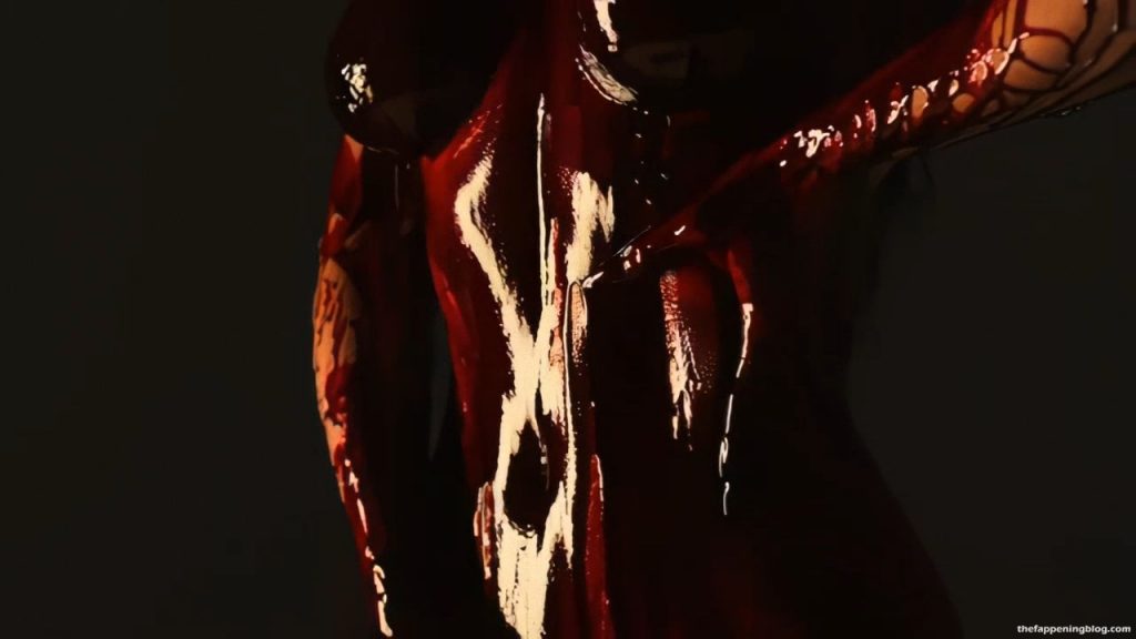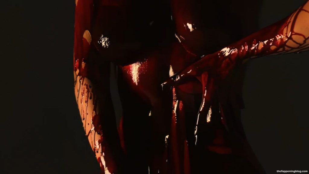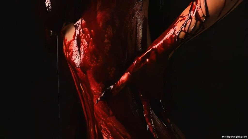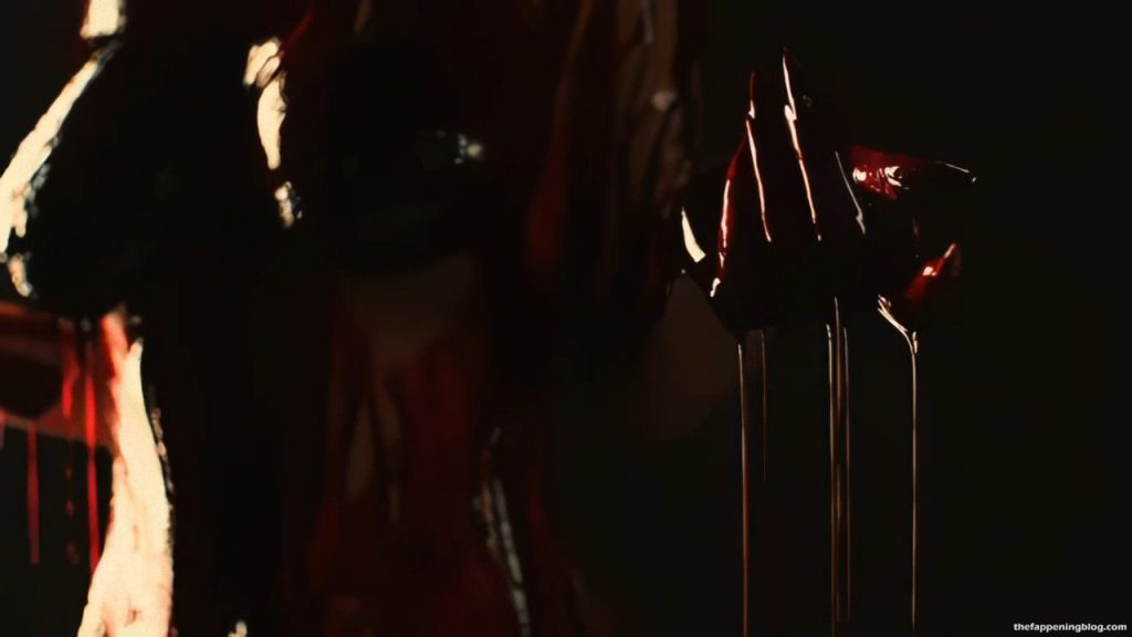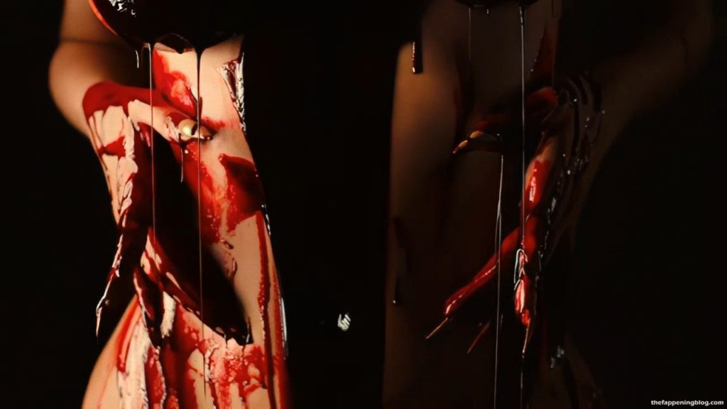 No vídeo nu nas redes sociais, Kylie Jenner apresenta sua nova linha de cosméticos inspirada em “Pesadelo na Rua Elm” no Halloween (outubro de 2021). Ela nos provoca com seus seios, posando topless com sangue falso cobrindo seu corpo nu.