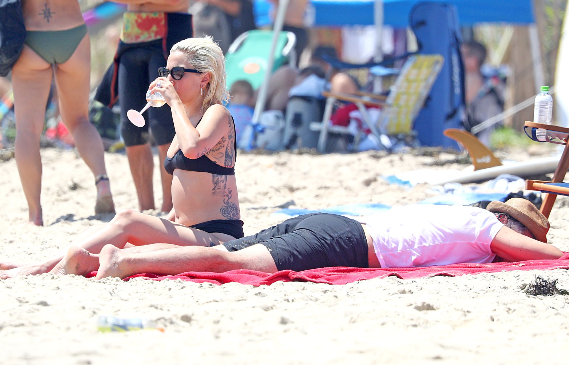 Lady Gaga e Christian Carino aumentam a temperatura na praia, 01/07/2018. A cantora de 32 anos apareceu nos Hamptons fantástica em um biquíni preto de duas peças enquanto brincava nas ondas com seu noivo, agente de talentos.