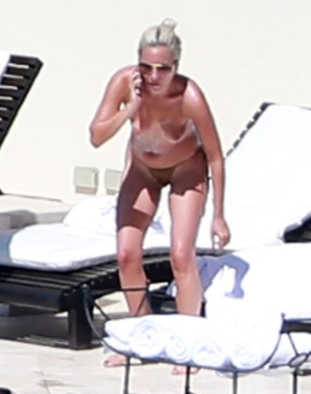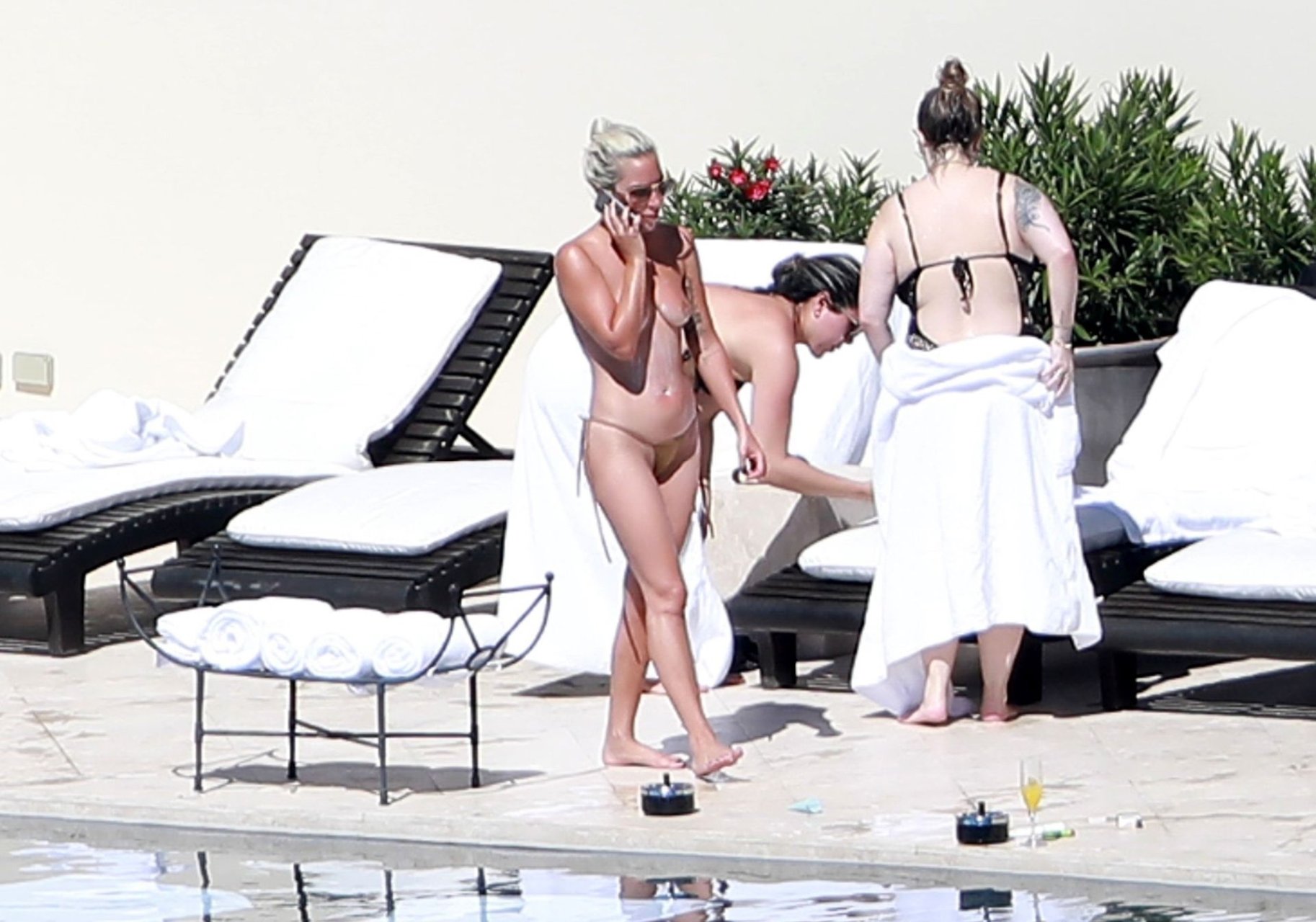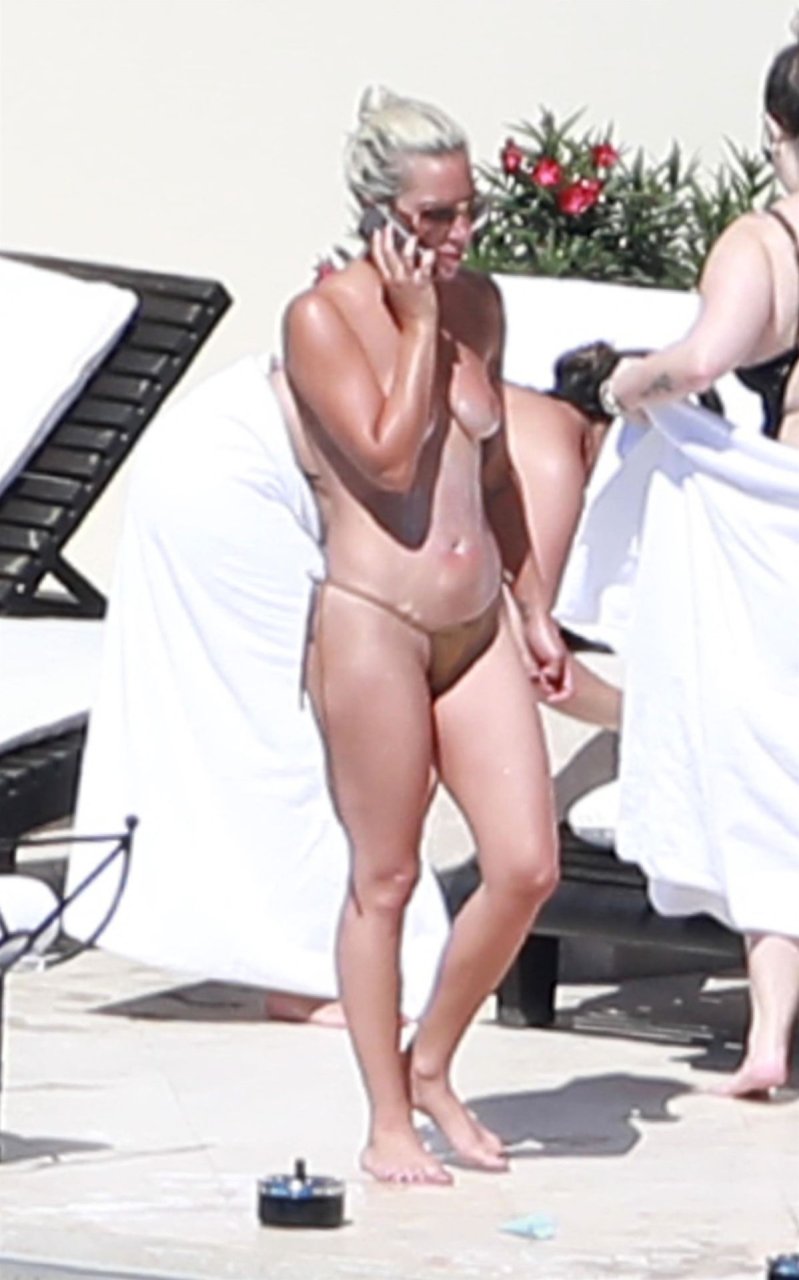 A cantora e atriz americana Lady Gaga fica topless tomando sol no México com amigos, 14/02/2019.
