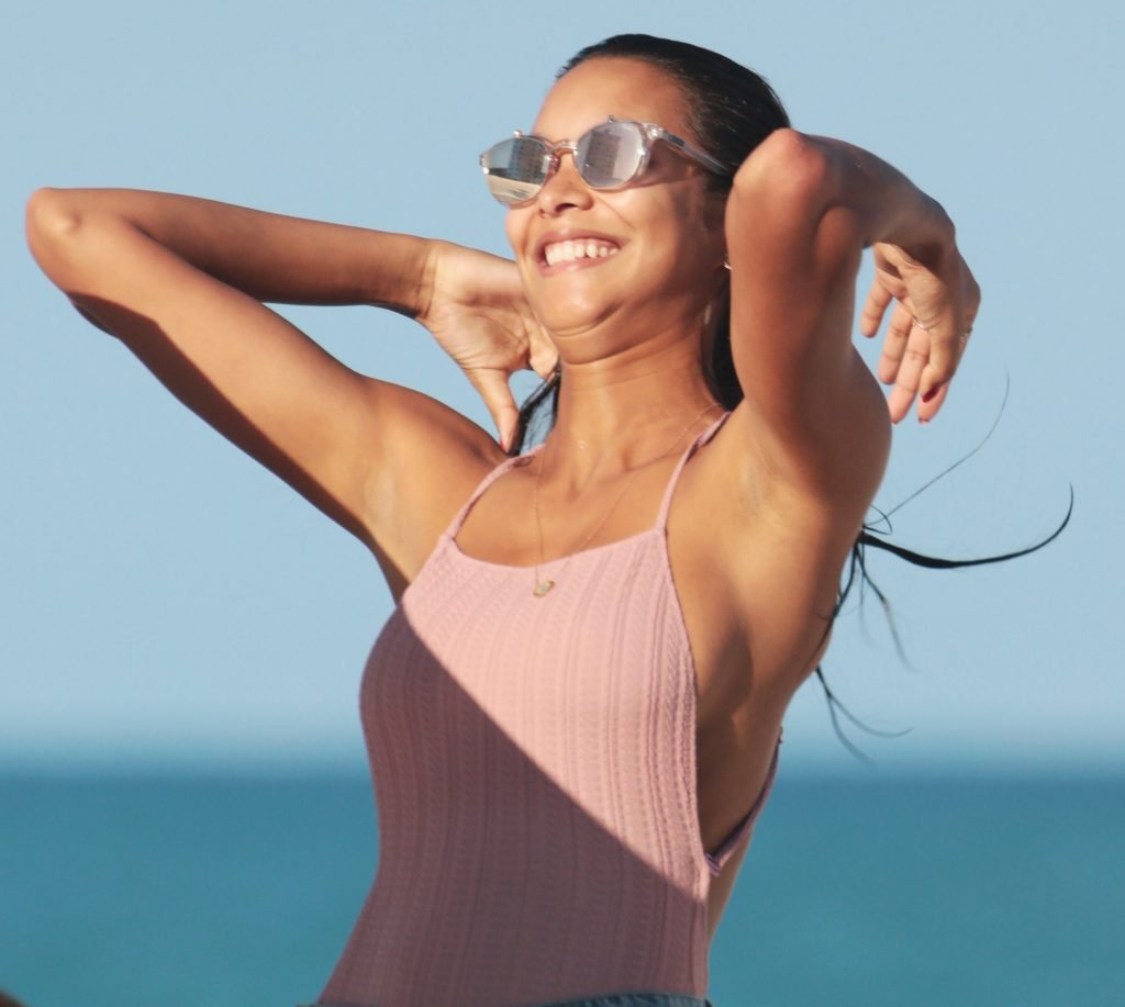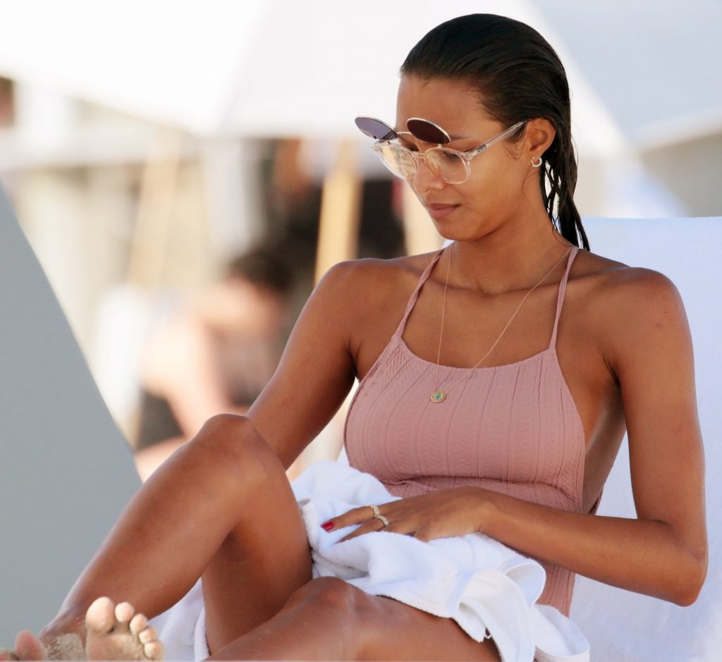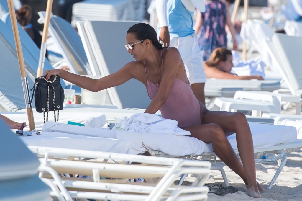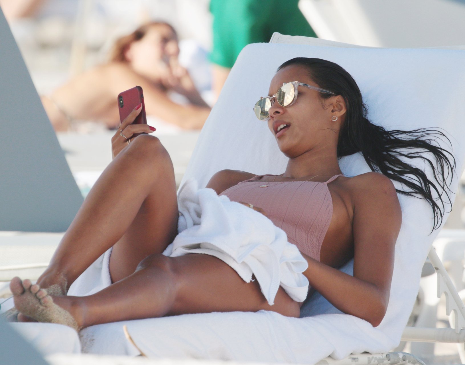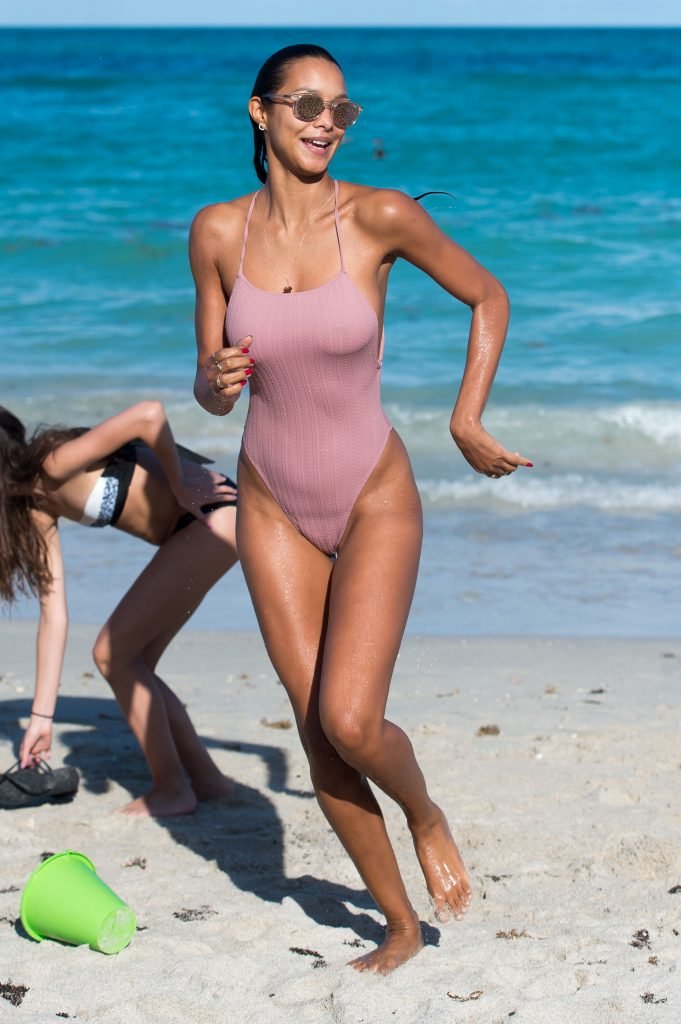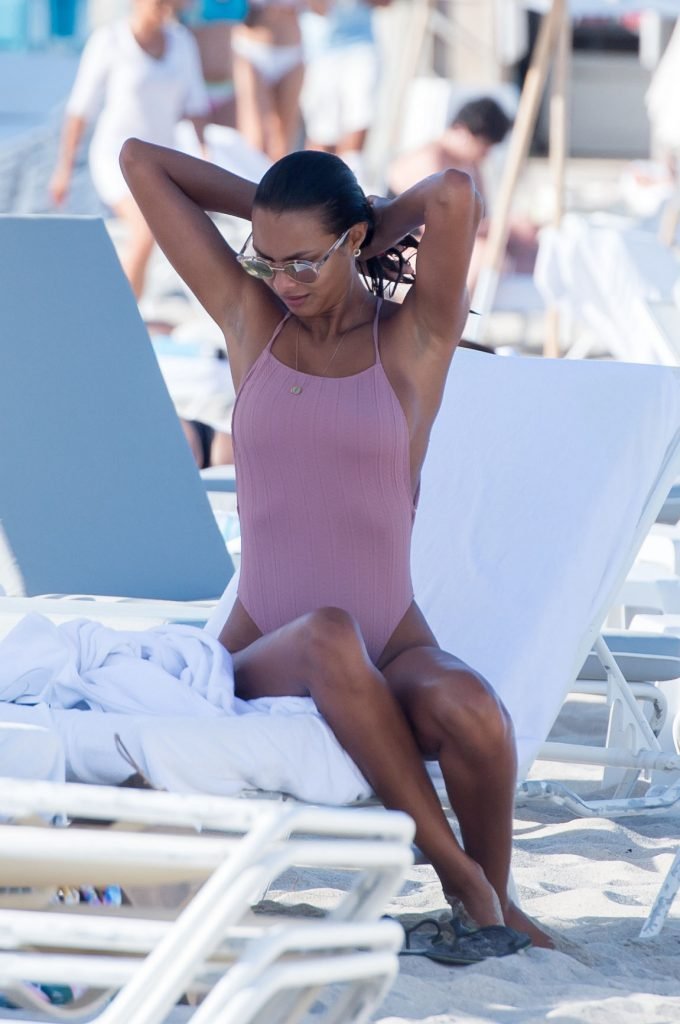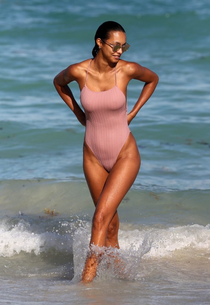 Lais Ribeiro usa um maiô rosa sexy enquanto aproveita um dia ensolarado na praia em Miami Beach, 04/04/2018. Lais Ribeiro é uma modelo, Angel da VS e atriz do Brasil. Idade – 27 anos.