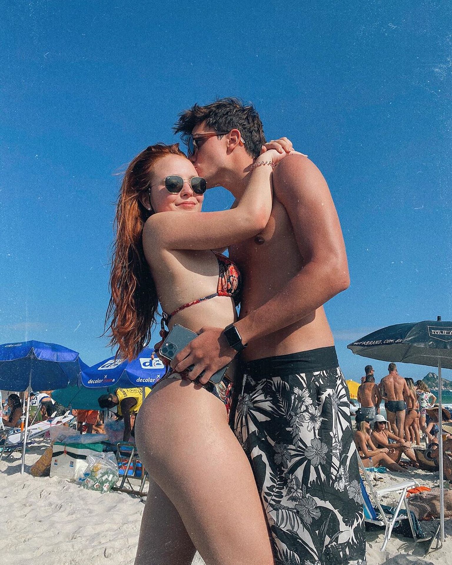 A ruiva atriz brasileira Larissa Manoela foi fotografada de biquíni na praia do Rio, mostrando seu bumbum suculento e um sorriso, 07/03/2020.