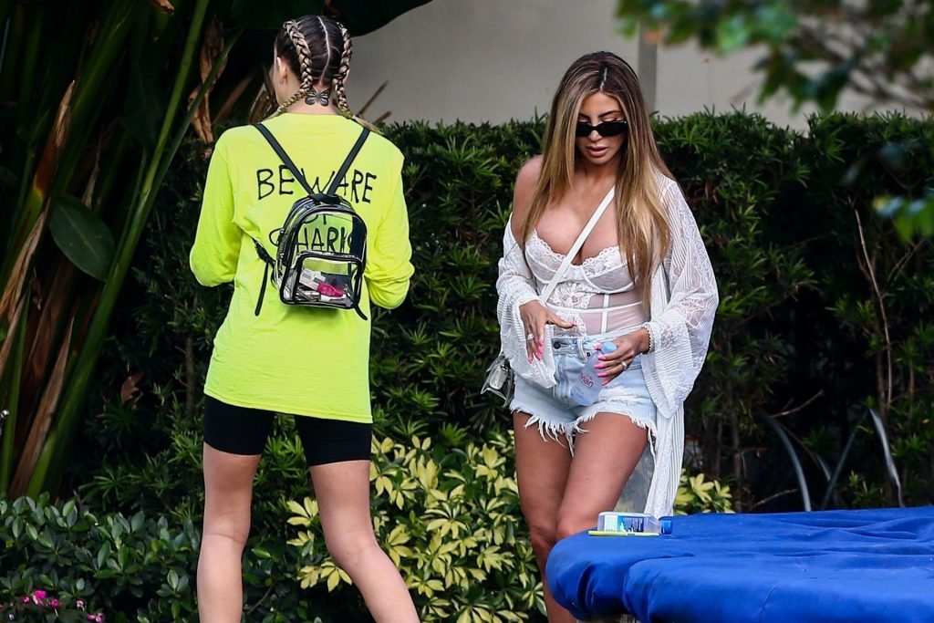 Larsa Pippen e amigos relaxam na Praia de Miami, 31/03/2019. Larsa exibe suas curvas em um biquíni de uma peça.