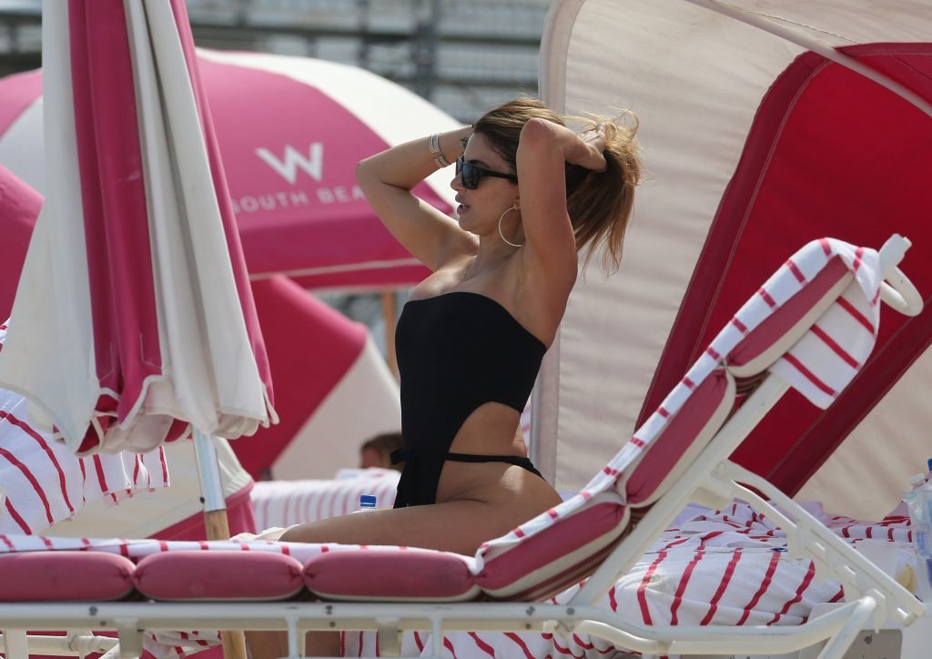 Larsa Pippen, 43, exibe seu grande bumbum em um maiô de corte muito alto na praia com amigos em Miami, 31/03/2018. Larsa Pippen é uma estrela americana de reality TV, esposa de Scottie ‘Pip’ Pippen.