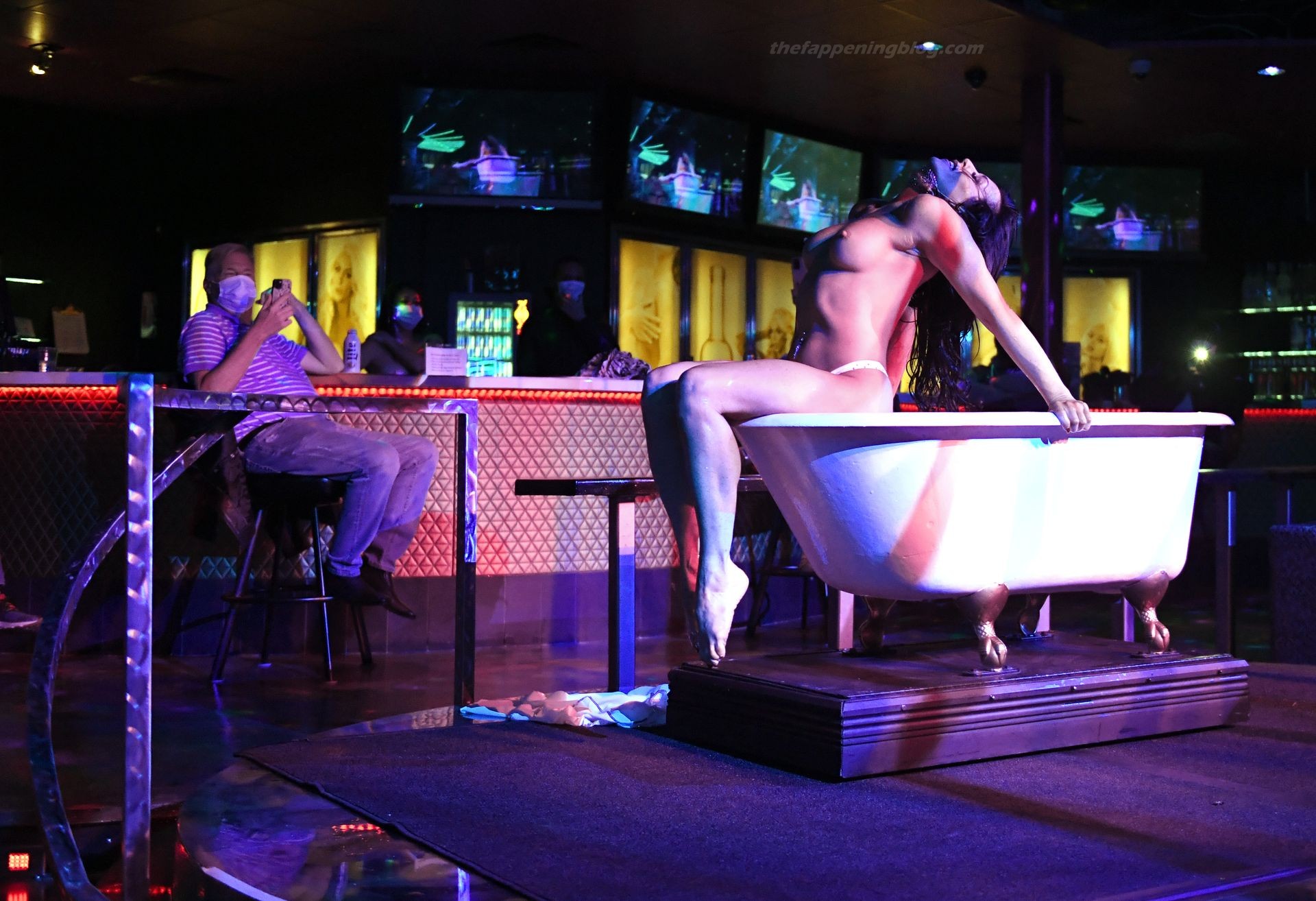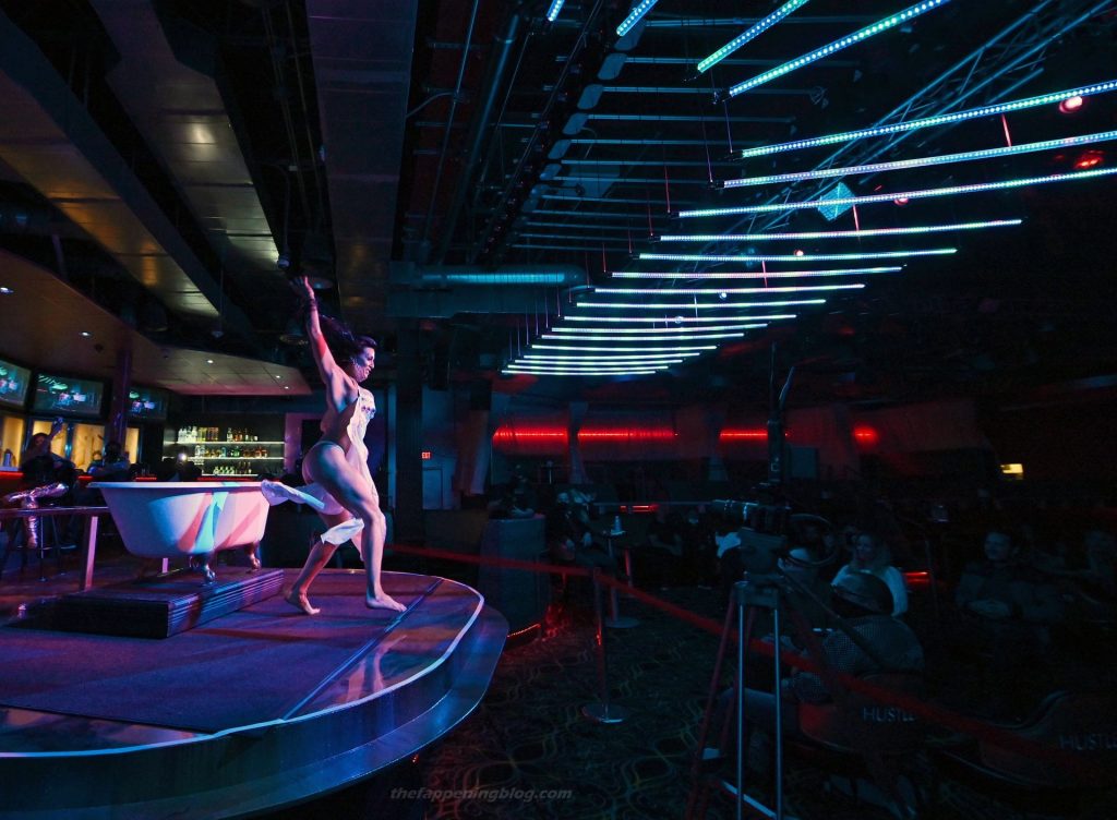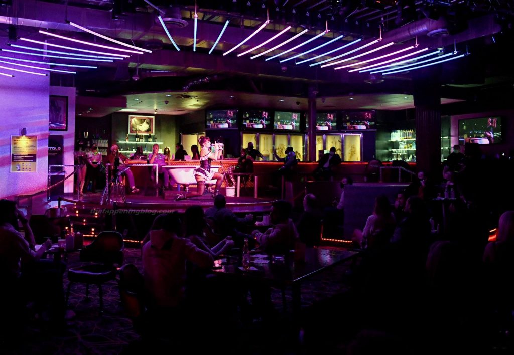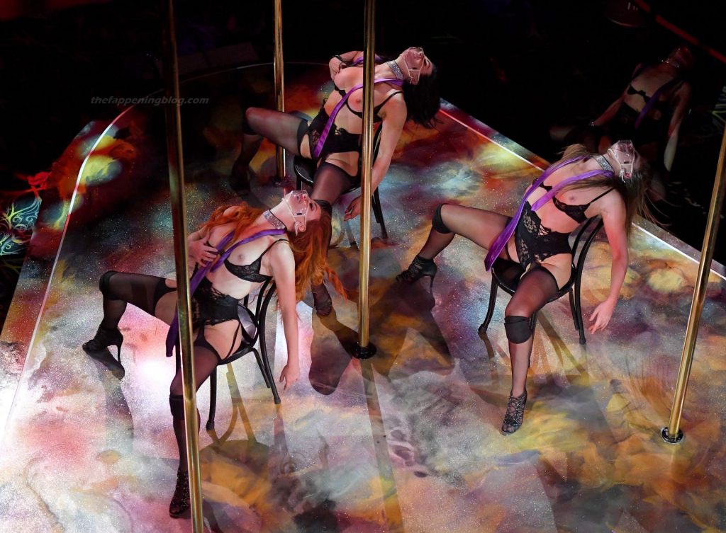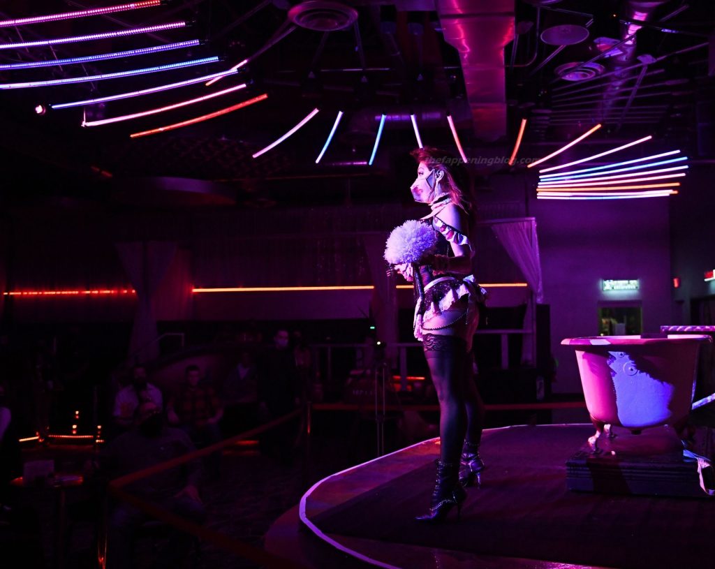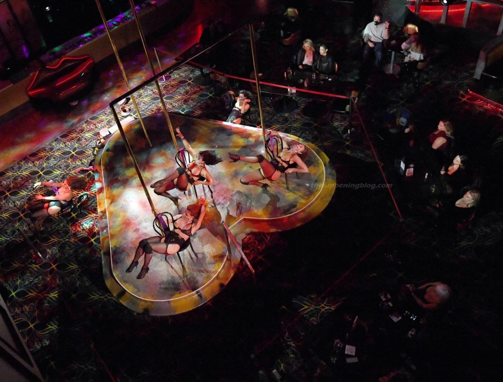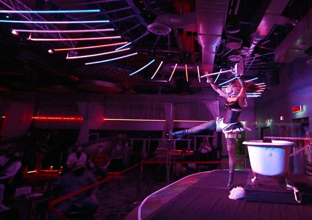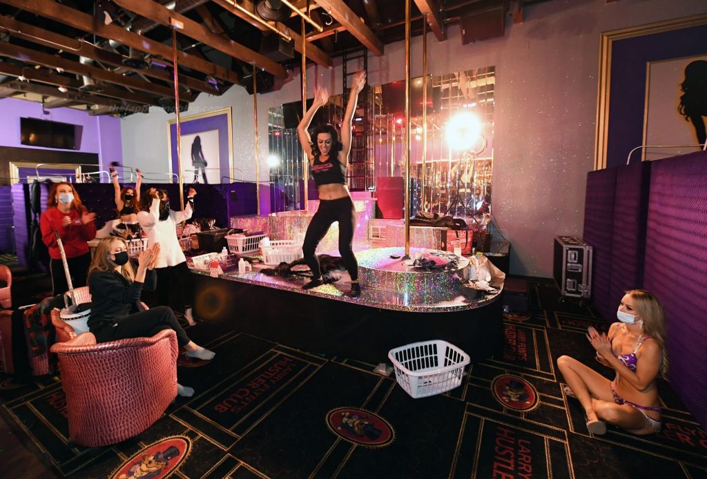 Membros do elenco Jennifer Romas, Yaisel Marino, Skylar Harris, Anne Martinez, Svetlana Ghetman, Tarian Green, Lisa Cannon, JoJo Hamner, Deena Cary dançam durante uma apresentação de “Sexxy After Dark: Onde o Jantar Encontra a Diversão” no Larry Flynt’s Hustler Club em 3 de dezembro de 2020 em Las Vegas.