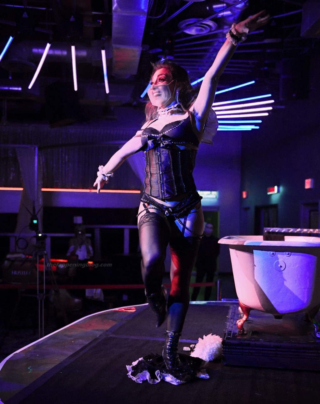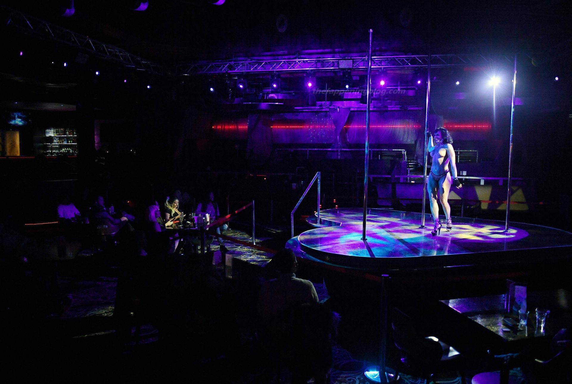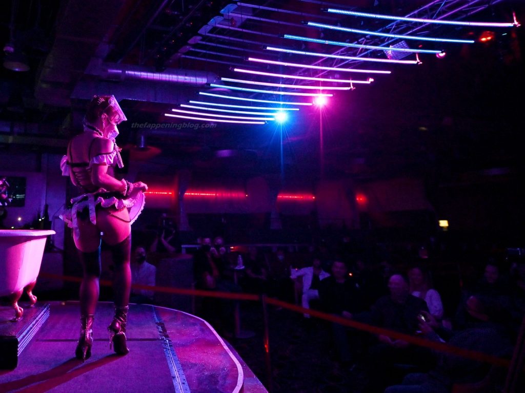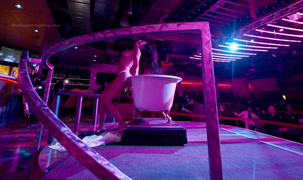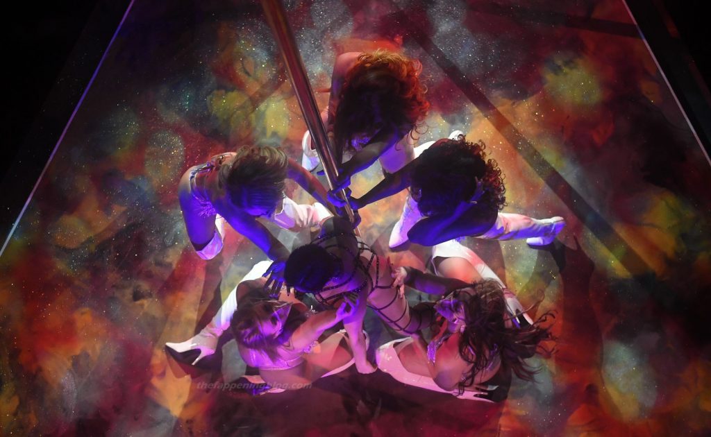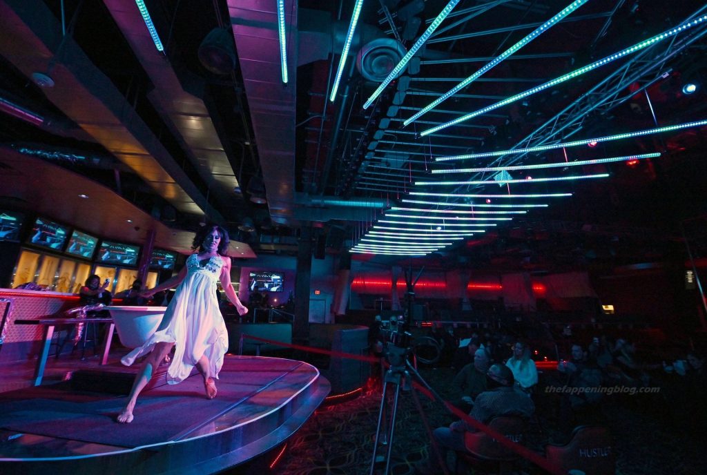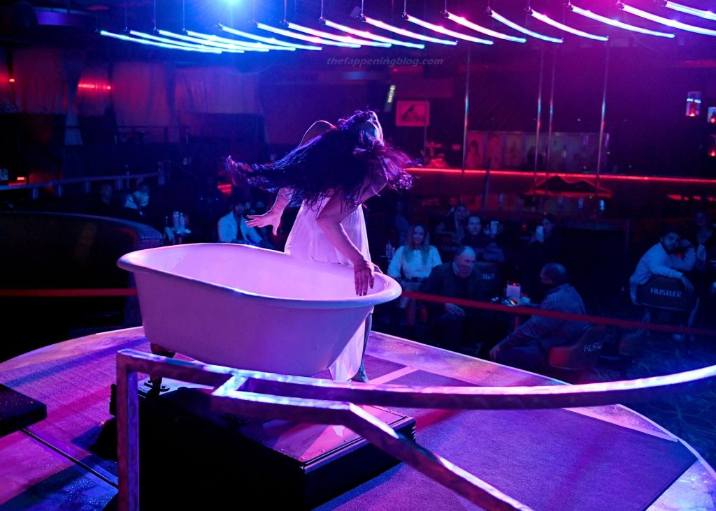 Membros do elenco Jennifer Romas, Yaisel Marino, Skylar Harris, Anne Martinez, Svetlana Ghetman, Tarian Green, Lisa Cannon, JoJo Hamner, Deena Cary dançam durante uma apresentação de “Sexxy After Dark: Onde o Jantar Encontra a Diversão” no Larry Flynt’s Hustler Club em 3 de dezembro de 2020 em Las Vegas.
