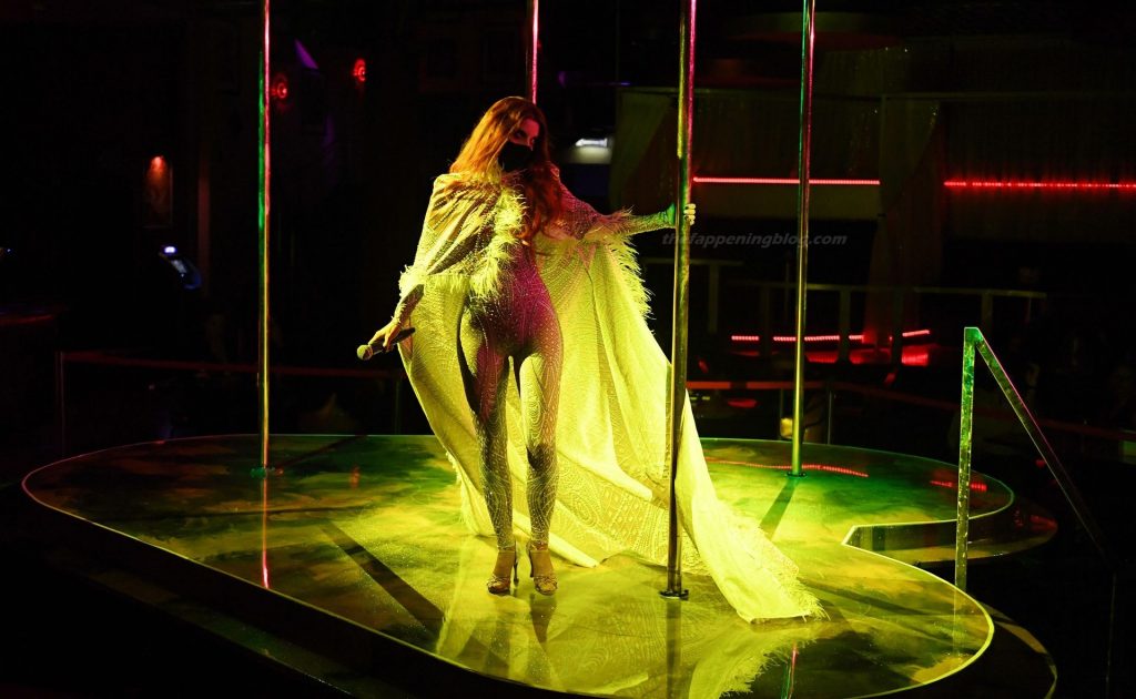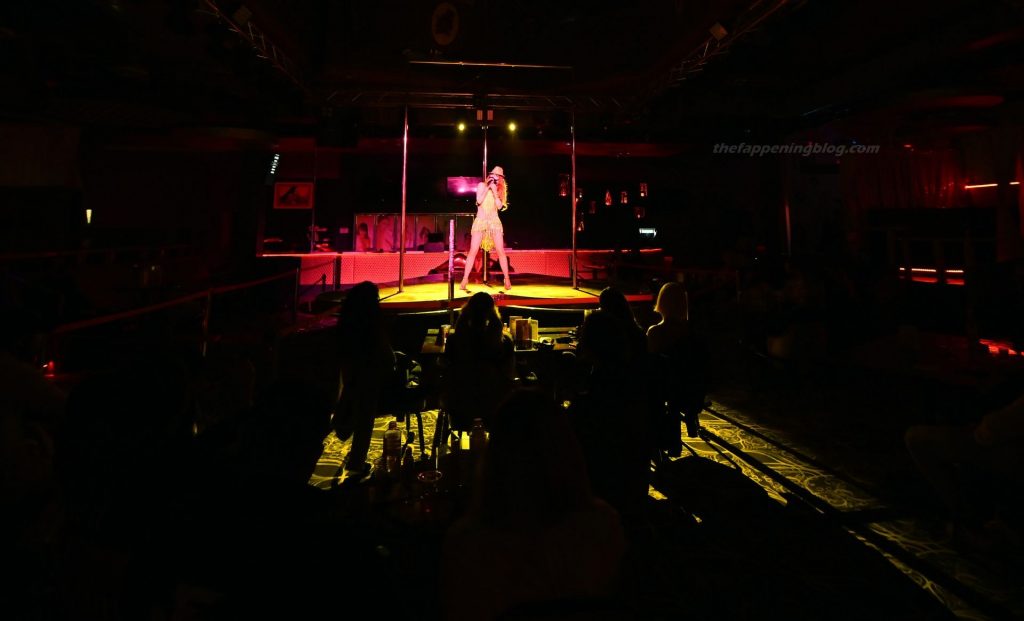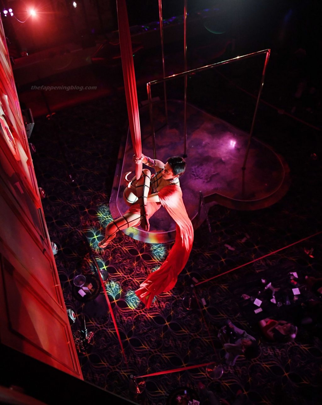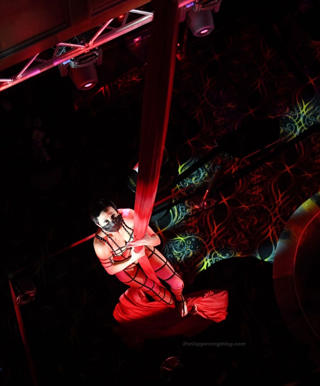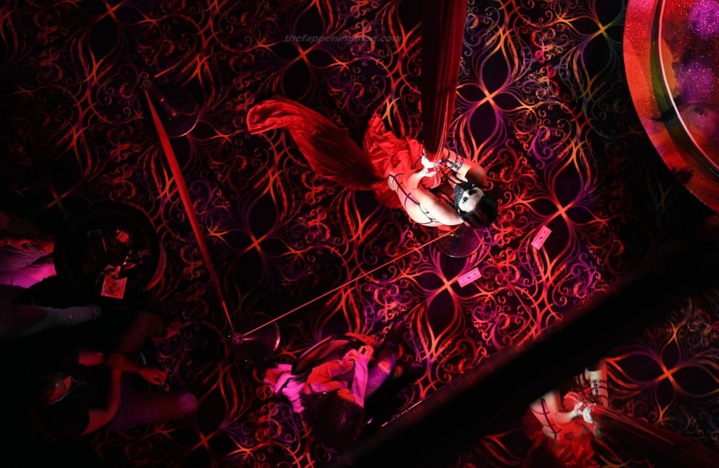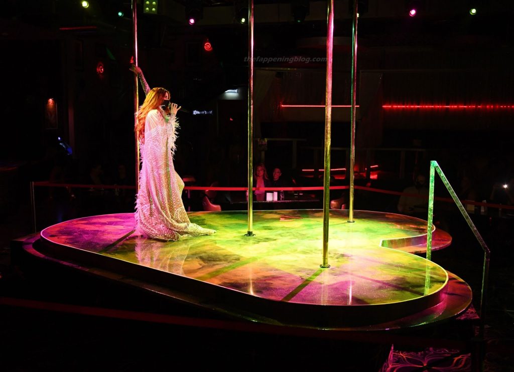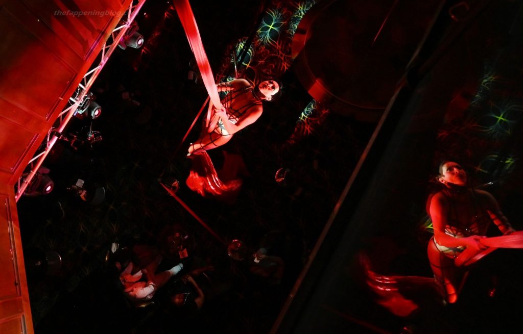 Membros do elenco Jennifer Romas, Yaisel Marino, Skylar Harris, Anne Martinez, Svetlana Ghetman, Tarian Green, Lisa Cannon, JoJo Hamner, Deena Cary dançam durante uma apresentação de “Sexxy After Dark: Onde o Jantar Encontra a Diversão” no Larry Flynt’s Hustler Club em 3 de dezembro de 2020 em Las Vegas.