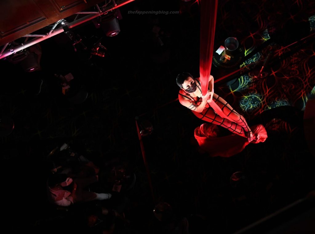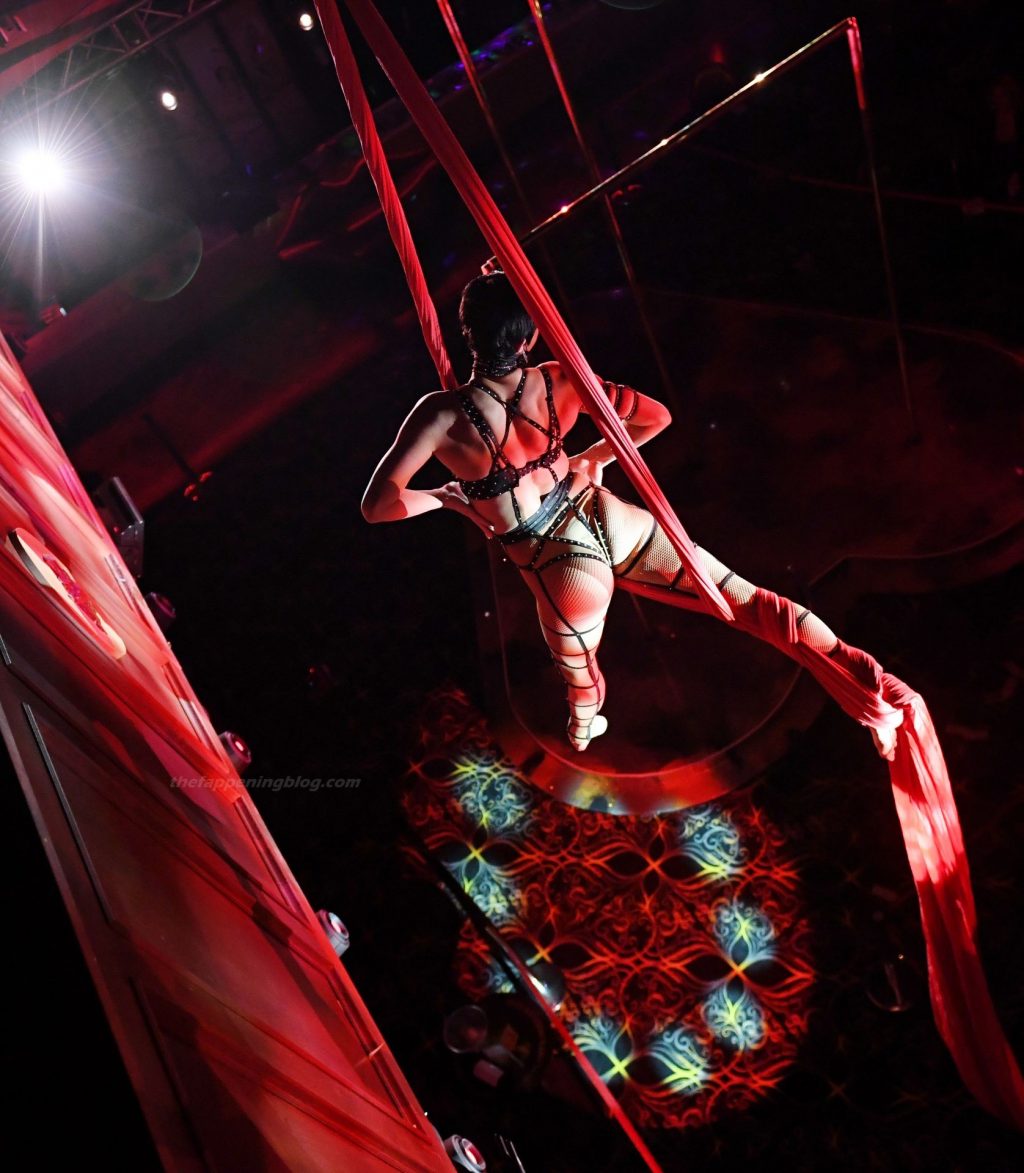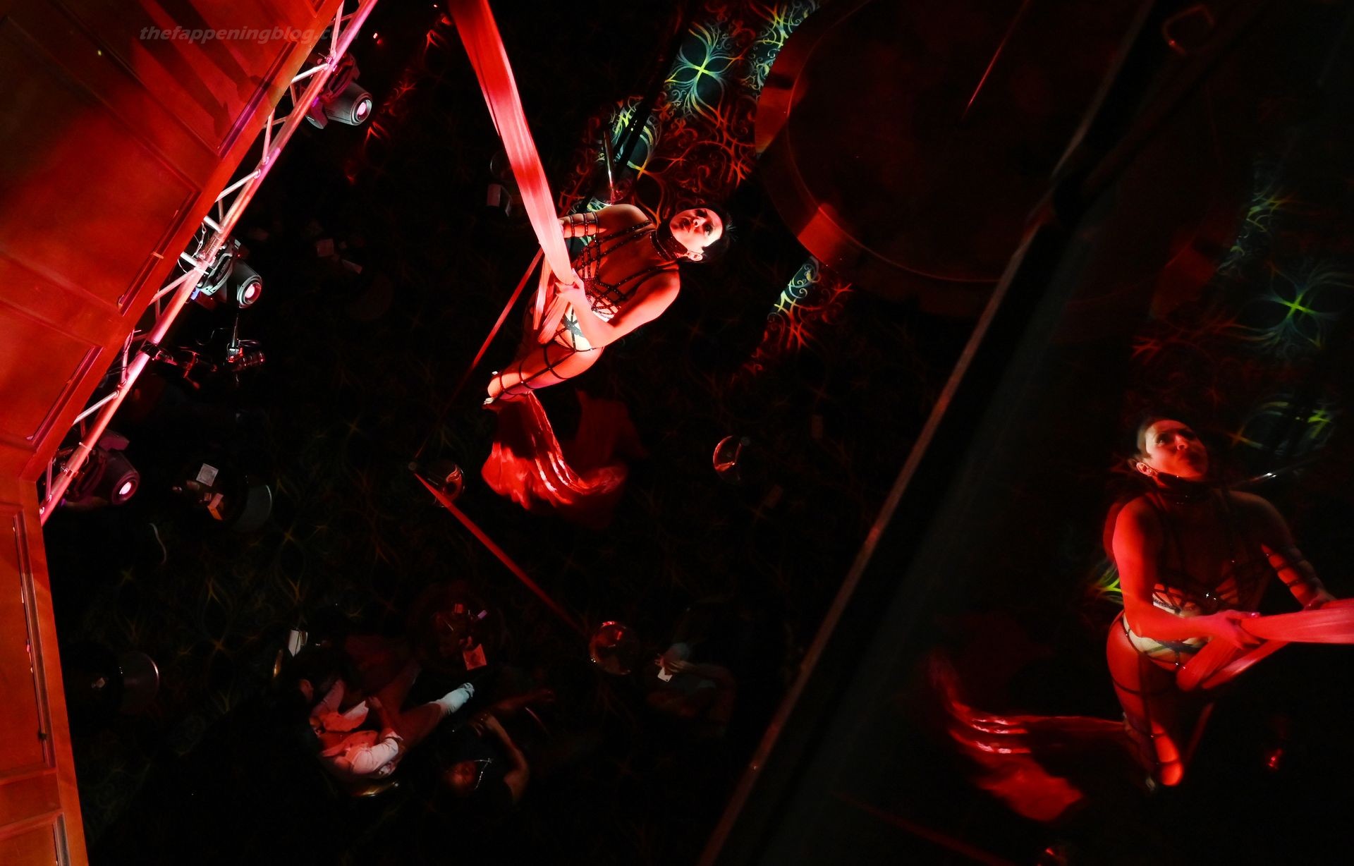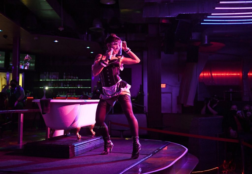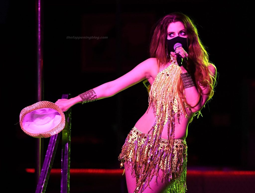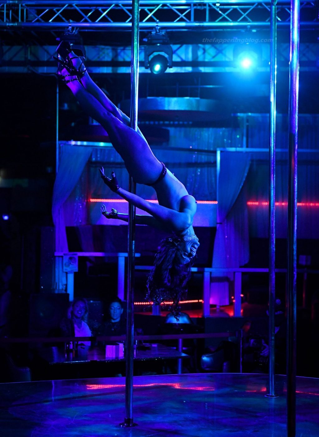 Membros do elenco Jennifer Romas, Yaisel Marino, Skylar Harris, Anne Martinez, Svetlana Ghetman, Tarian Green, Lisa Cannon, JoJo Hamner, Deena Cary dançam durante uma apresentação de “Sexxy After Dark: Onde o Jantar Encontra a Diversão” no Larry Flynt’s Hustler Club em 3 de dezembro de 2020 em Las Vegas.