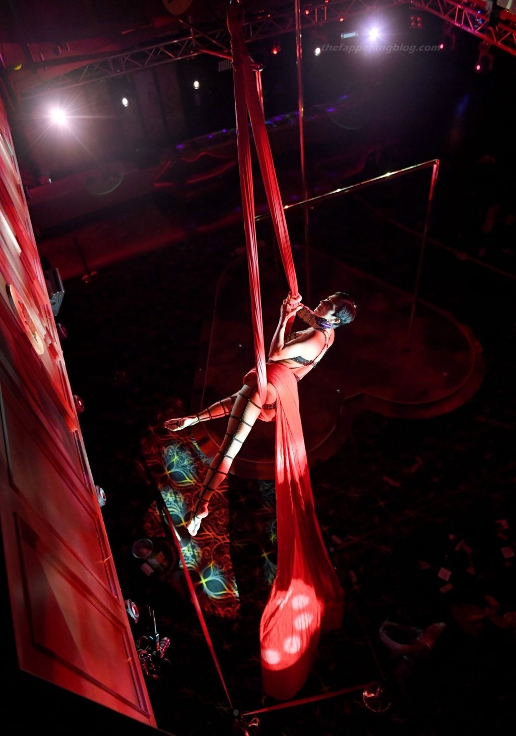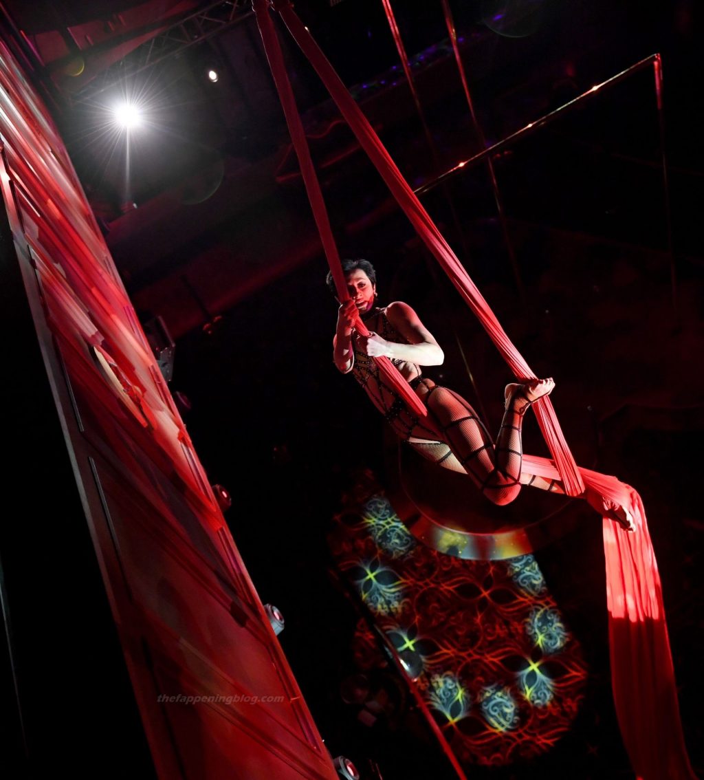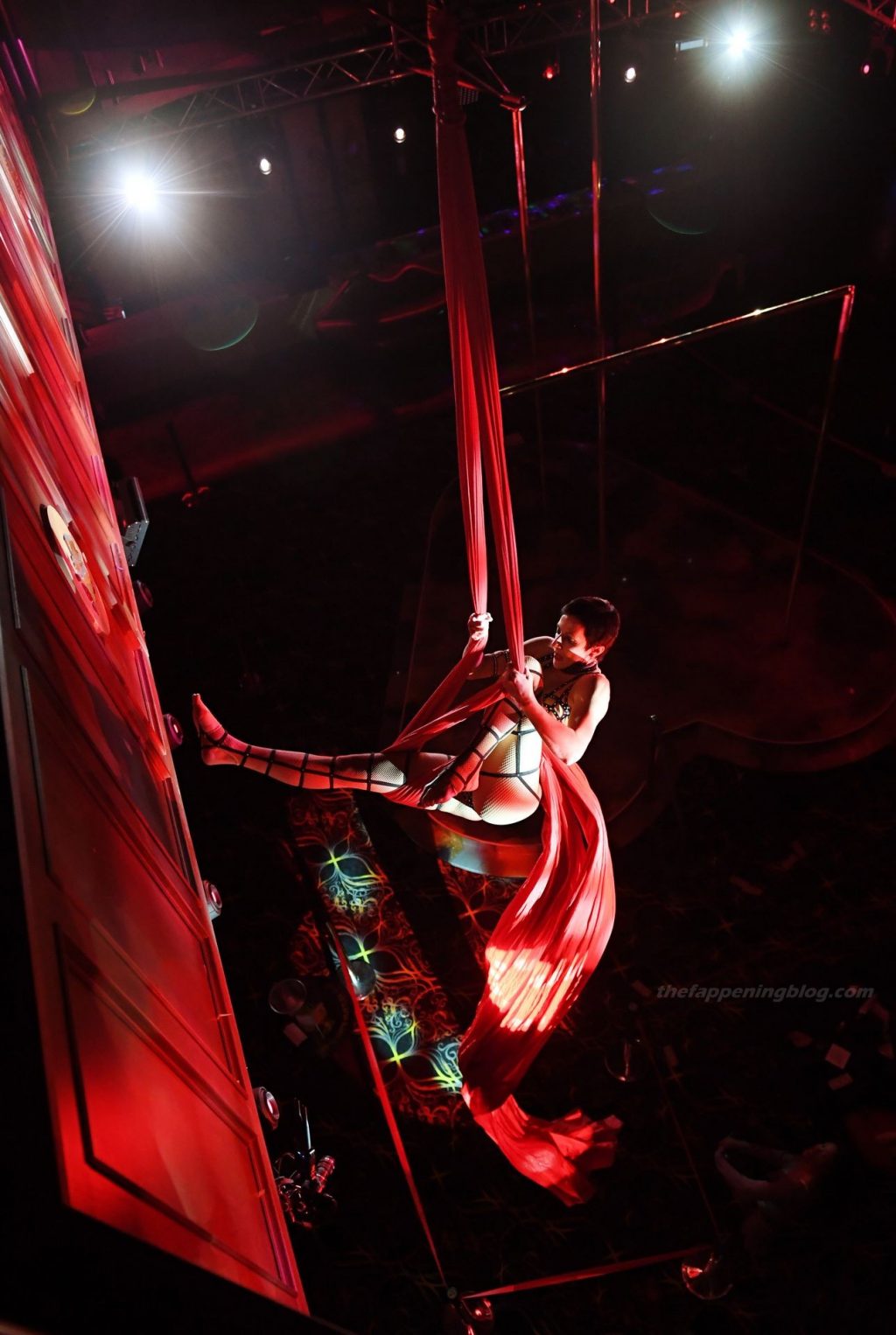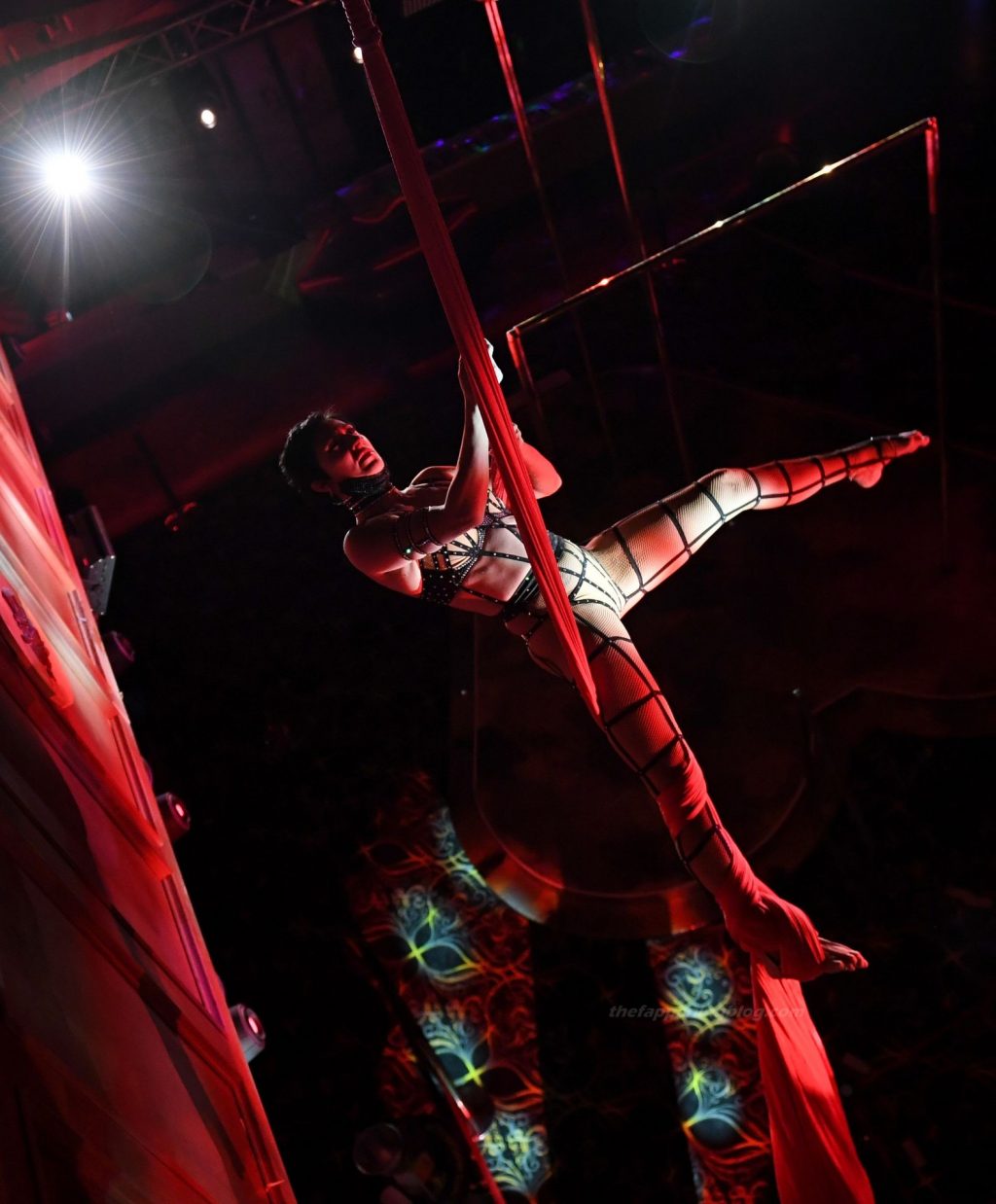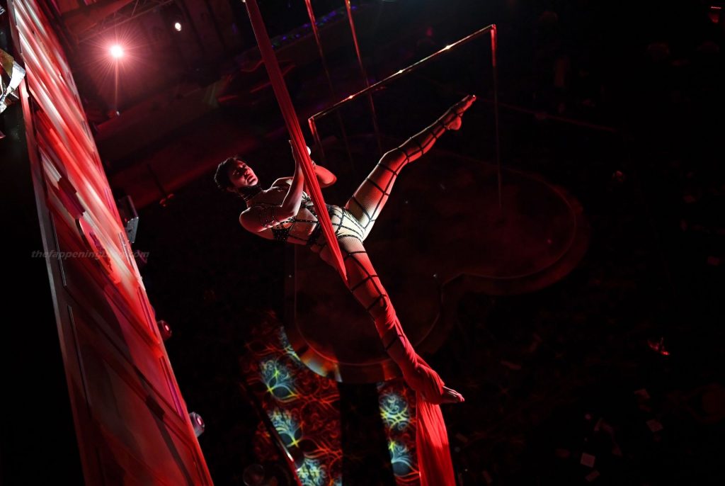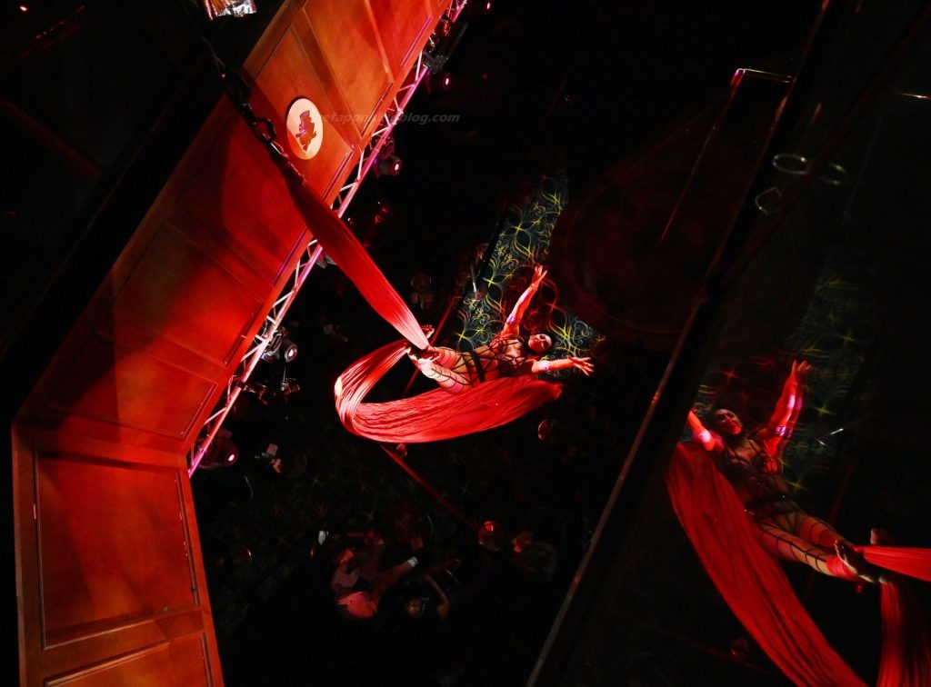 Membros do elenco Jennifer Romas, Yaisel Marino, Skylar Harris, Anne Martinez, Svetlana Ghetman, Tarian Green, Lisa Cannon, JoJo Hamner, Deena Cary dançam durante uma apresentação de “Sexxy After Dark: Onde o Jantar Encontra a Diversão” no Larry Flynt’s Hustler Club em 3 de dezembro de 2020 em Las Vegas.