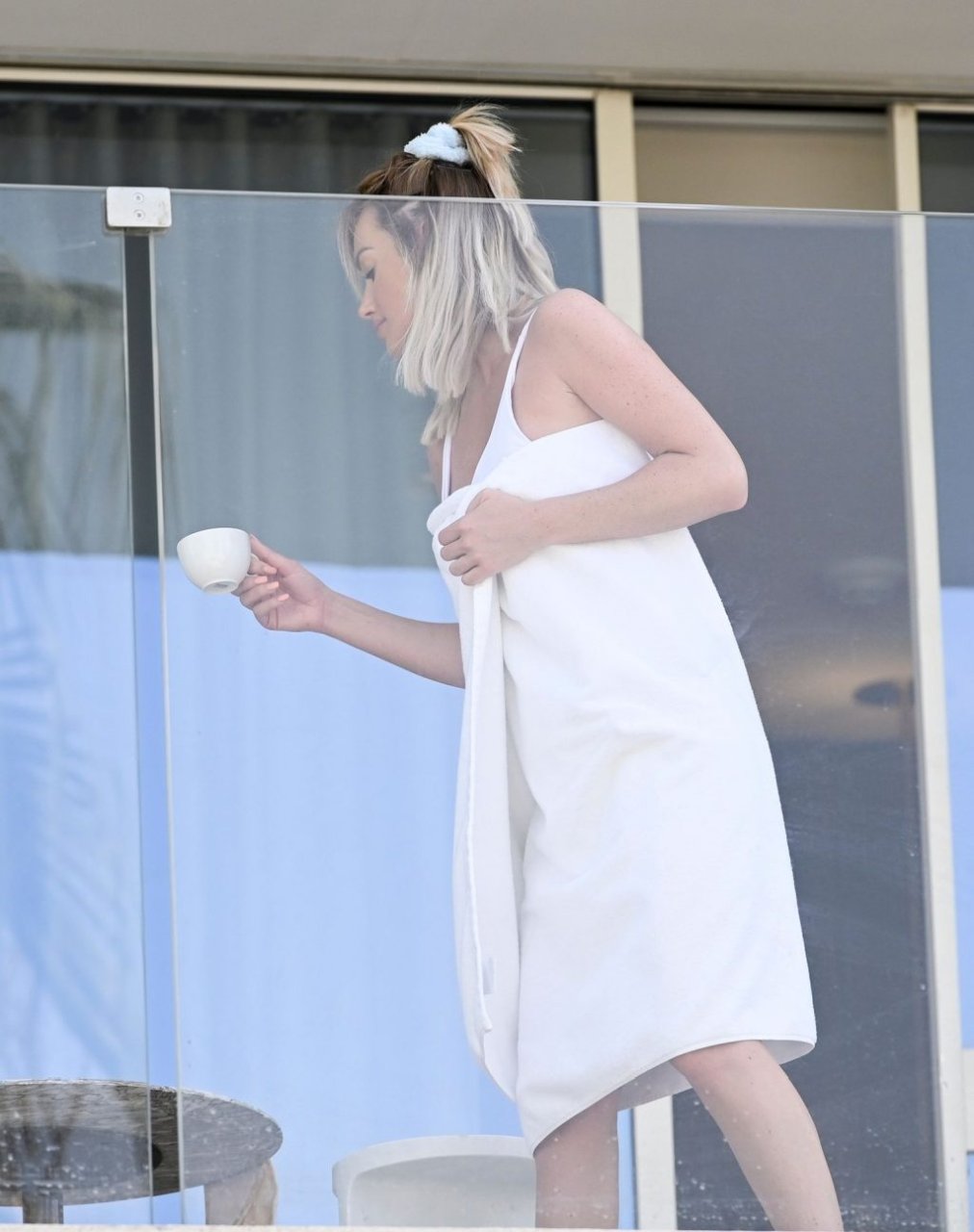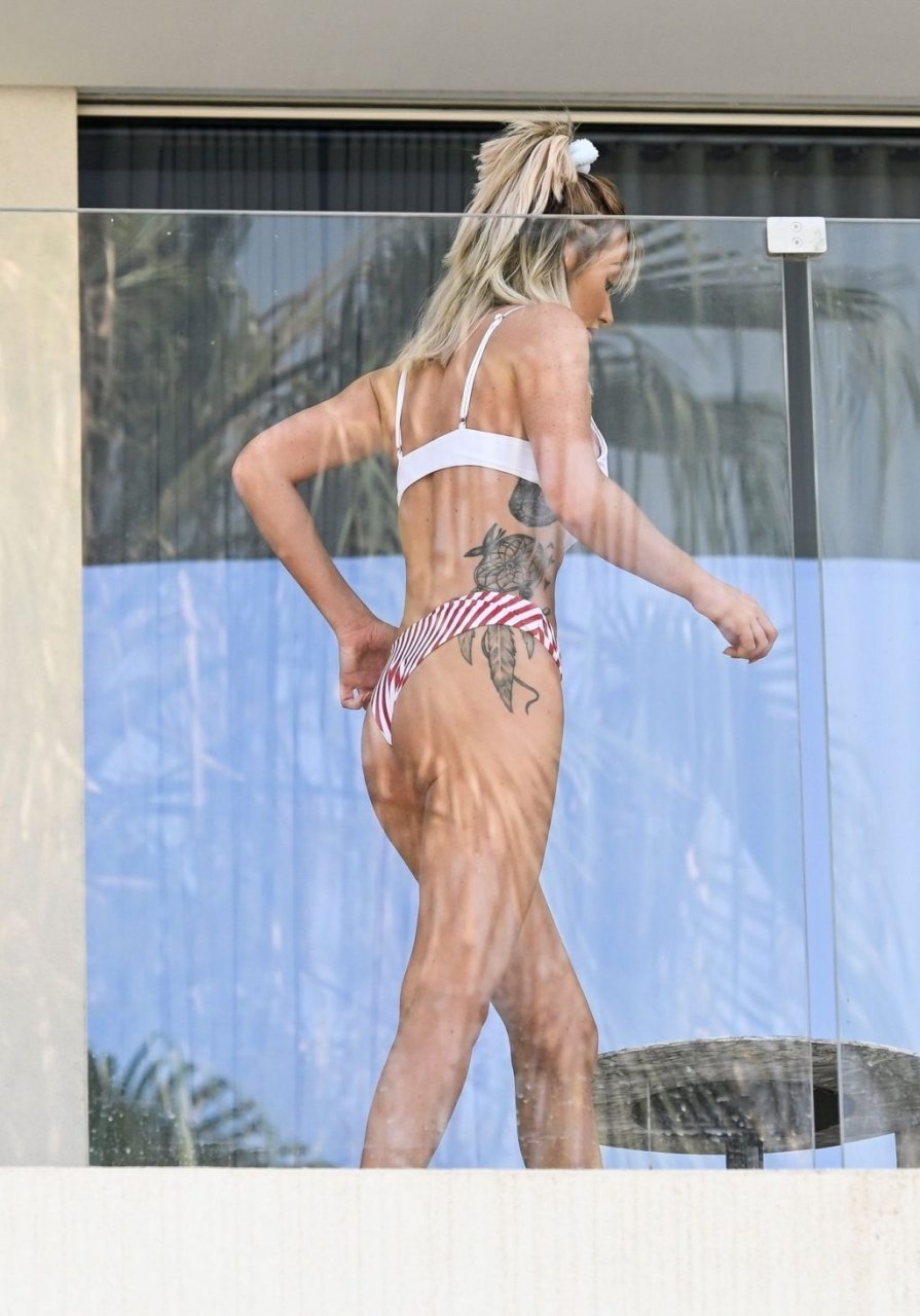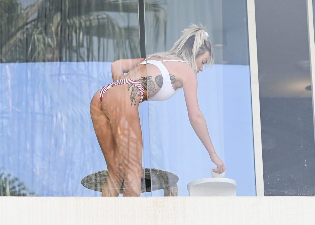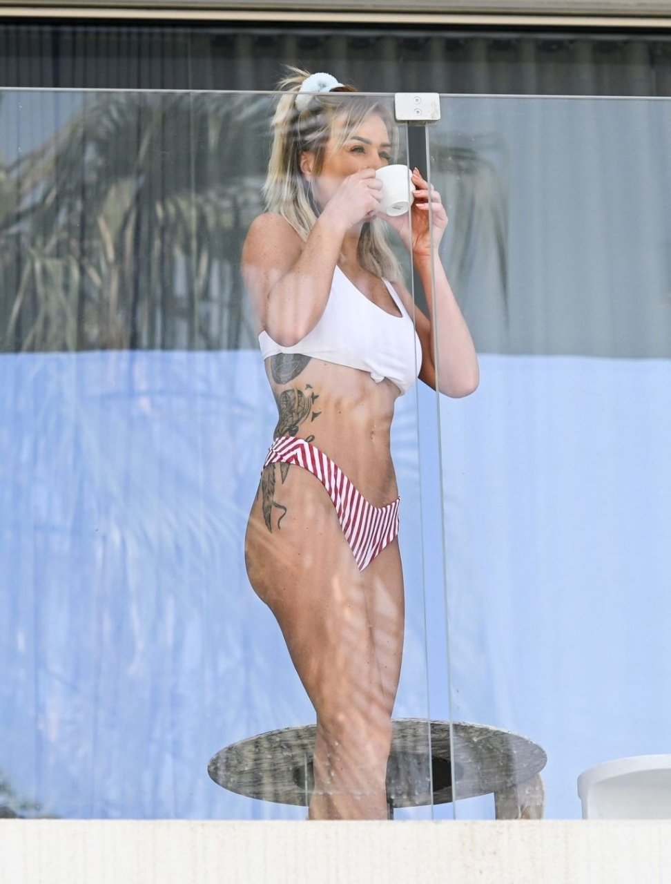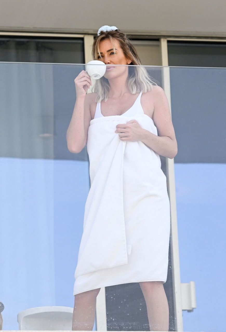 A ex-beleza escocesa do “Love Island”, Laura Anderson, aproveita o sol nos Emirados enquanto toma seu chá na varanda, vestindo um biquíni sexy e com sua toalha branca durante as férias em Dubai, 07/02/2019.