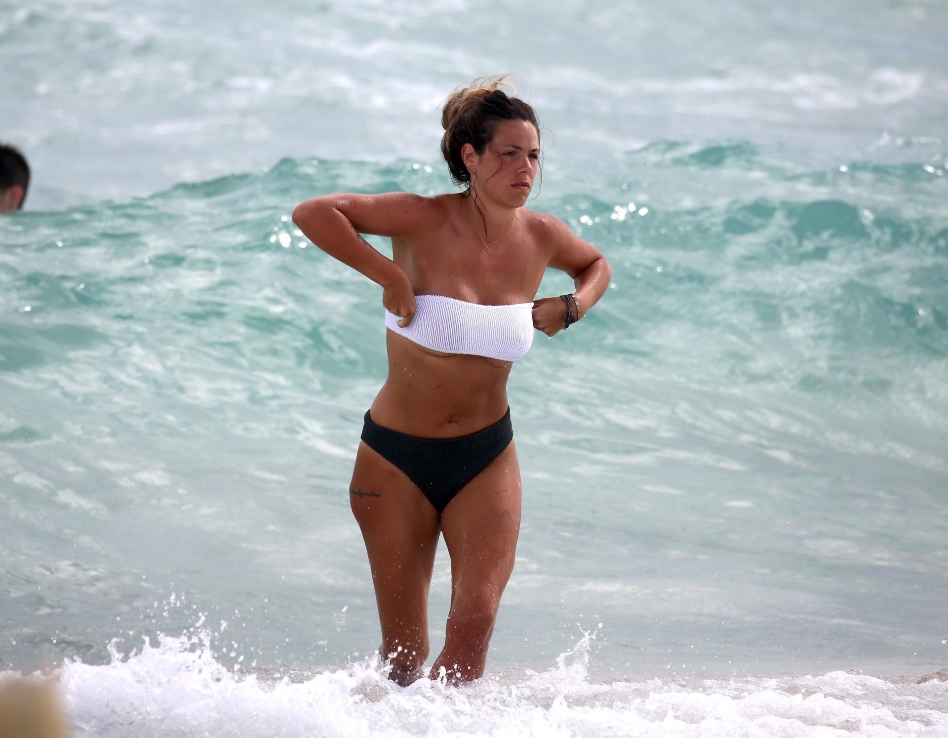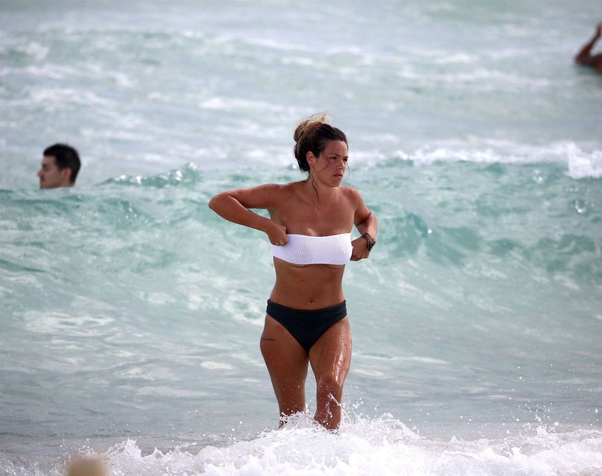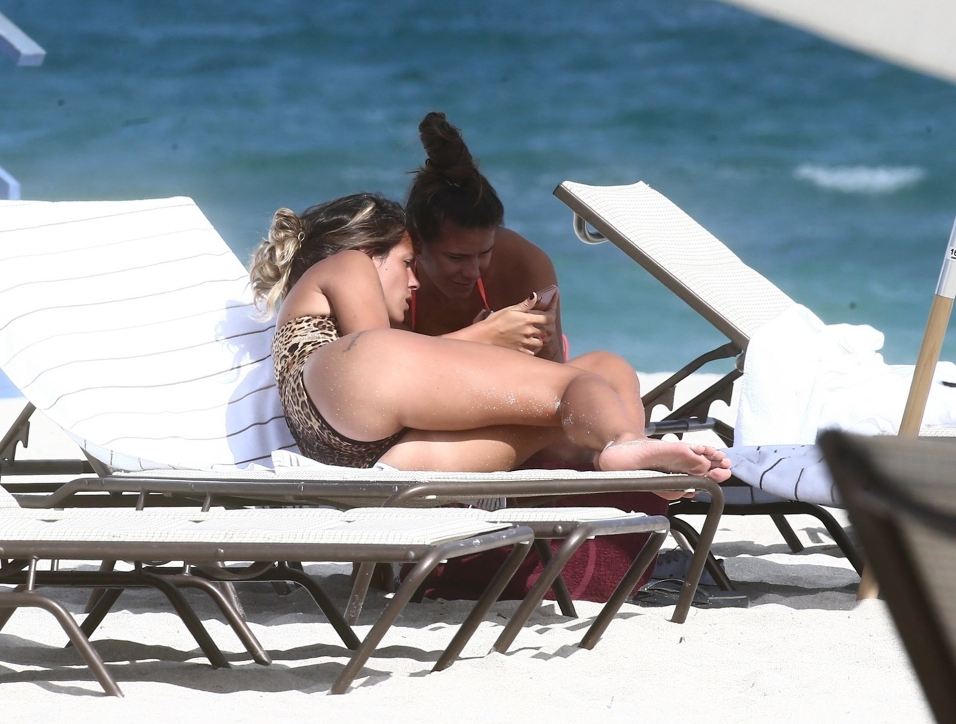 A influenciadora espanhola Laura Matamoros ilumina Miami Beach! A estrela das redes sociais exibiu sua silhueta em um maiô estampado de oncinha, antes de trocar para um top tomara que caia branco e calcinha de biquíni cinza, 16/12/2019.