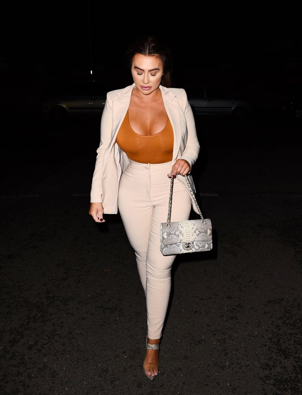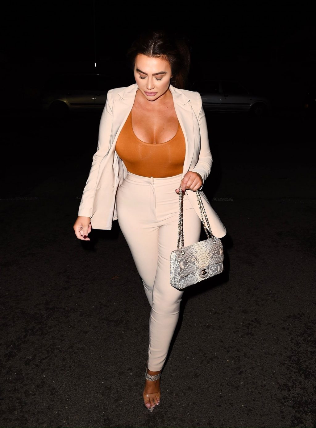 A estrela da realidade parecia de bom humor apesar do seu recente escândalo envolvendo produtos dietéticos. A garota de Essex exibe seu bumbum curvilíneo em um terno branco com uma blusa marrom enquanto se dirige ao restaurante.