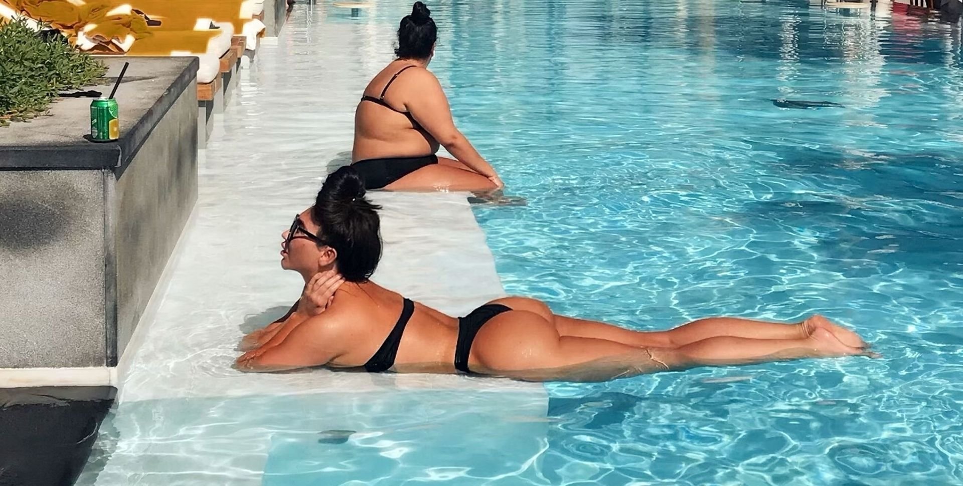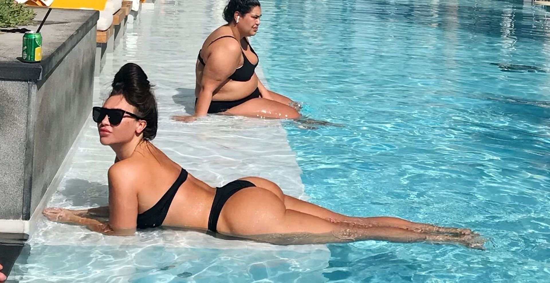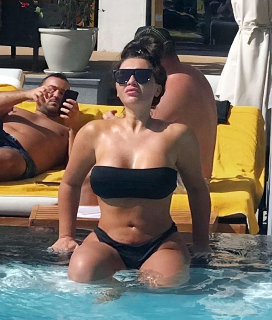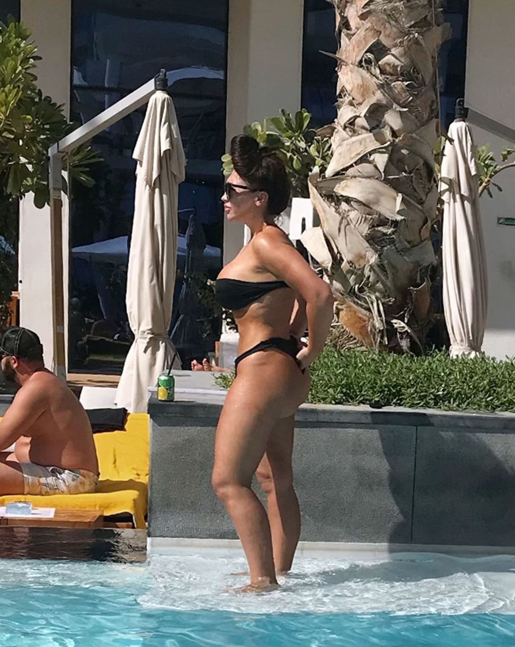 Enquanto o Reino Unido enfrenta o frio… A ex-estrela do TOWIE aproveitou o clima mais quente enquanto relaxava à beira da piscina em seu luxuoso hotel FIVE Palm Jumeirah durante as férias em Dubai.