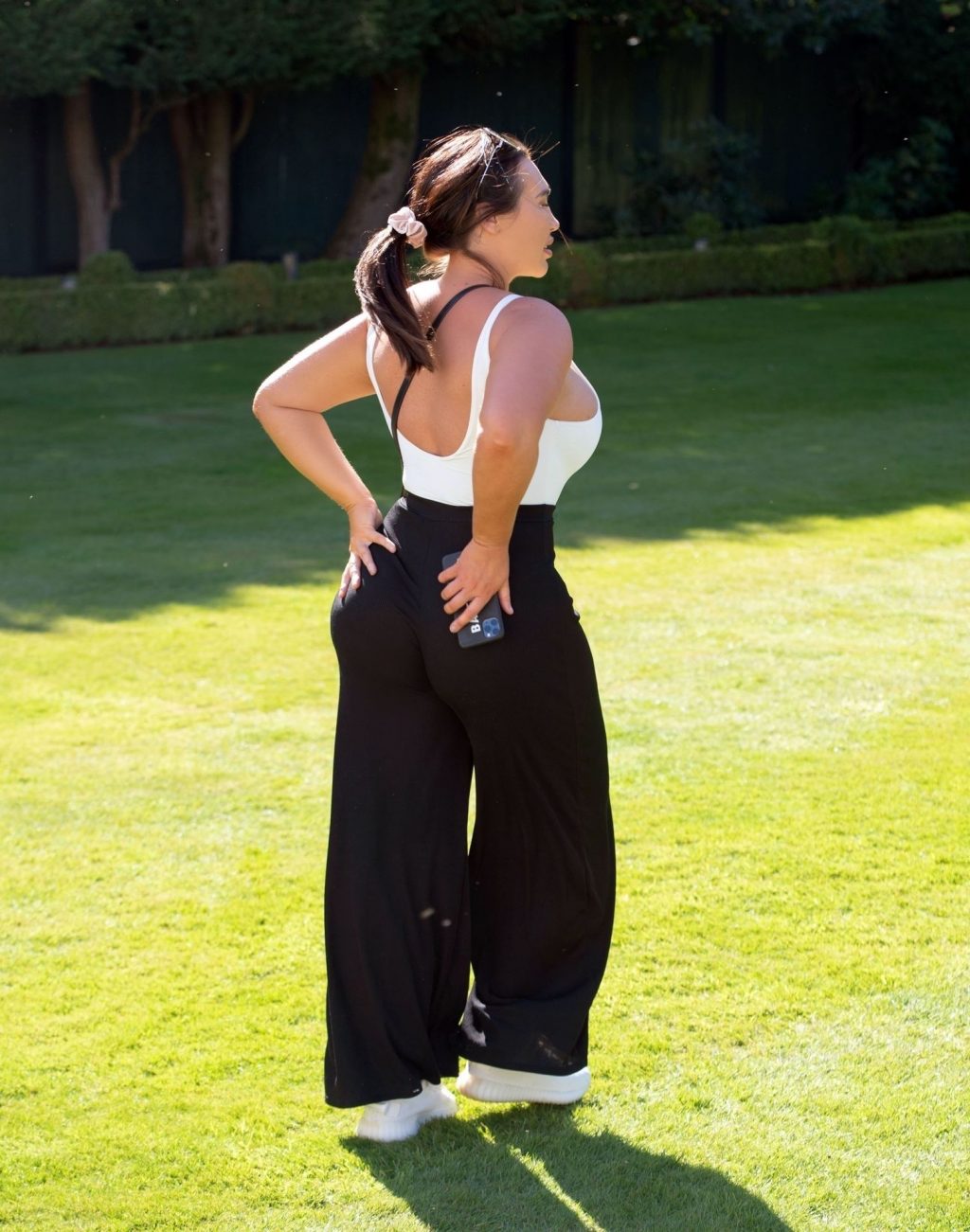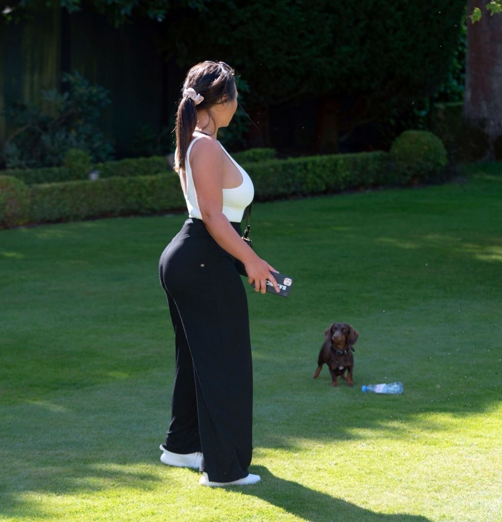 Lauren Goodger é vista em seu parque local em Essex, 20/05/2020. A estrela do TOWIE é vista usando uma regata branca e calças pretas enquanto brinca com um cachorro salsicha.