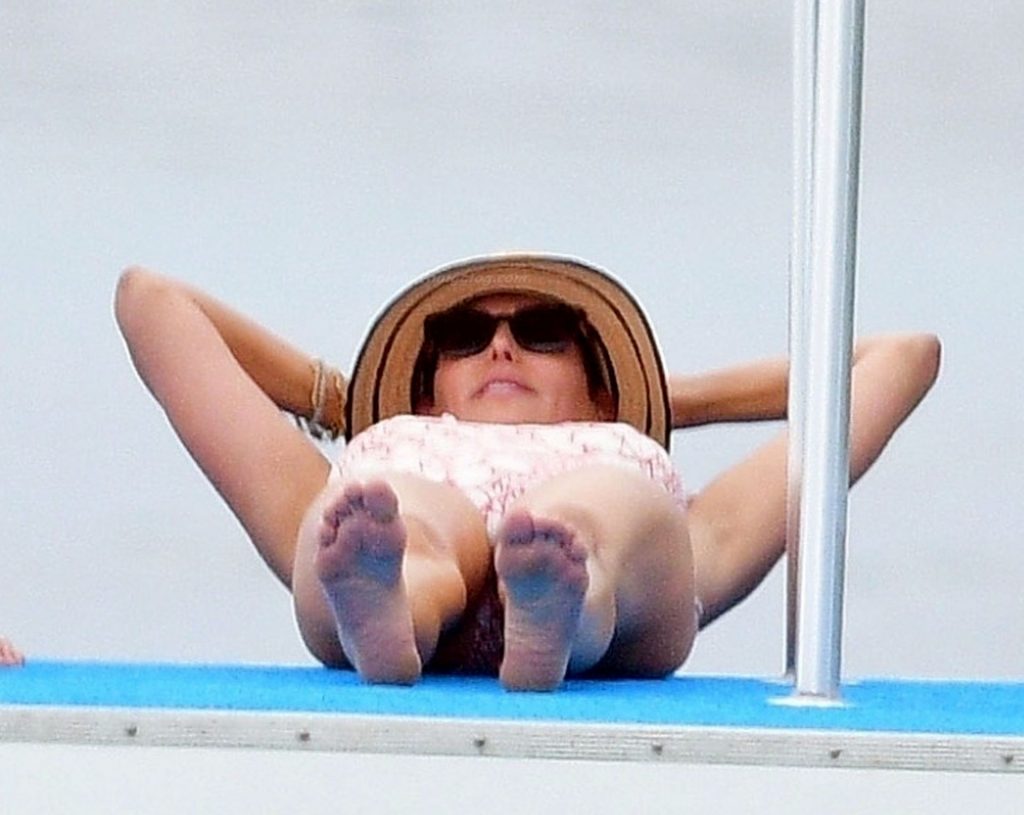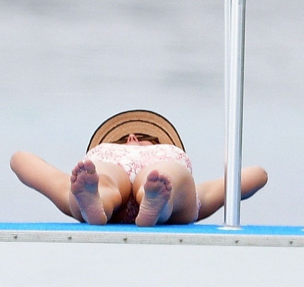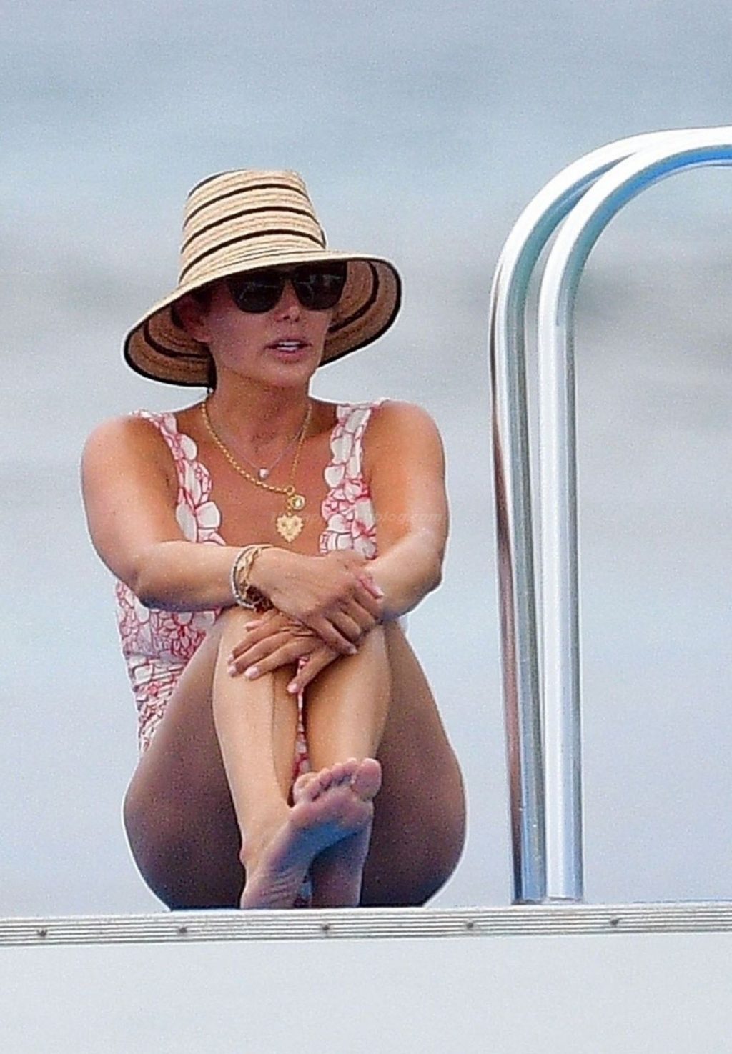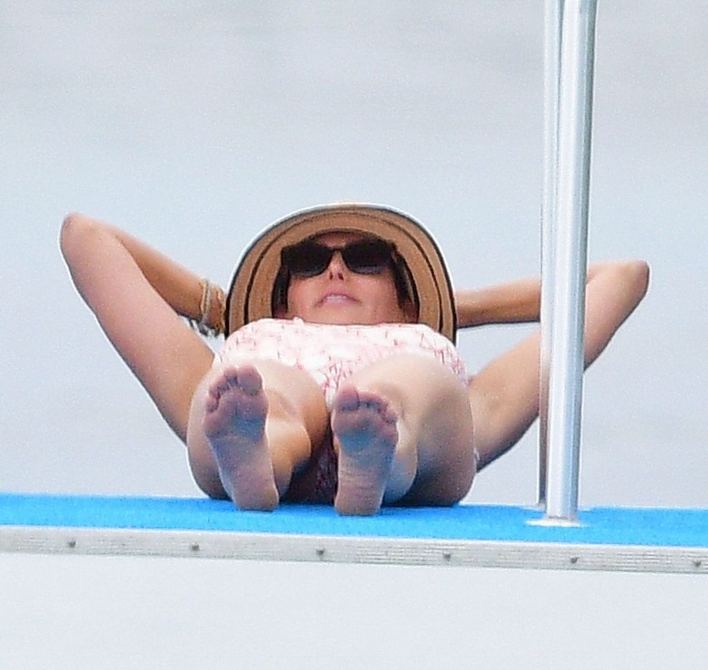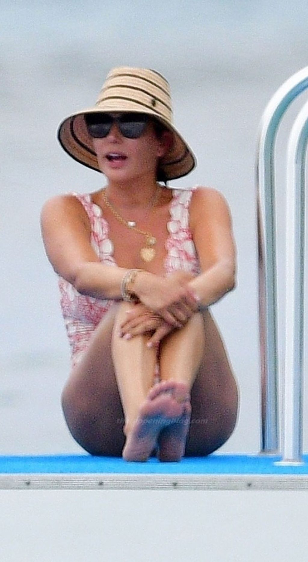 Lauren relaxou com seu filho Eric em seu barco enquanto mãe e filho nadavam no mar, com Lauren exibindo seu físico voluptuoso em um biquíni estampado floral.