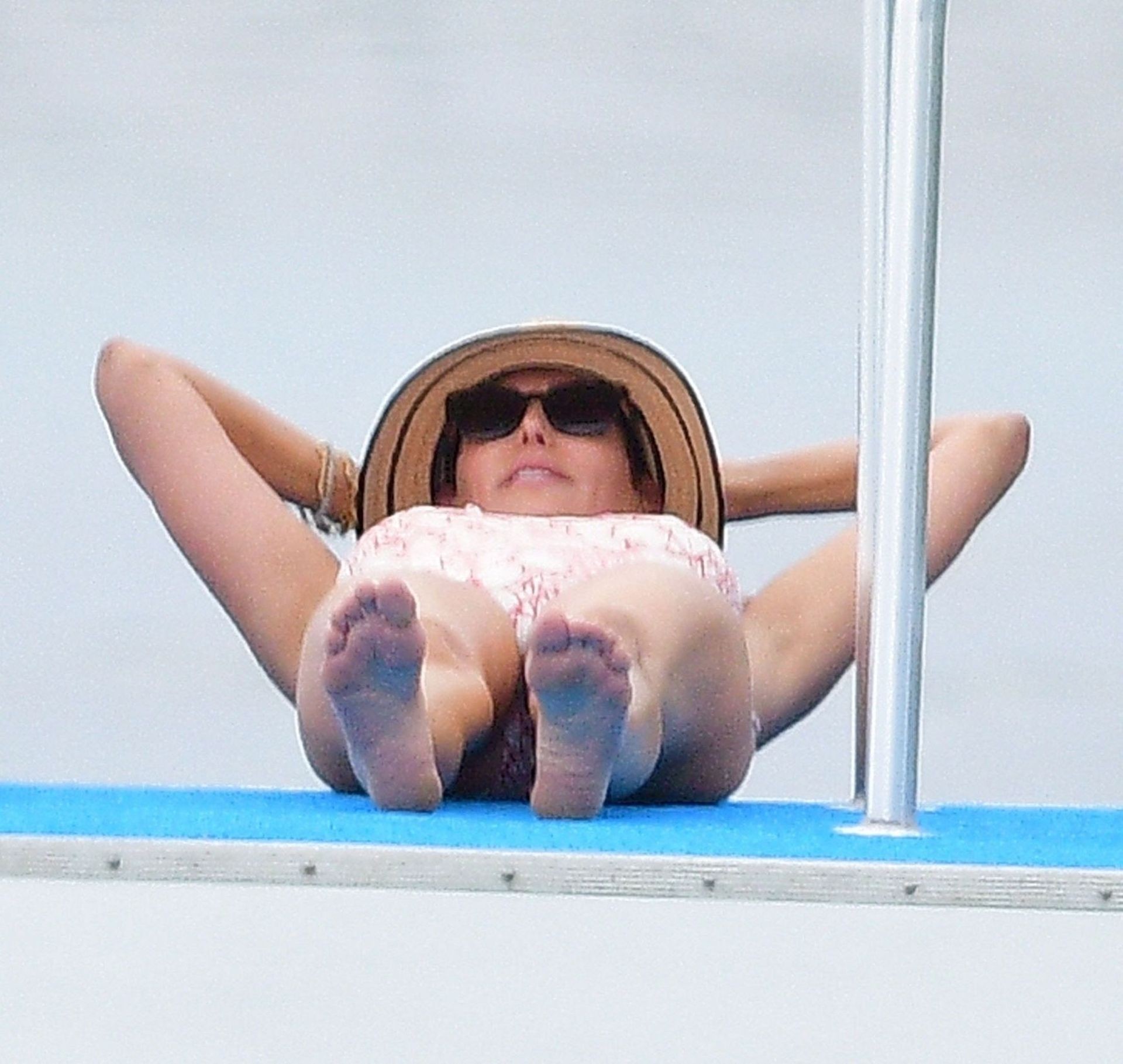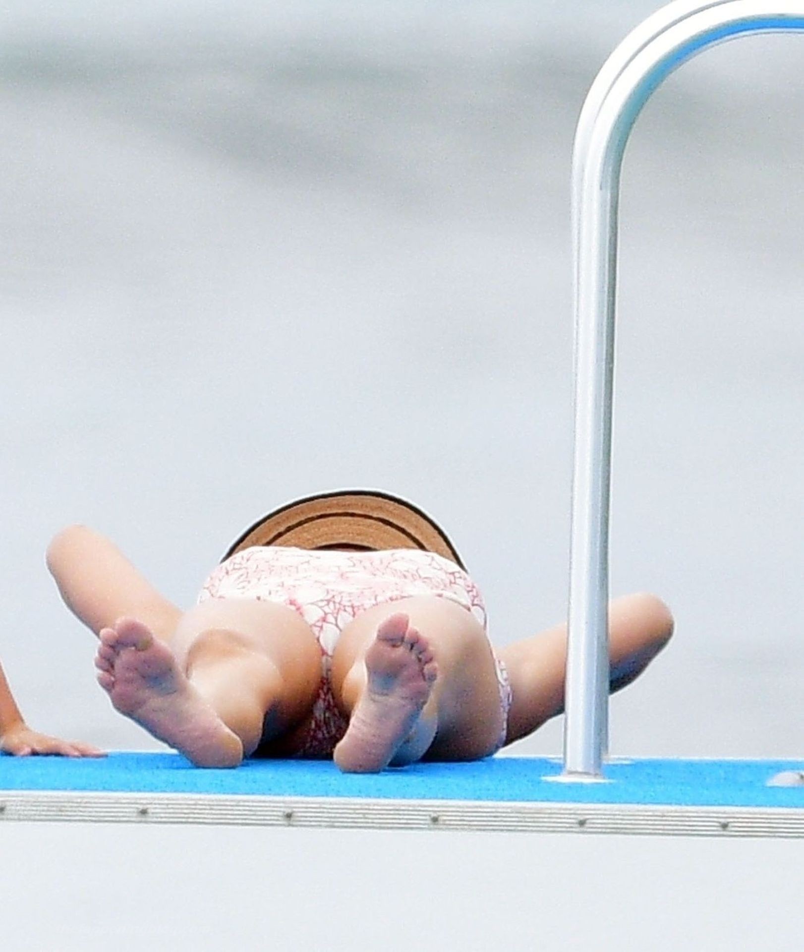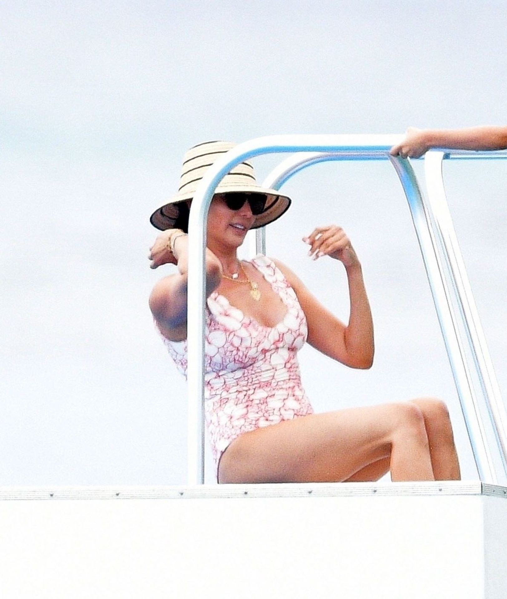 Lauren relaxou com seu filho Eric em seu barco enquanto mãe e filho nadavam no mar, com Lauren exibindo seu físico voluptuoso em um biquíni estampado floral.
