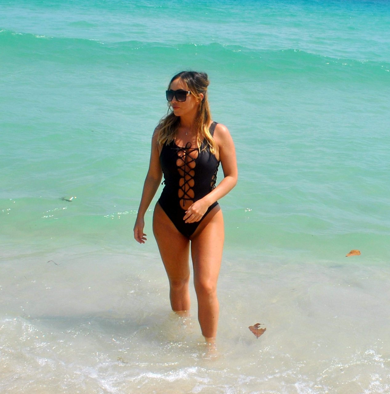 A estrela da televisão reality Lauryn Goodman exibe suas curvas na praia em Cabo Verde, 01/03/2018.