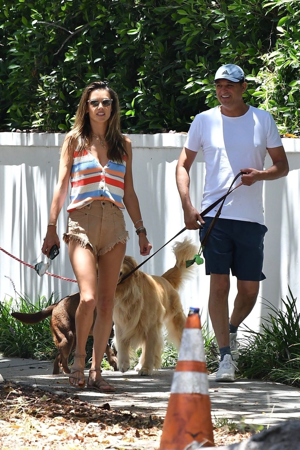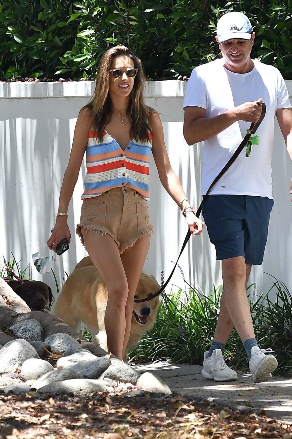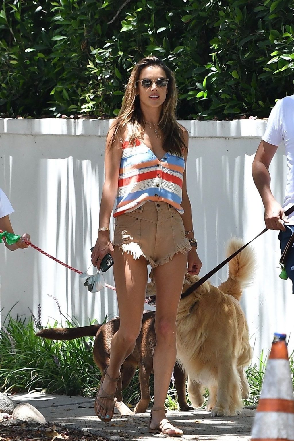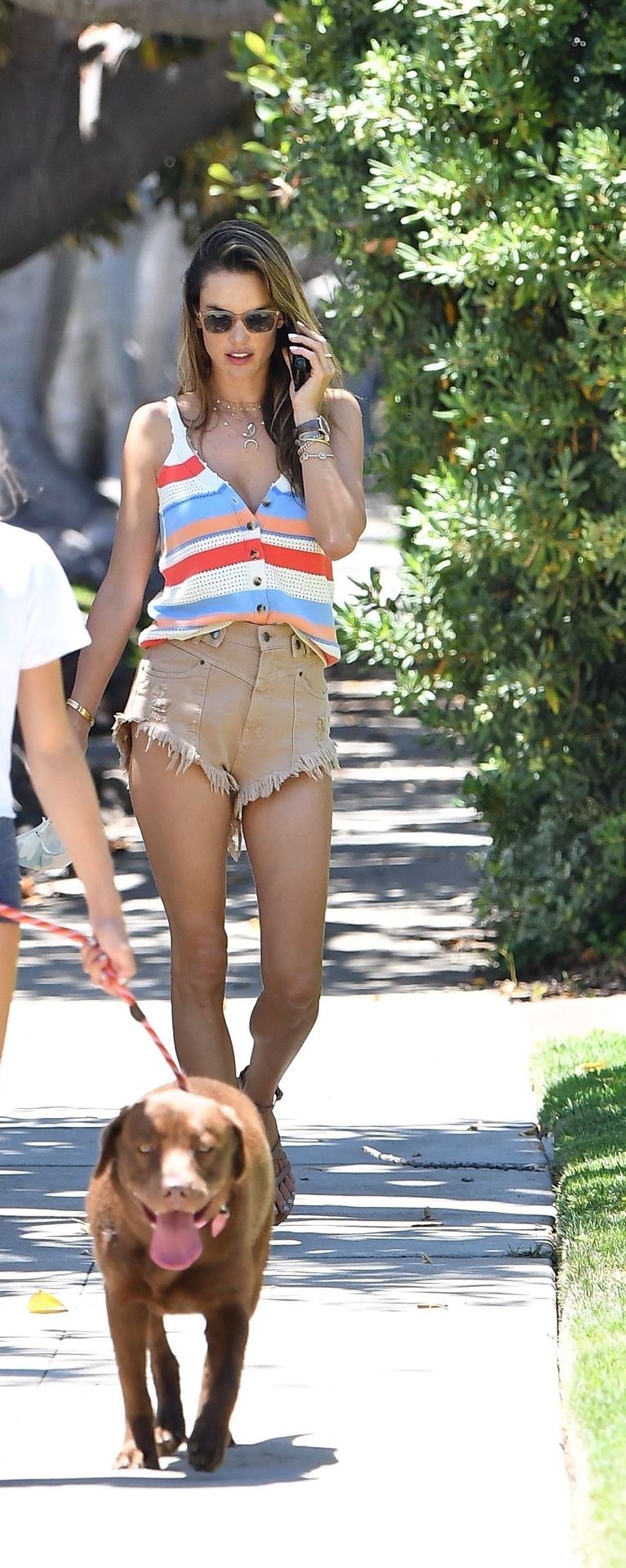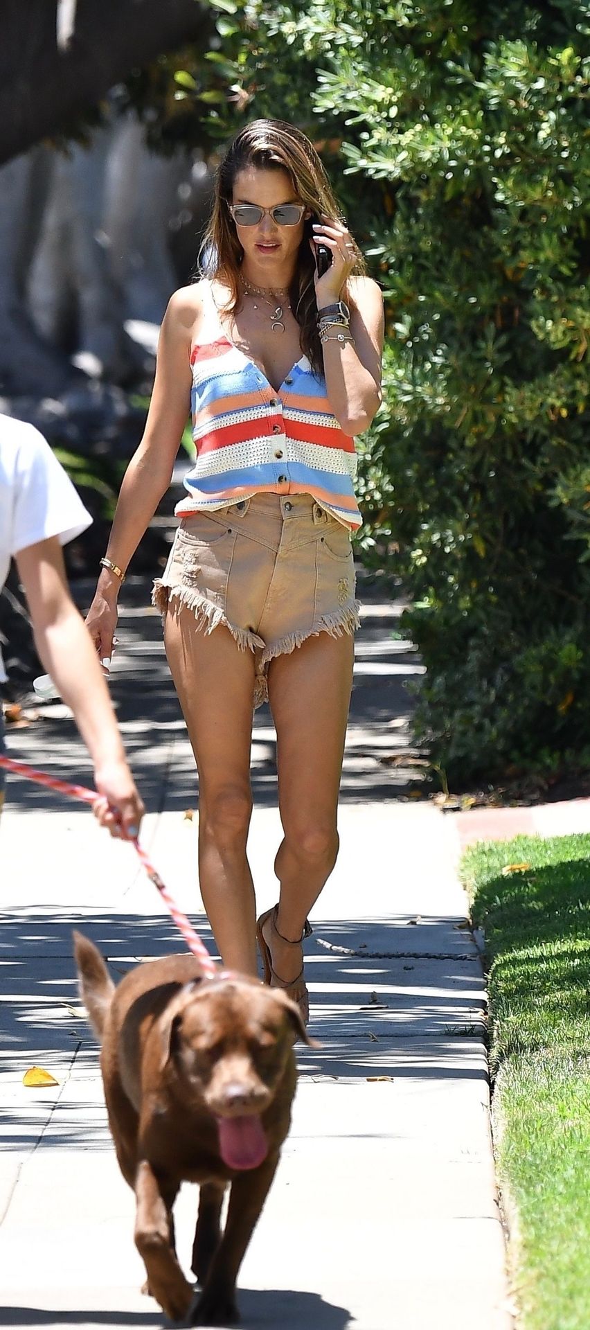 Alessandra Ambrosio sai com sua filha Anja para levar o cachorro para passear pelo bairro em Santa Monica, 11/07/2020. A modelo estava com um visual BoHo chique, usando uma blusa listrada e shorts jeans com franjas.