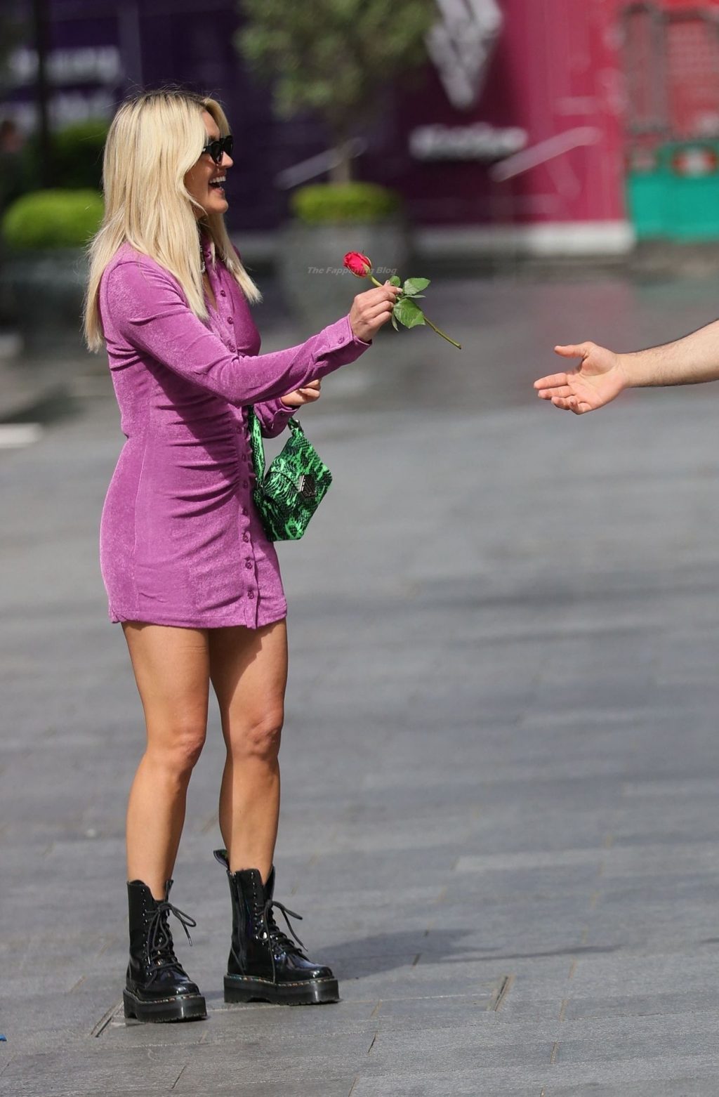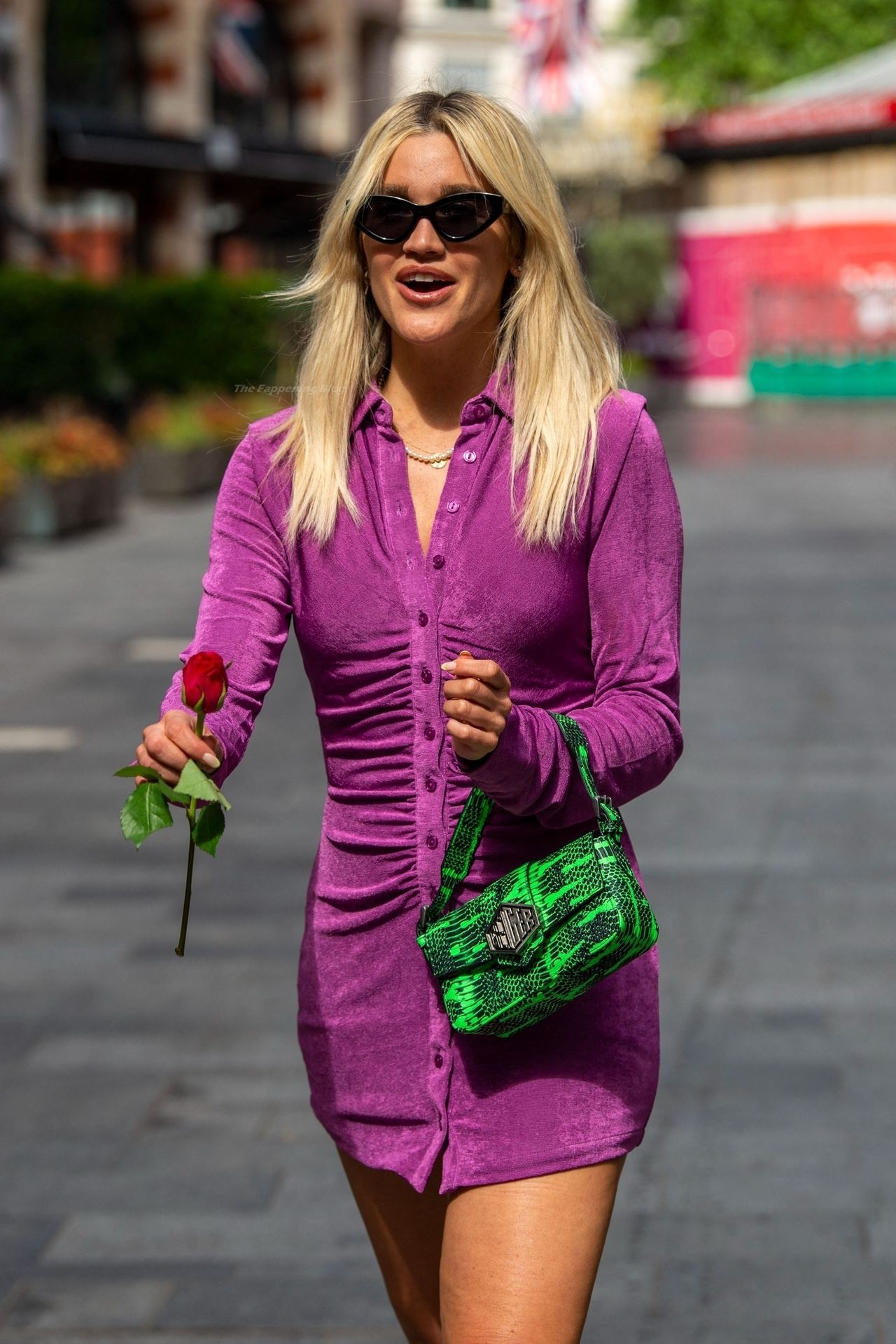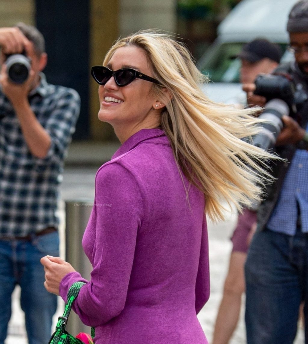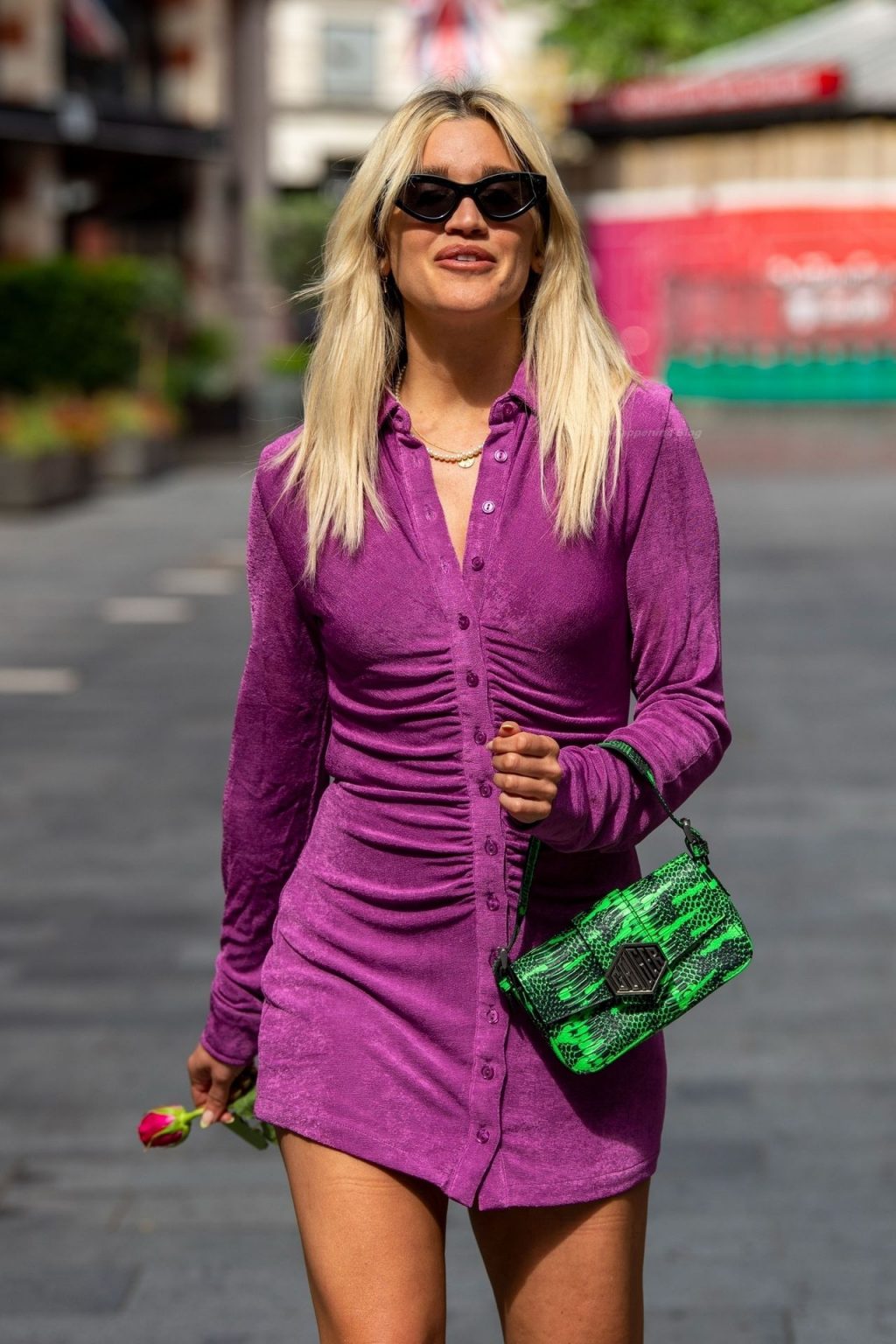 Apresentadora de rádio e ex-Pussycat Doll Ashley Roberts é fotografada usando um lindo vestido mini roxo com Dr. Martens e uma bolsa verde brilhante com padrão de cobra enquanto se dirige aos estúdios da Heart Radio em Londres, 07/06/2021.