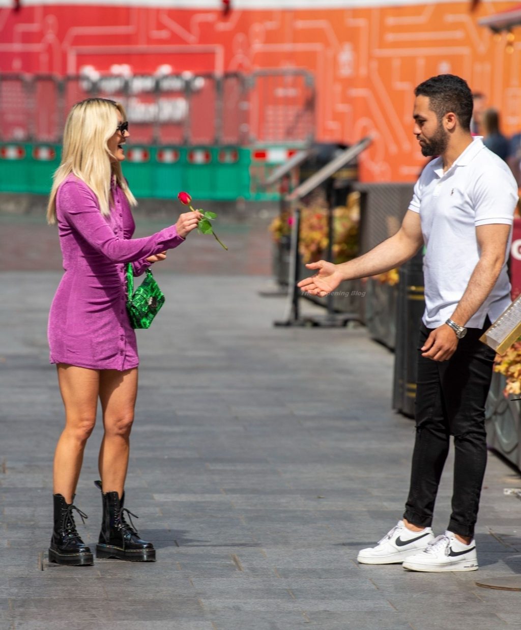 A loira bombshell recebe uma rosa vermelha de um cavalheiro do lado de fora dos estúdios.