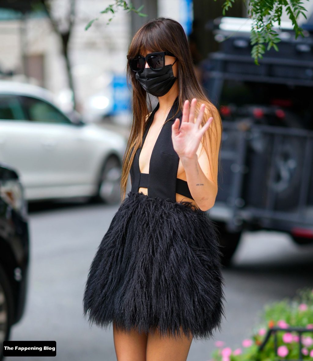Atriz Dakota Johnson sai com um vestido revelador na cidade de Nova York, 30/09/2021. A atriz de 31 anos usava uma máscara facial preta, vestido combinando e saltos.