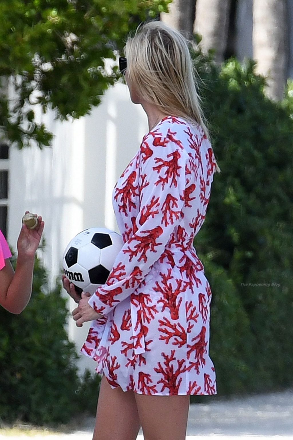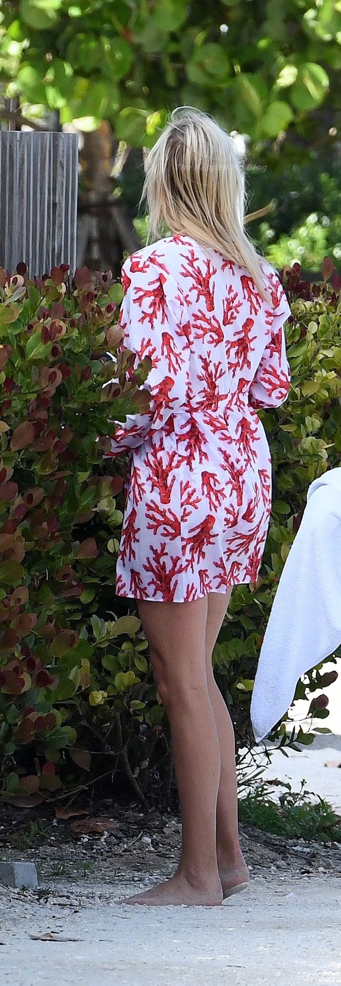 Ivanka Trump usa um maiô estampado em coral vermelho sob um robe combinando enquanto passeia na praia com sua filha em Miami, 15/03/2021.