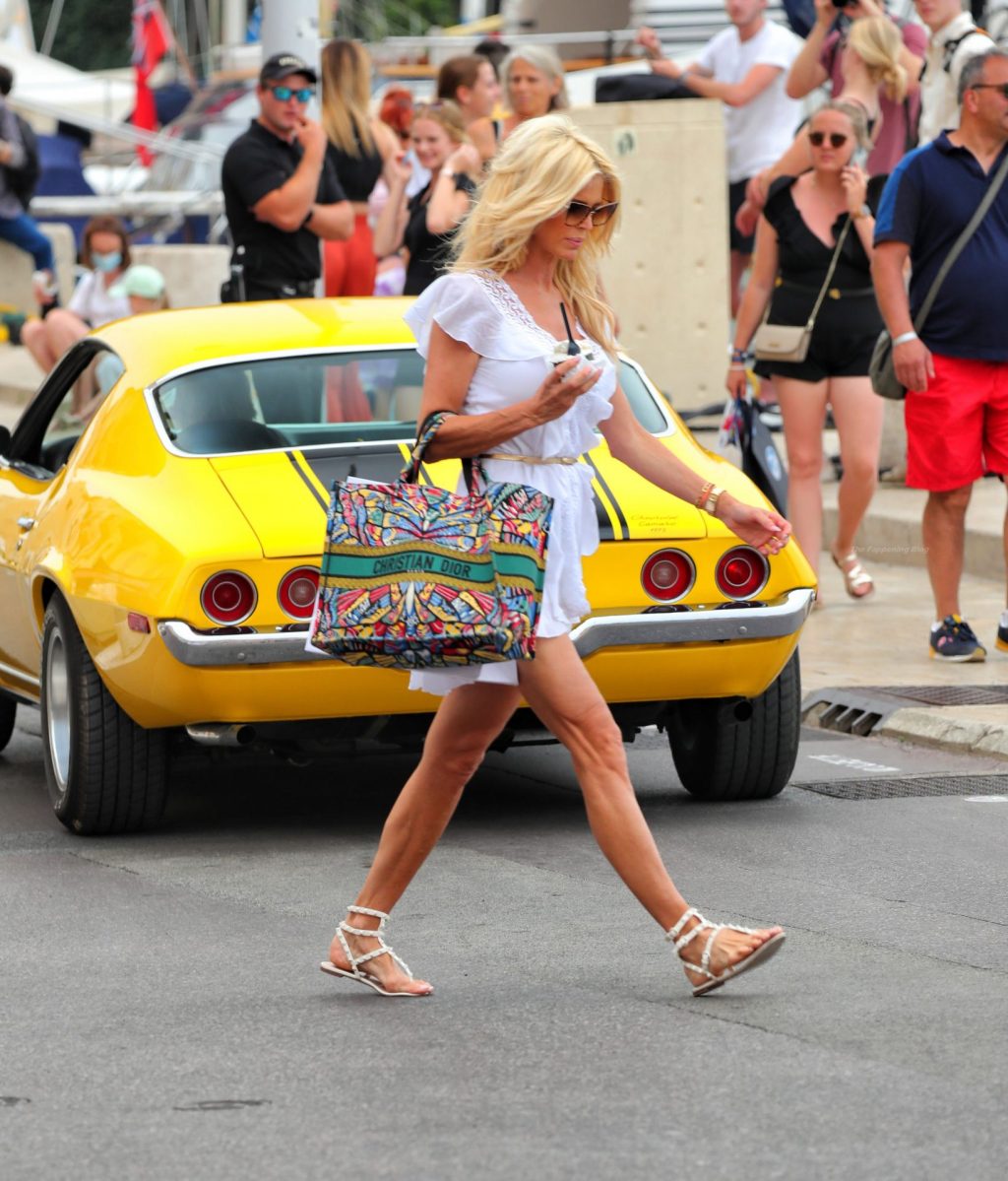 Modelo Victoria Silvstedt é vista fazendo compras em Saint Tropez, 19/06/2021. Ela exibe suas famosas pernas e come um sorvete.