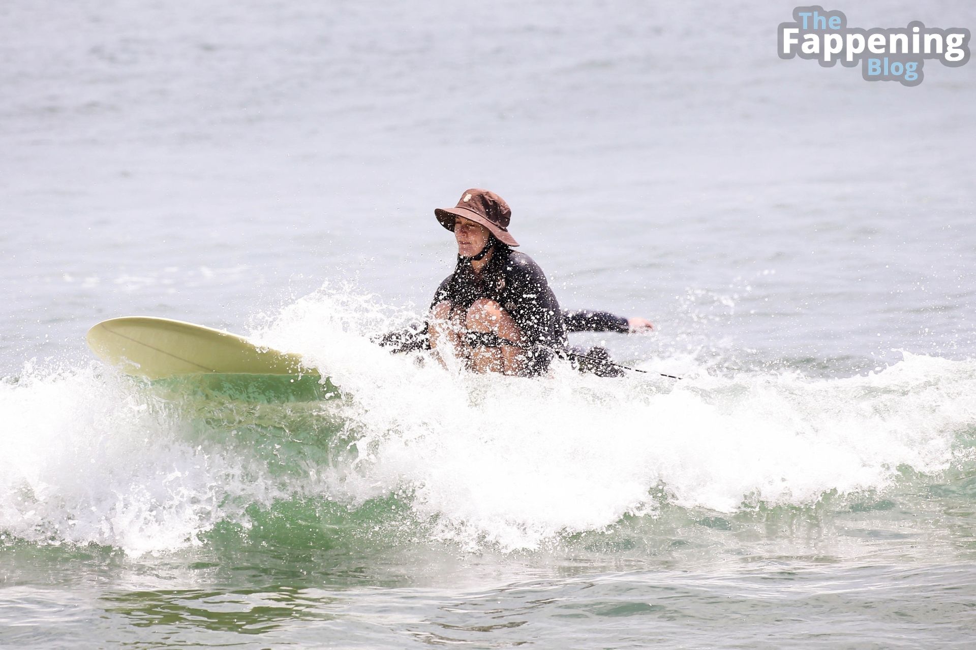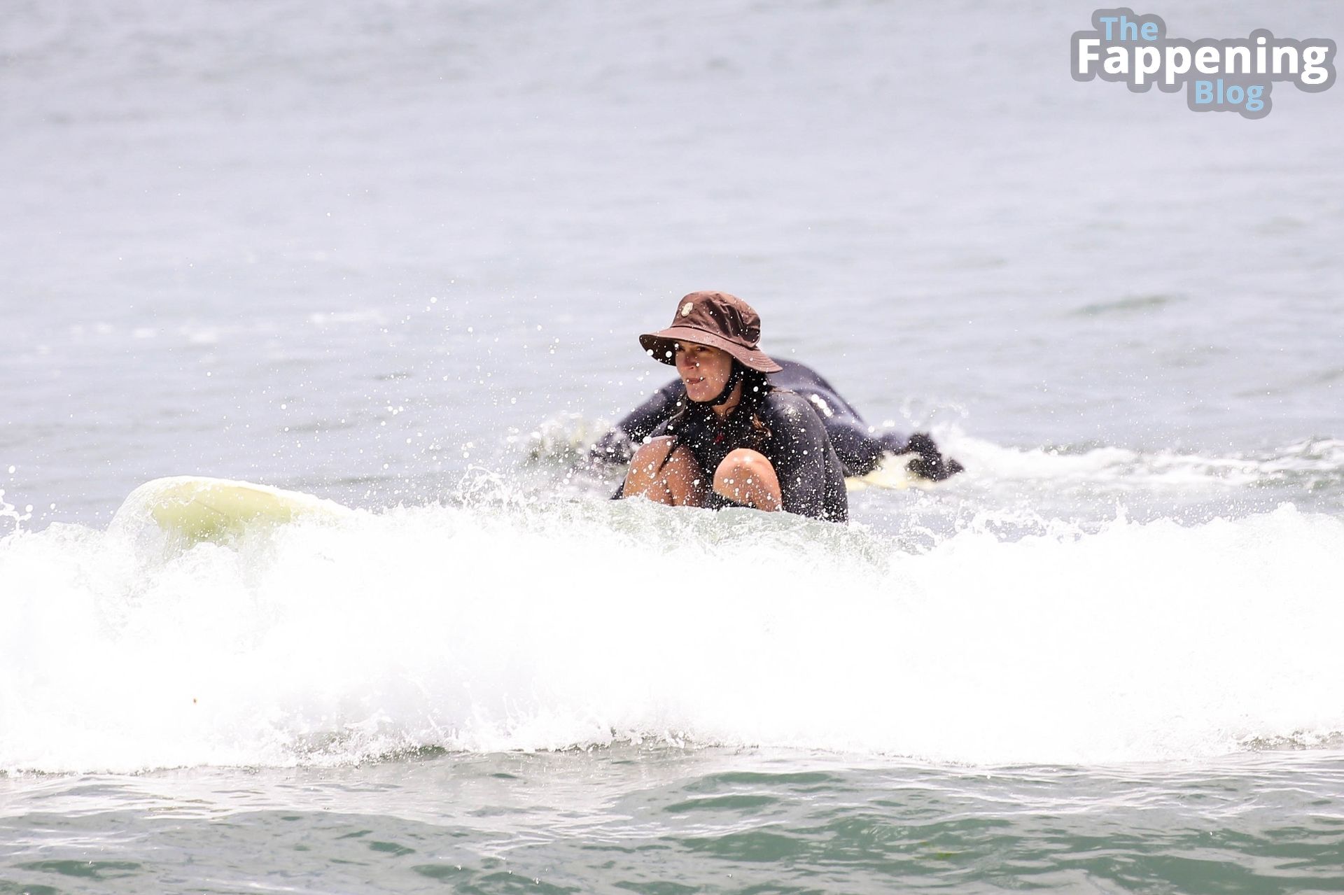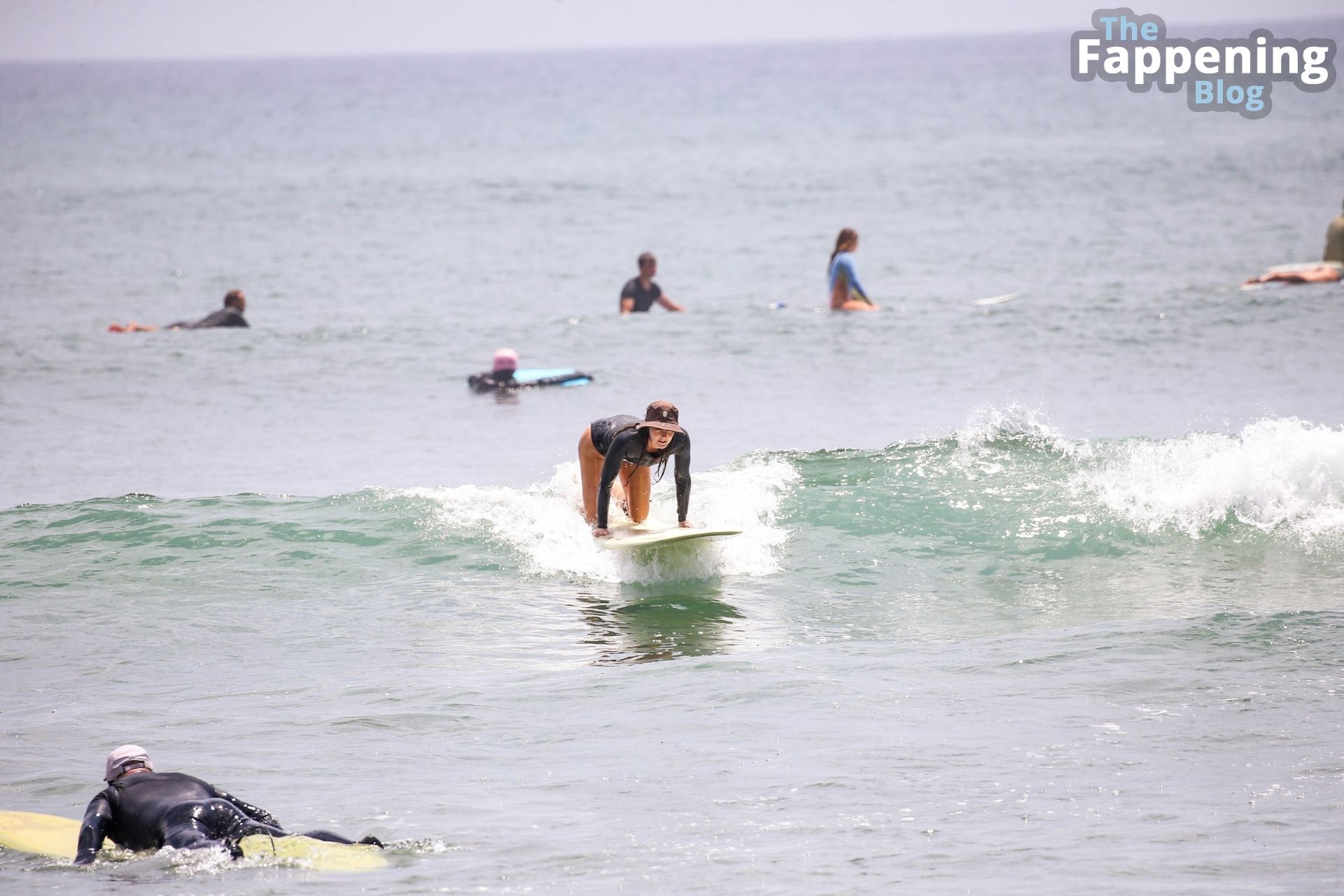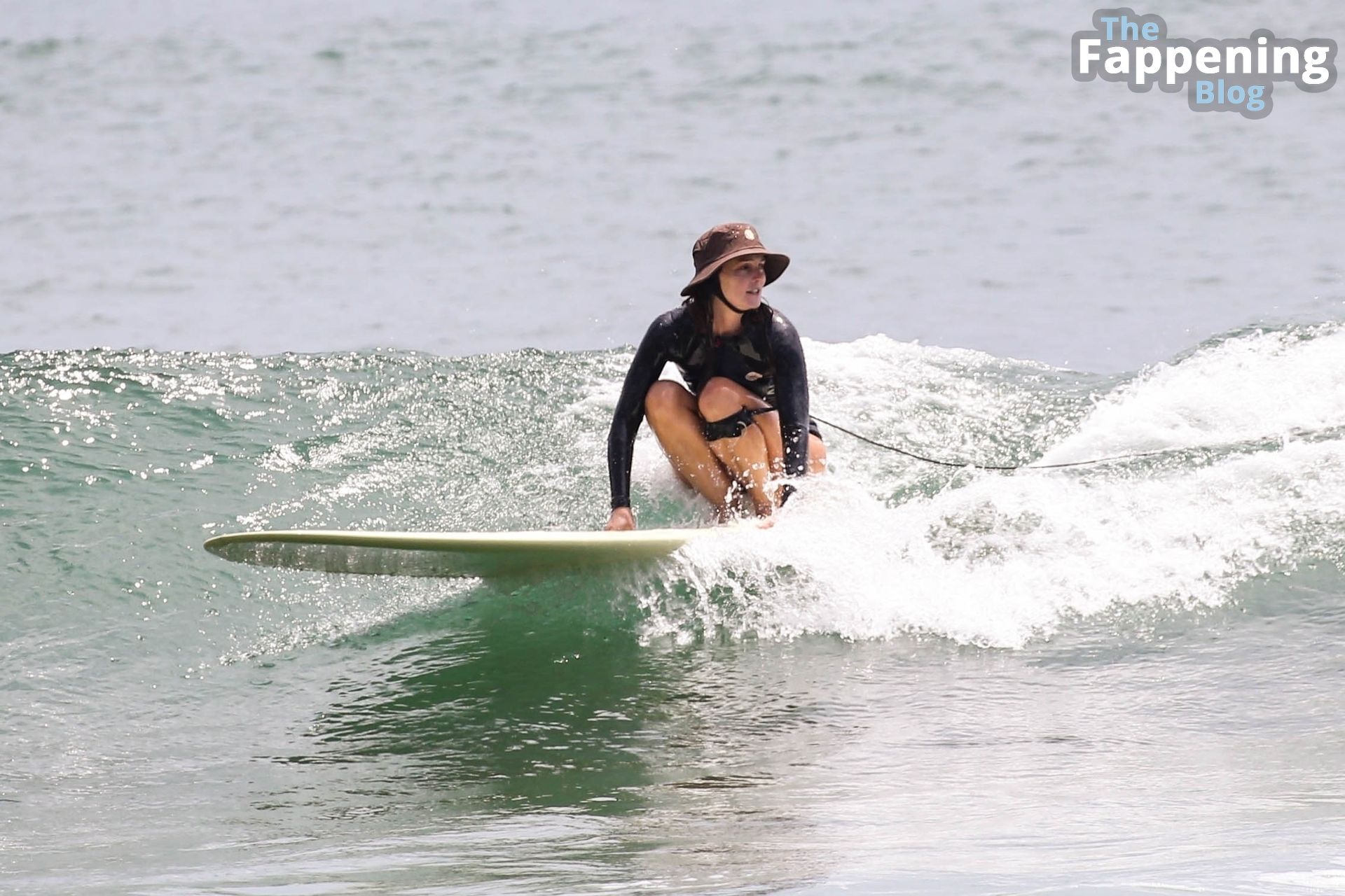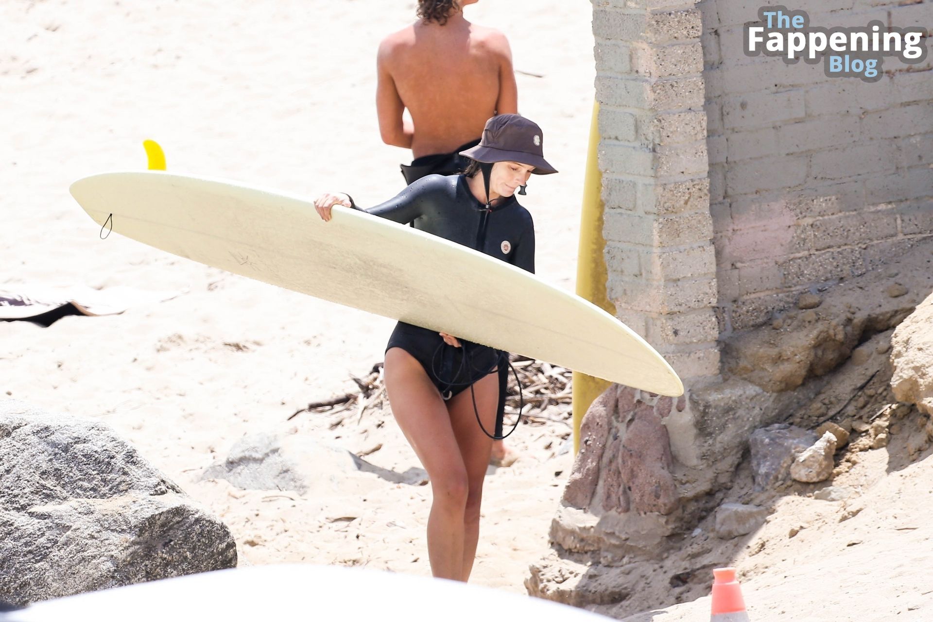 Atriz Leighton Meester, mais conhecida por seu papel na série de TV ‘Gossip Girl’, foi vista mostrando suas habilidades de surfe durante uma sessão solo de ondas no ensolarado Malibu, 12/08/2023.