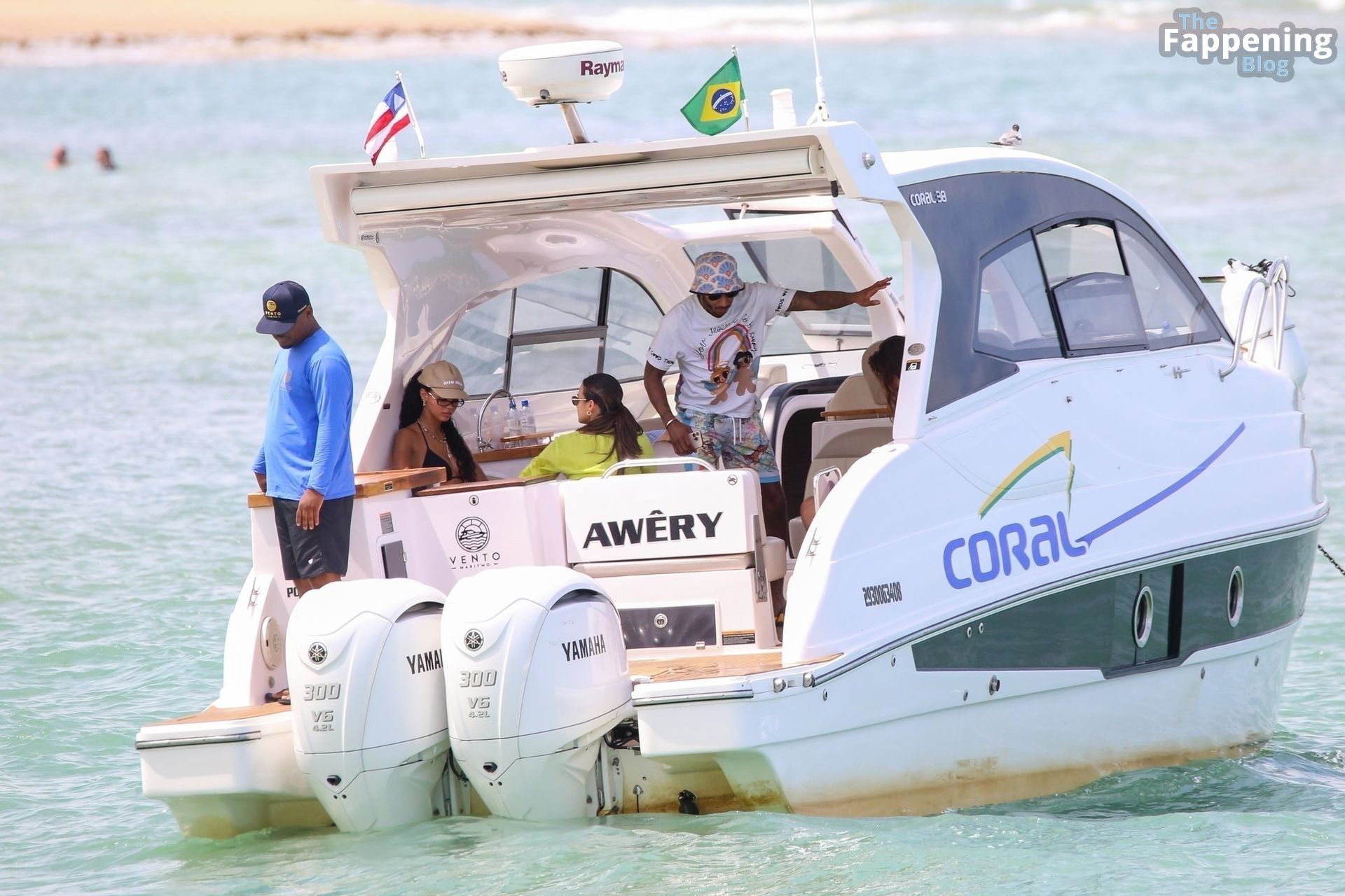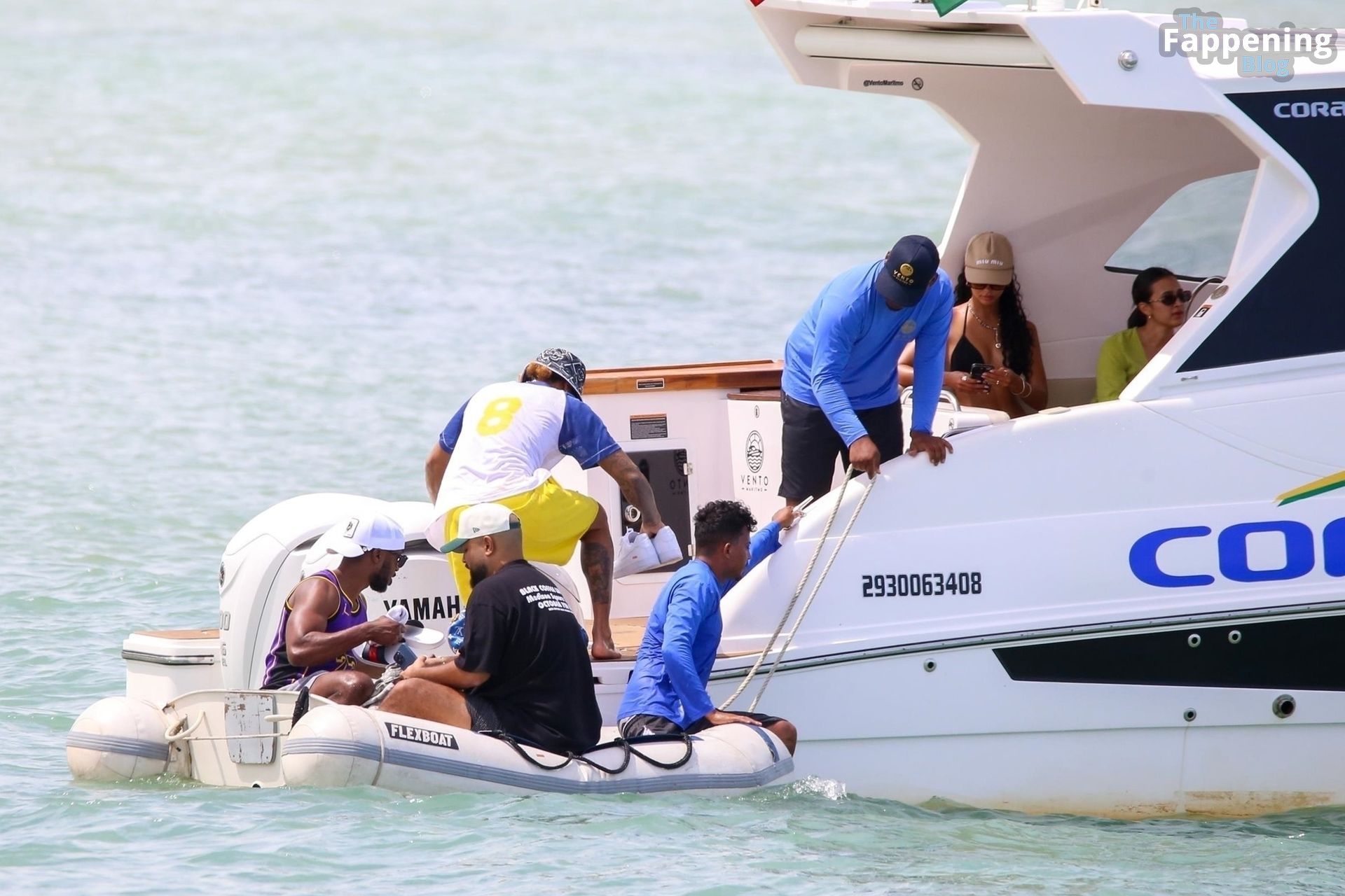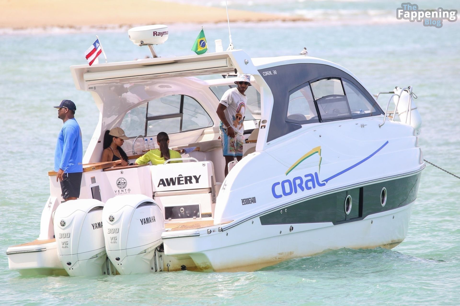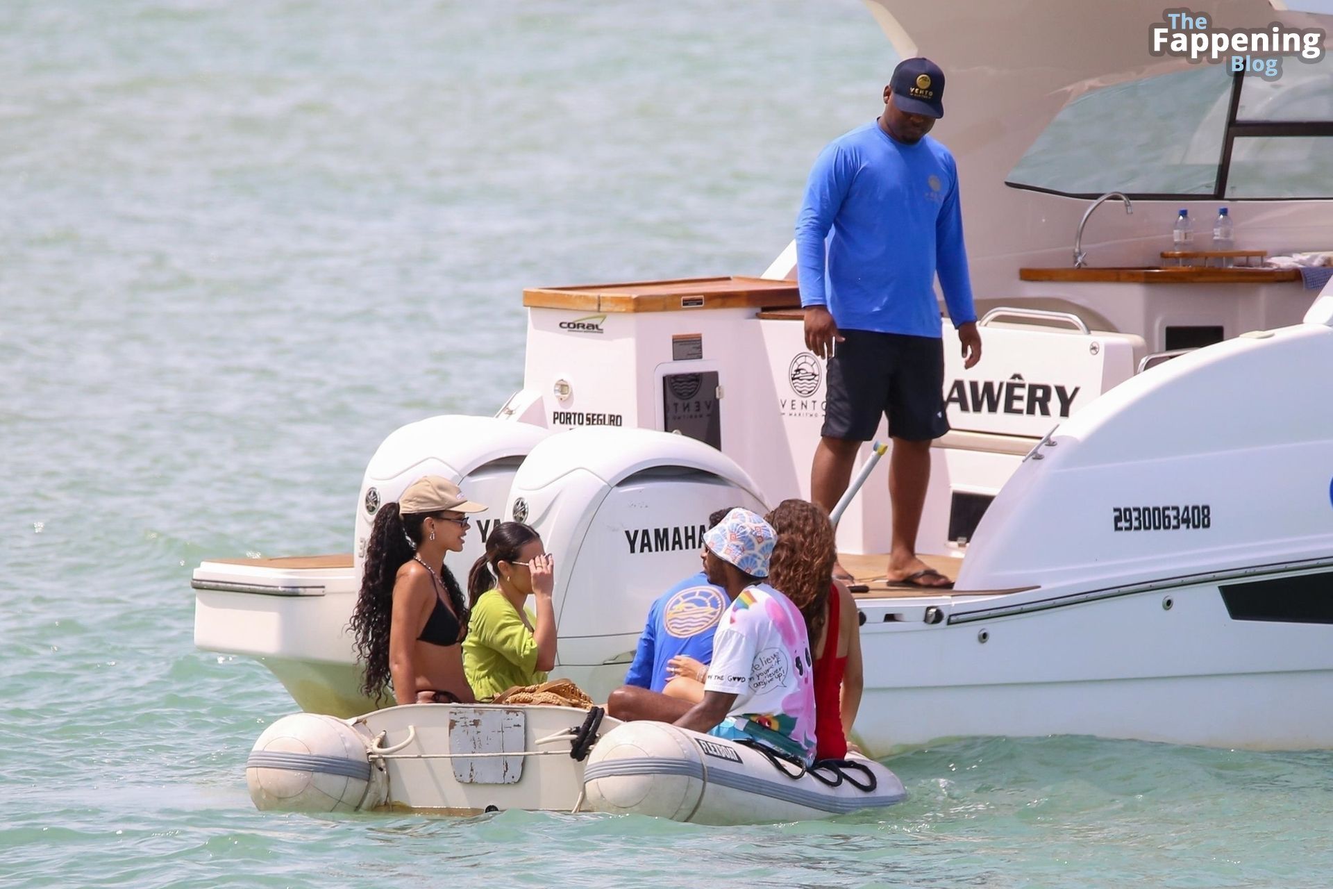 A estrela da Fórmula 1, Lewis Hamilton, e a modelo Juliana Nalu foram fotografados com amigos embarcando em um barco durante as férias em Trancoso, Brasil, 01/01/2024.