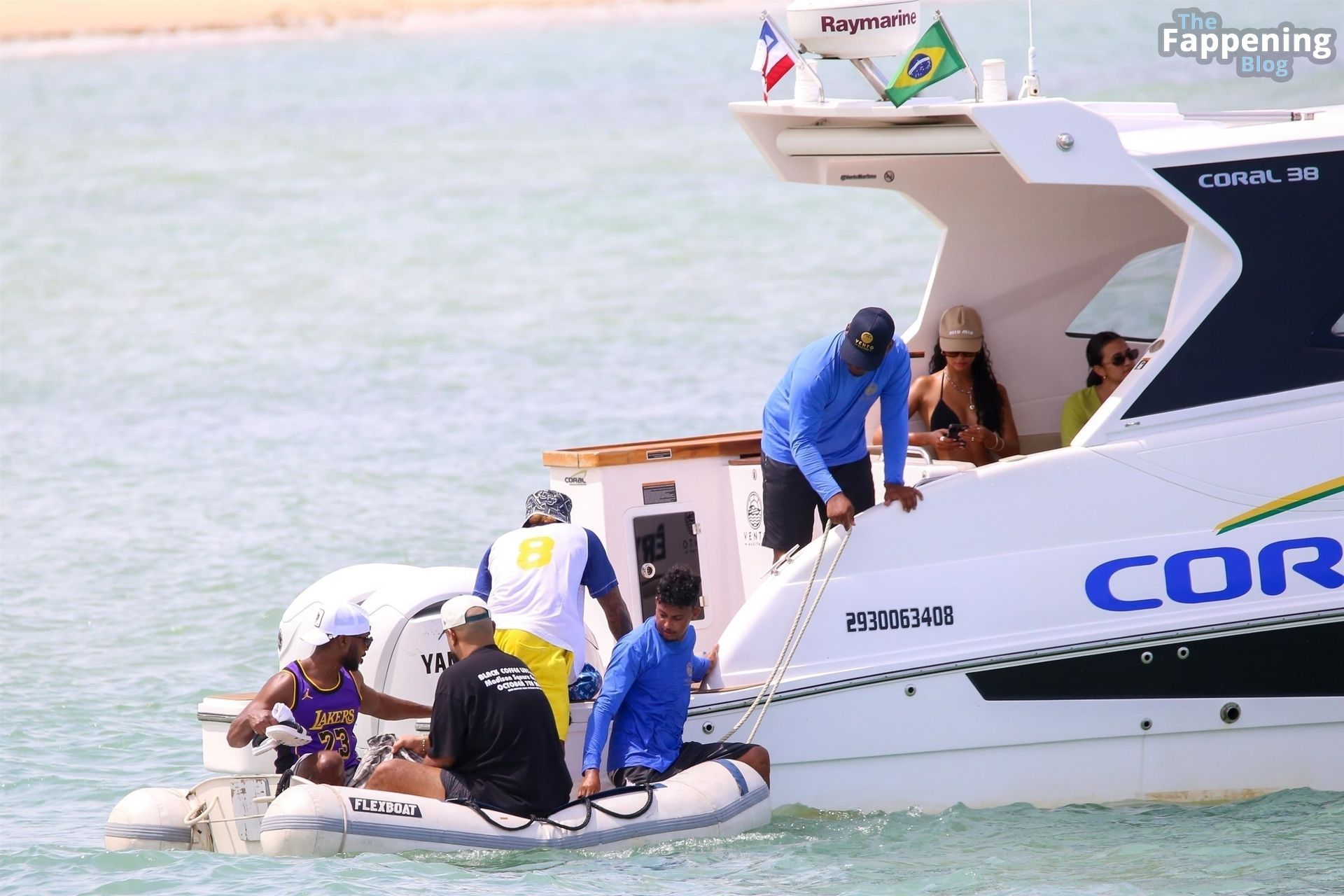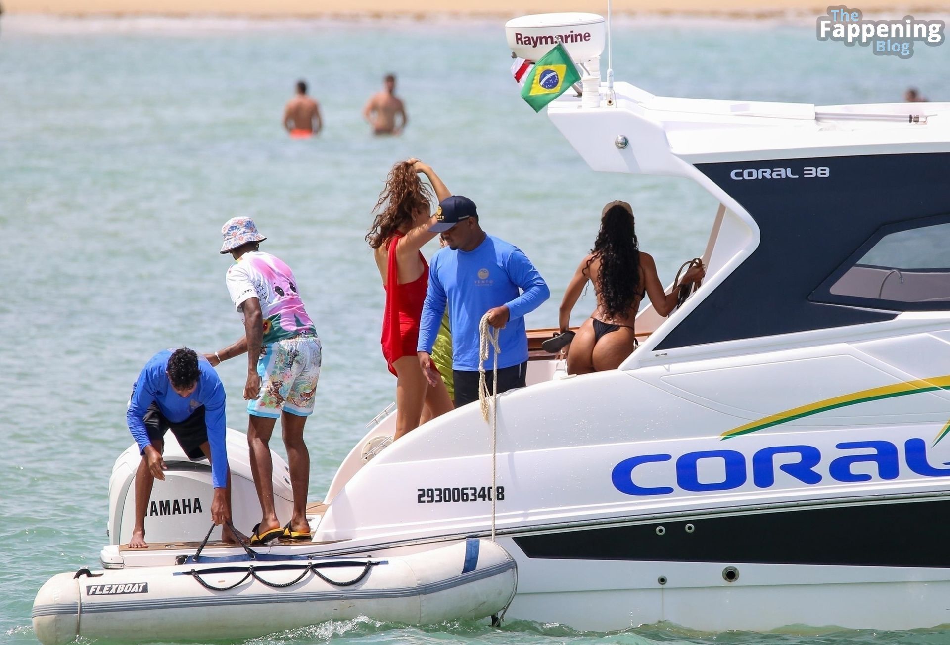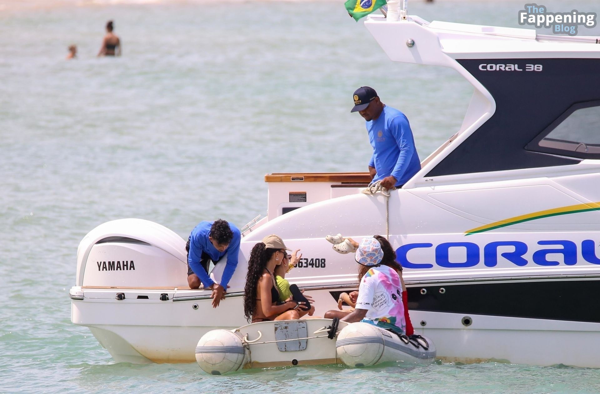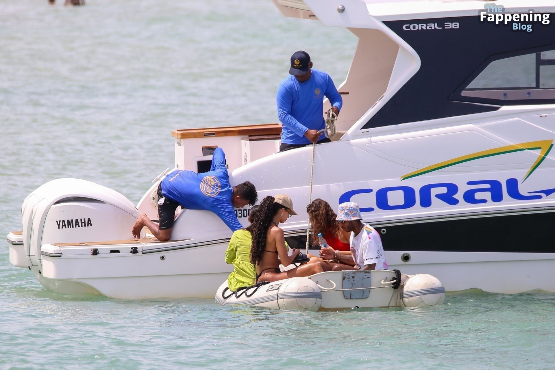 A estrela da Fórmula 1, Lewis Hamilton, e a modelo Juliana Nalu foram fotografados com amigos embarcando em um barco durante as férias em Trancoso, Brasil, 01/01/2024.
