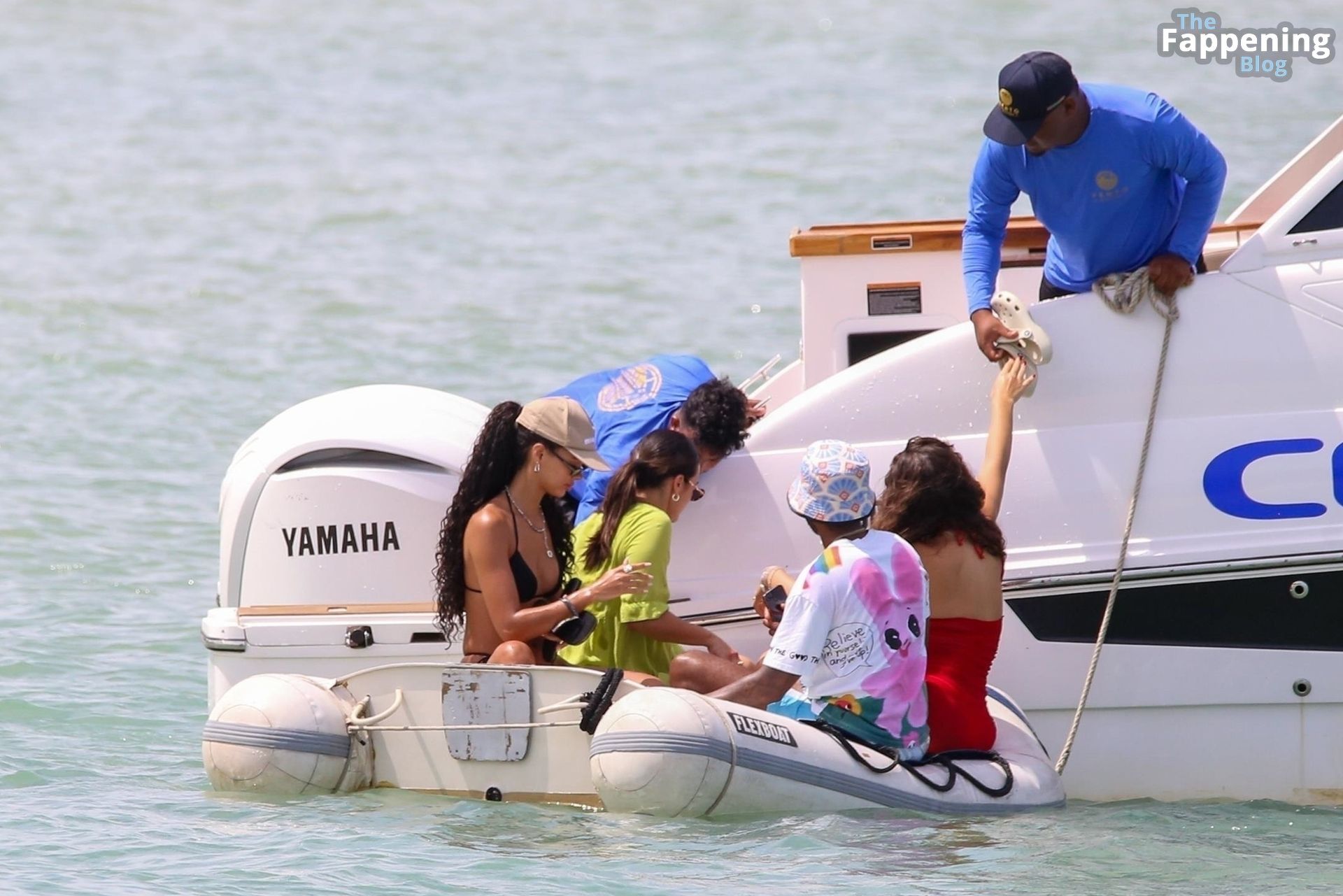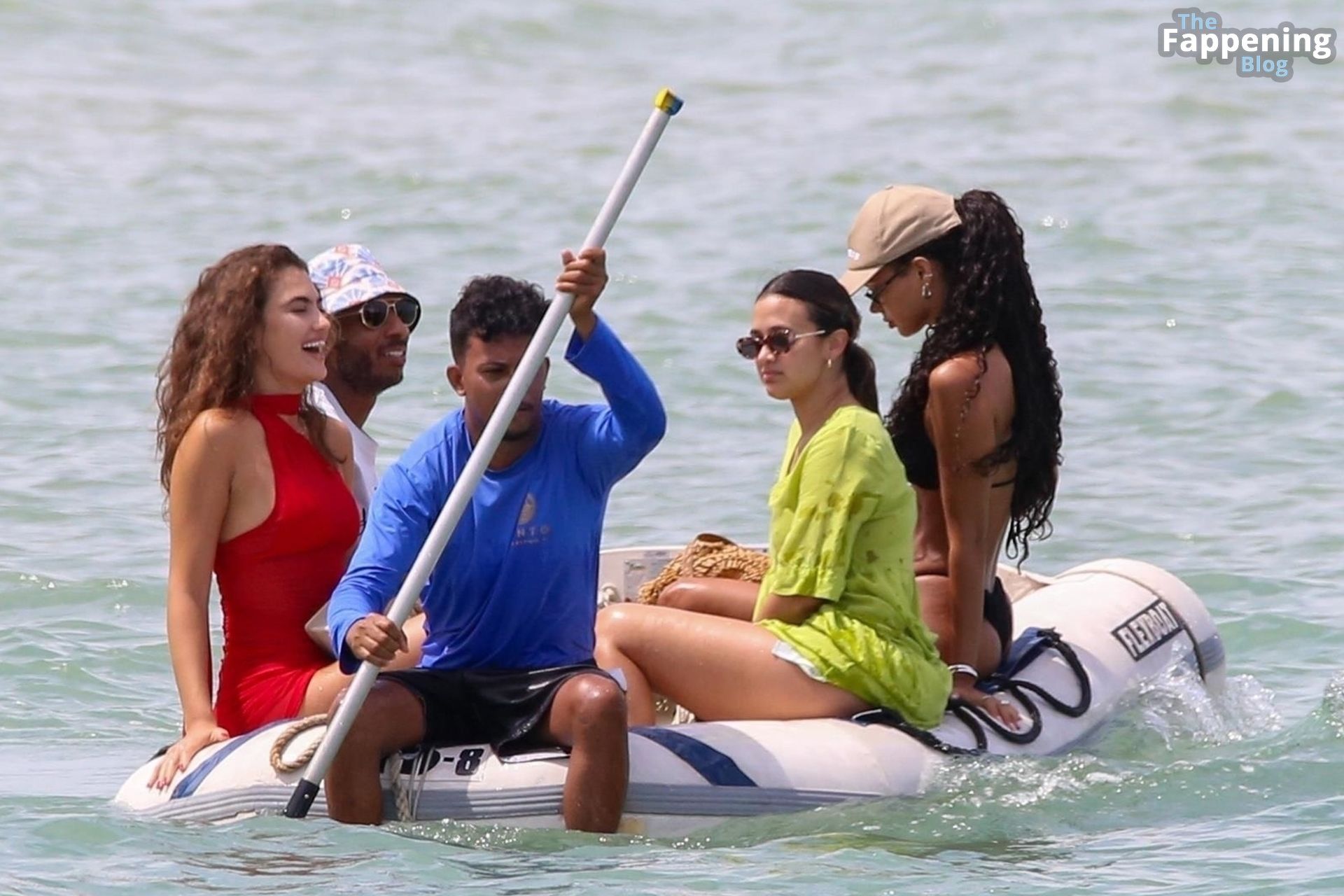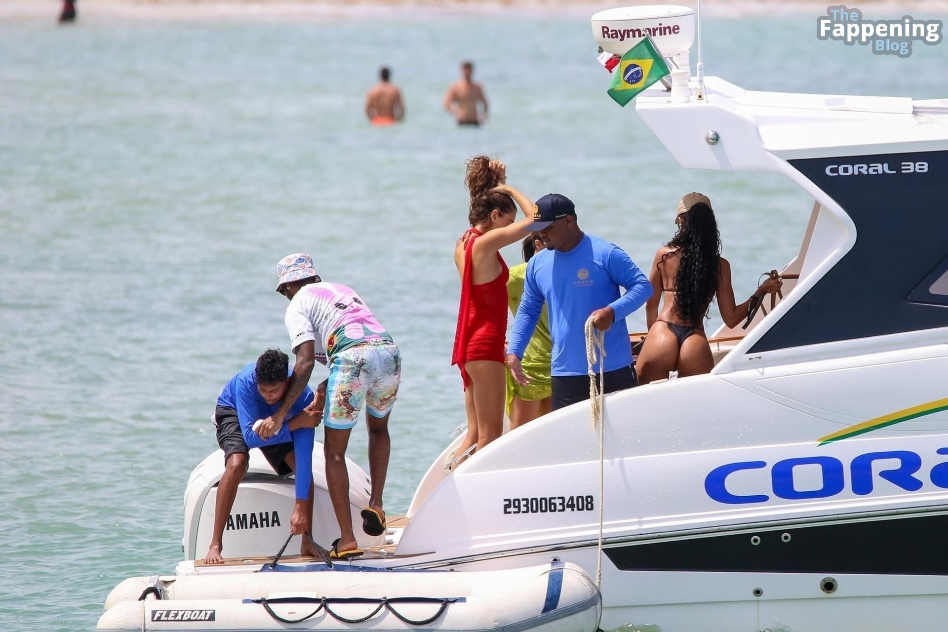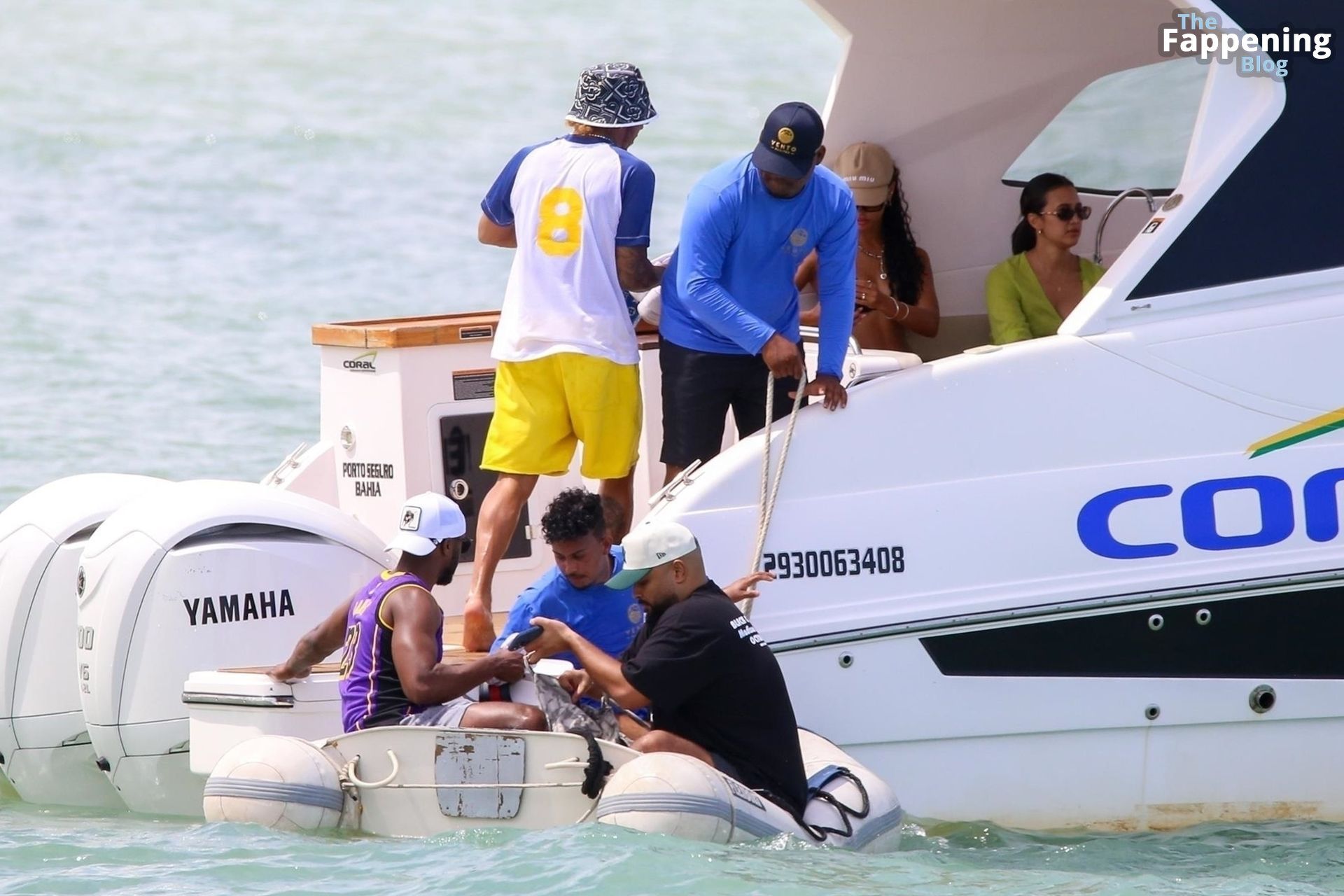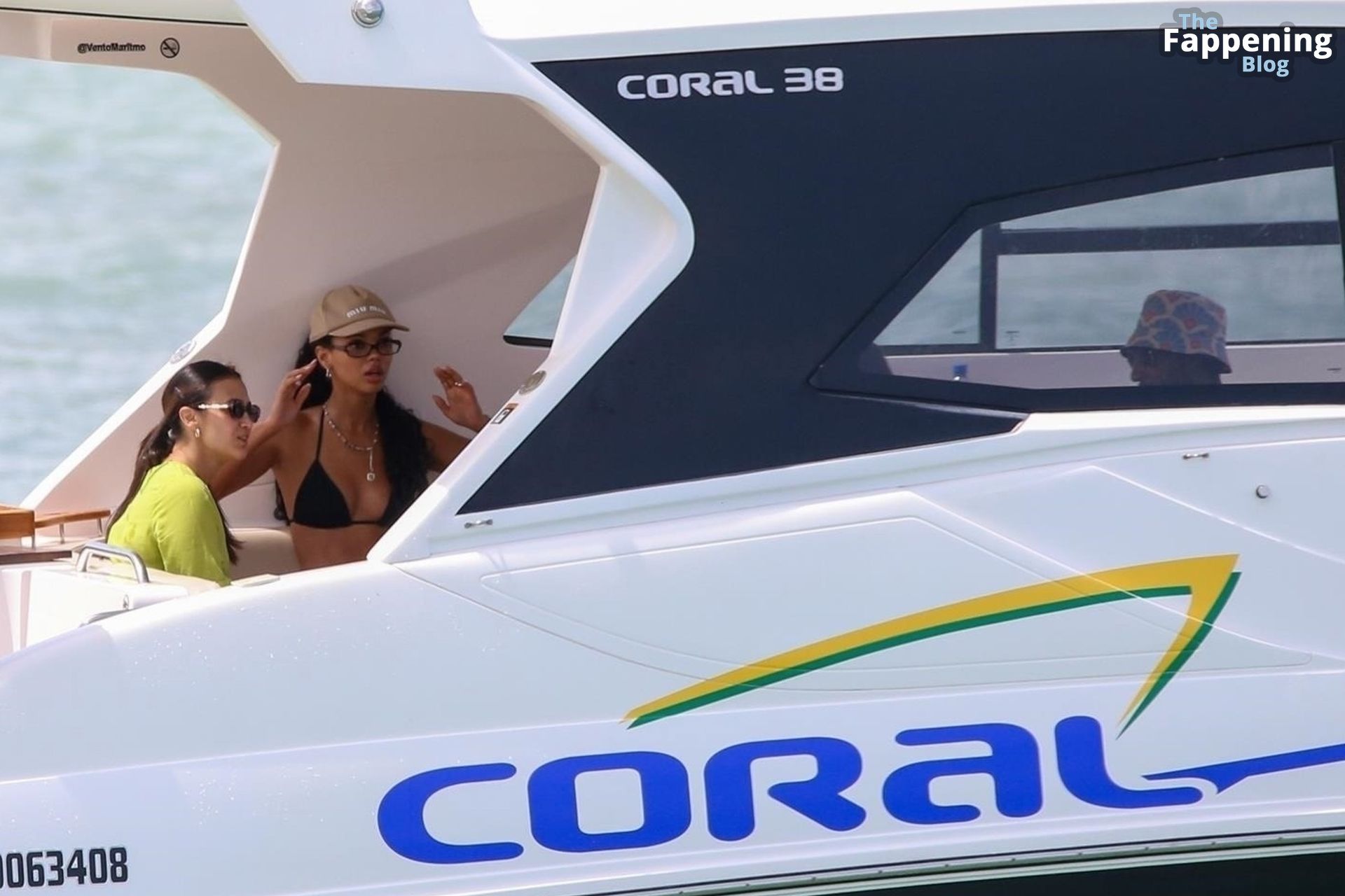 A estrela da Fórmula 1, Lewis Hamilton, e a modelo Juliana Nalu foram fotografados com amigos embarcando em um barco durante as férias em Trancoso, Brasil, 01/01/2024.