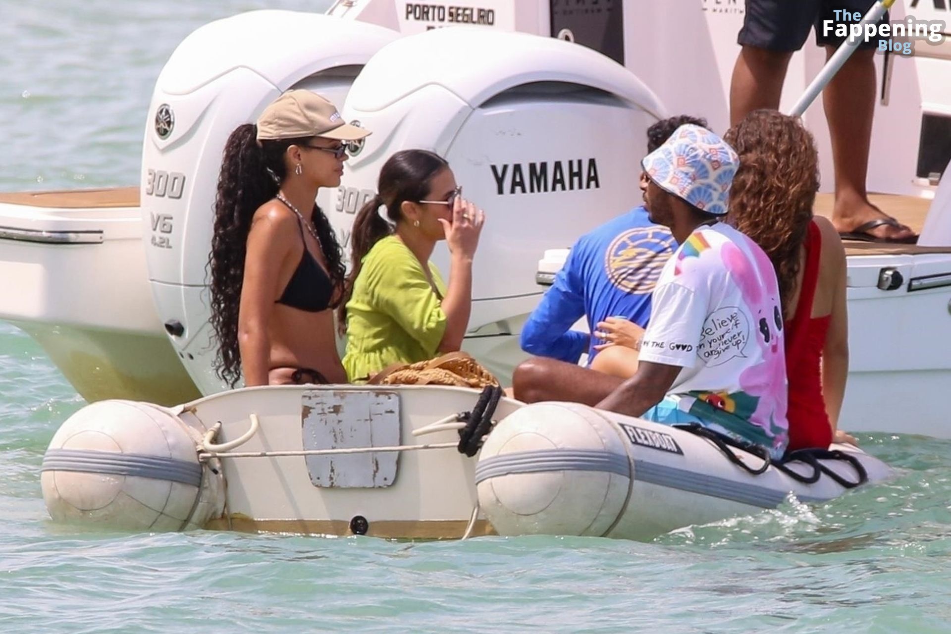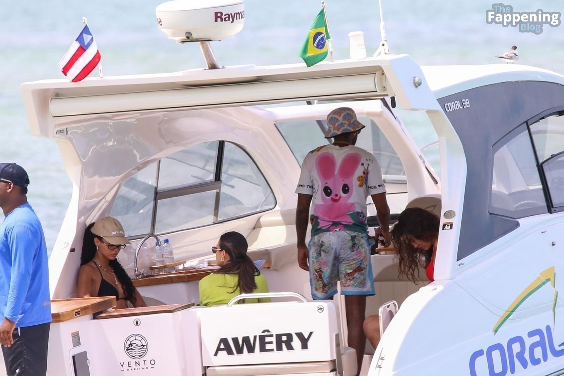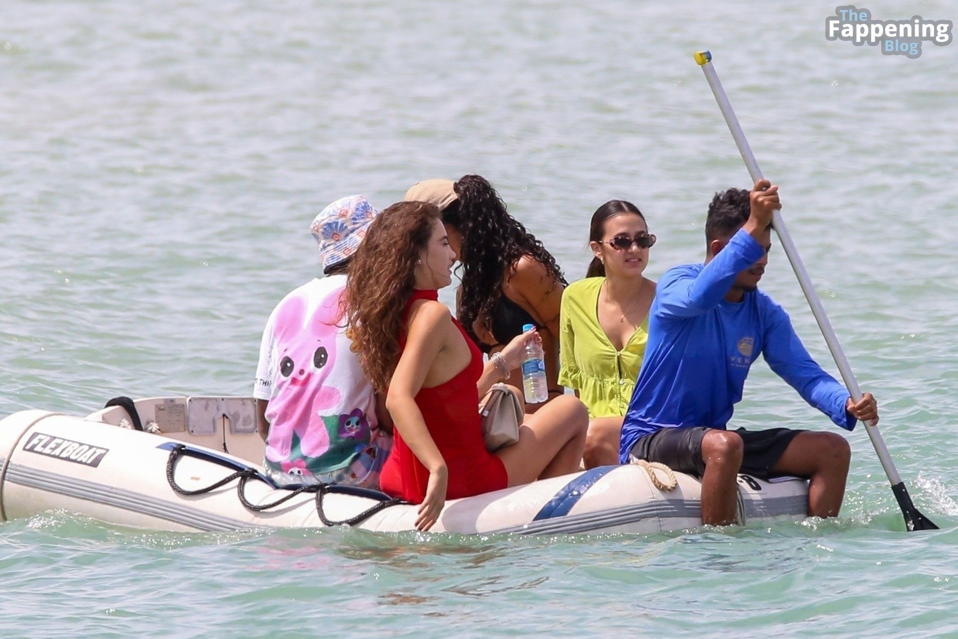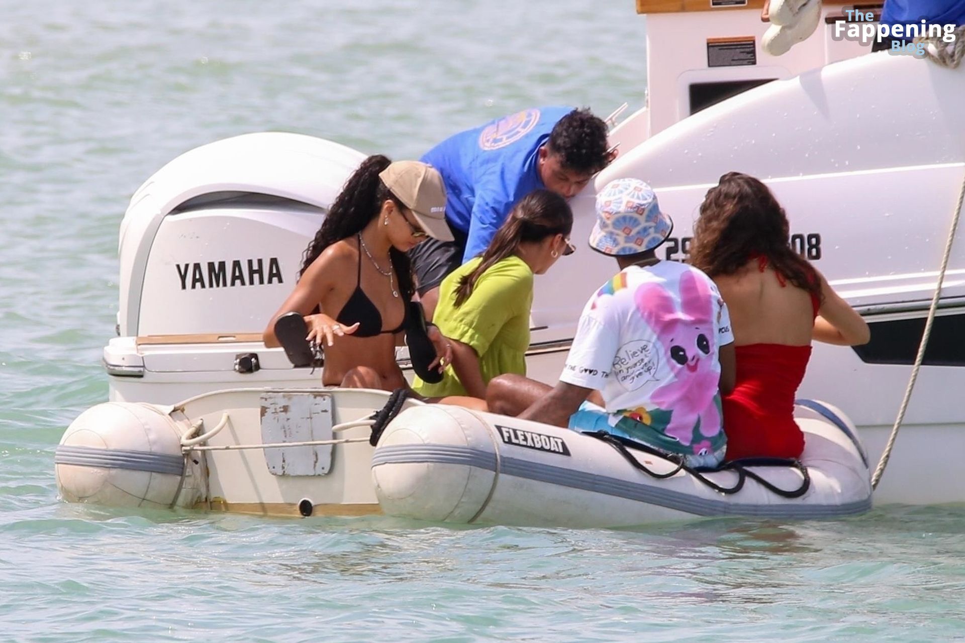 A estrela da Fórmula 1, Lewis Hamilton, e a modelo Juliana Nalu foram fotografados com amigos embarcando em um barco durante as férias em Trancoso, Brasil, 01/01/2024.