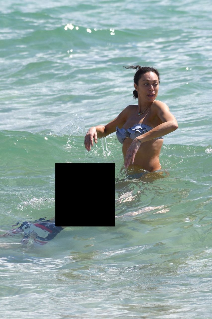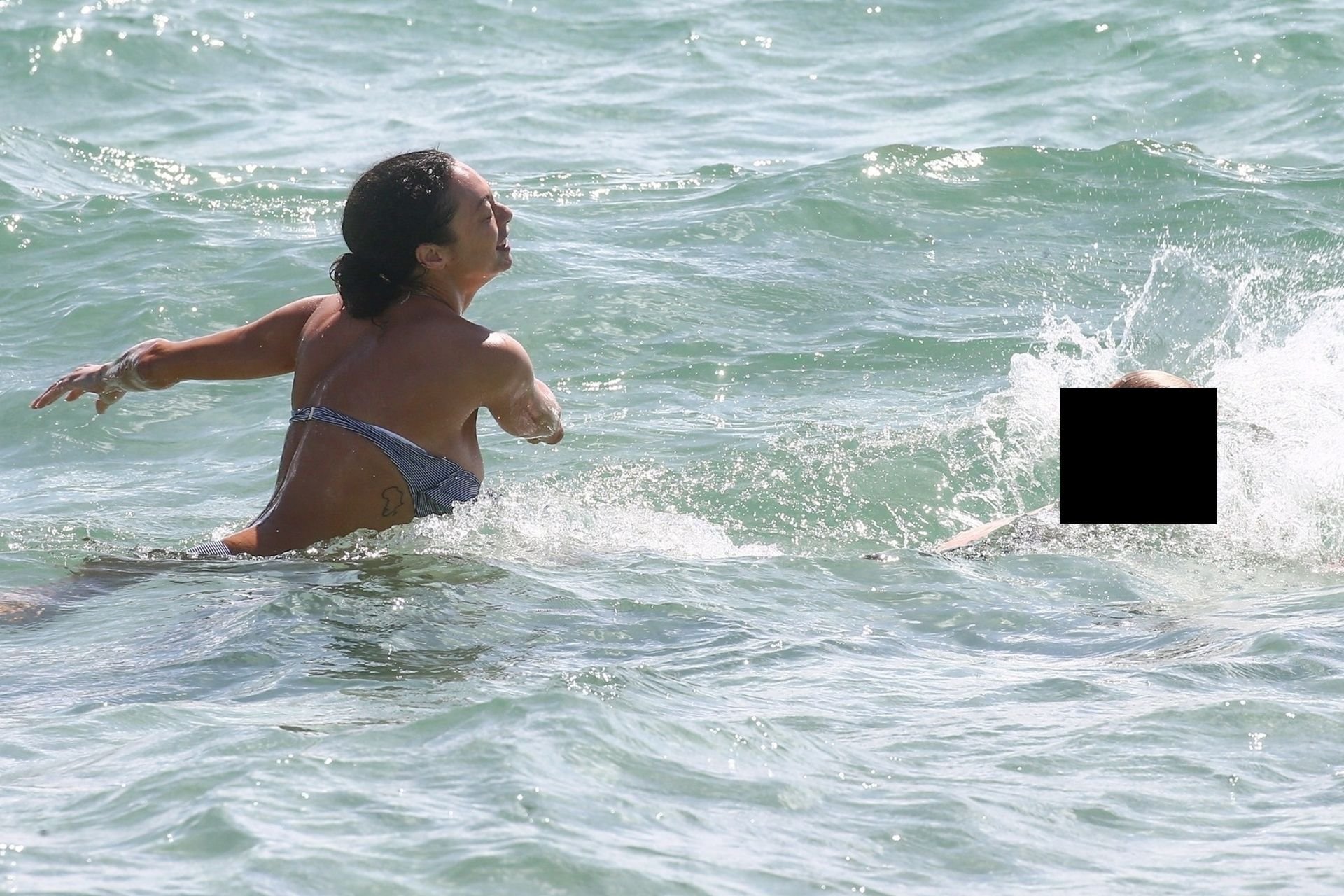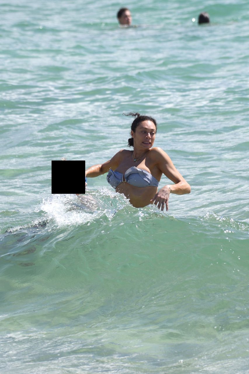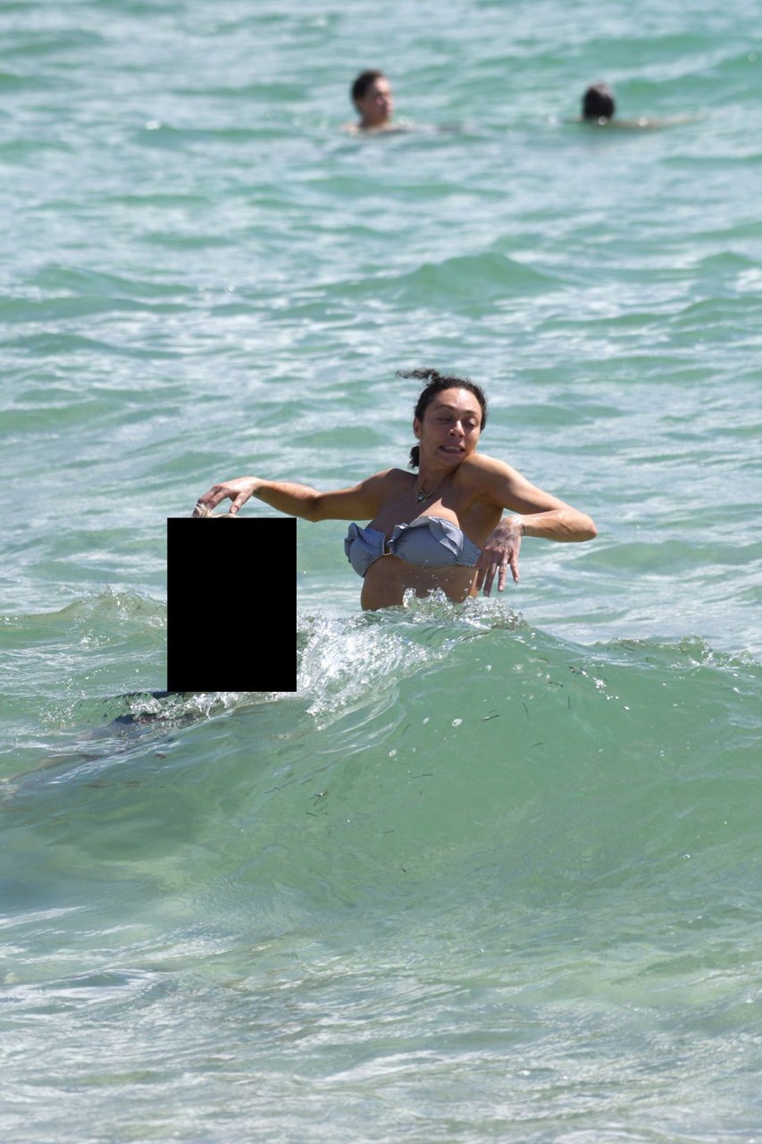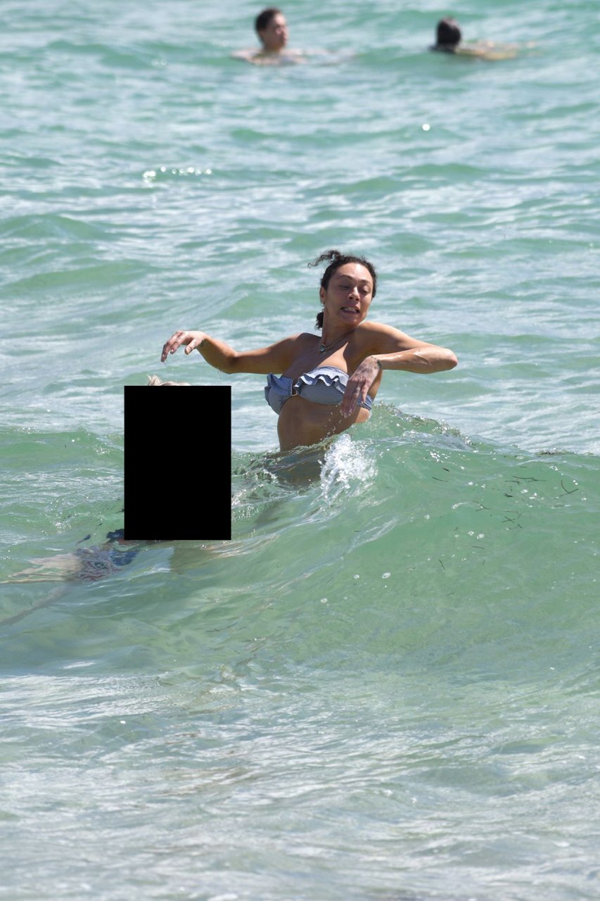 Recém-solteira, Lilly Becker tem um grande problema de guarda-roupa com um top de biquíni proibido enquanto curte as ondas em Miami, 12/04/2019.