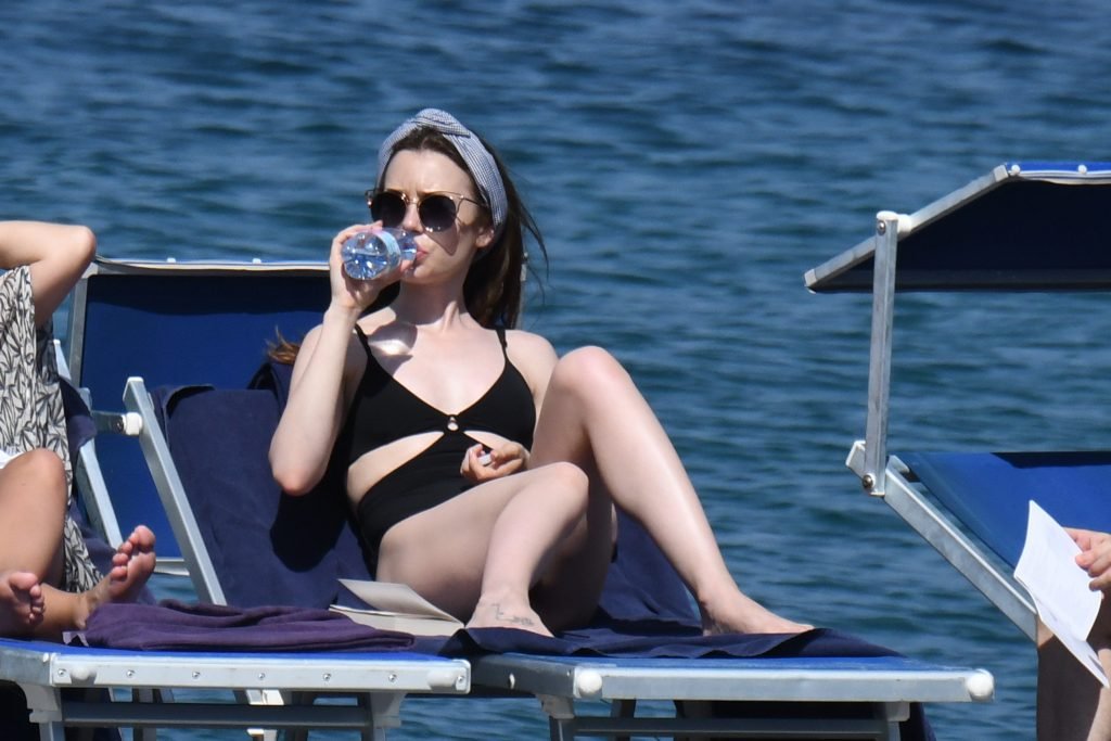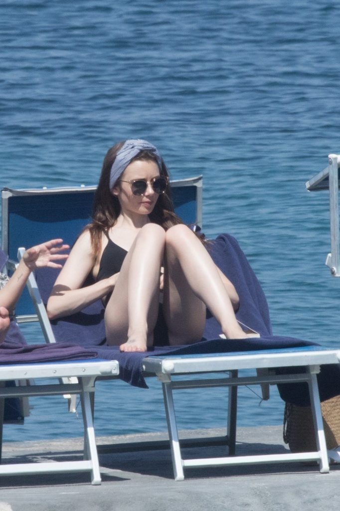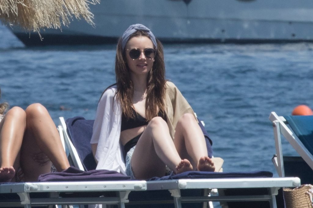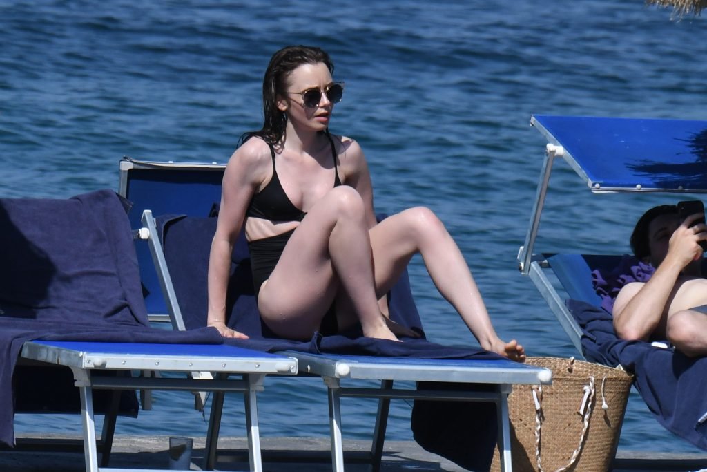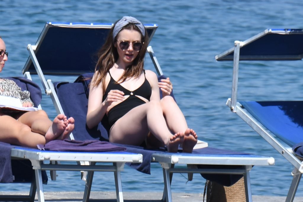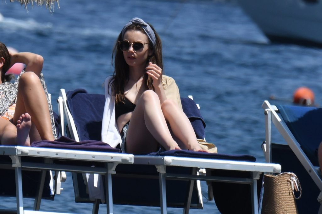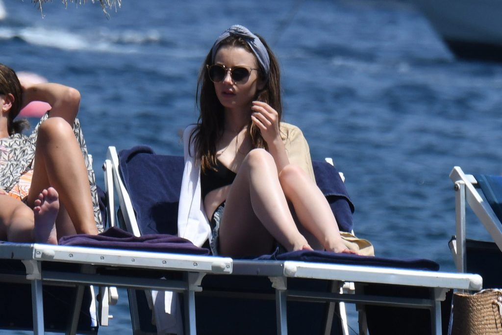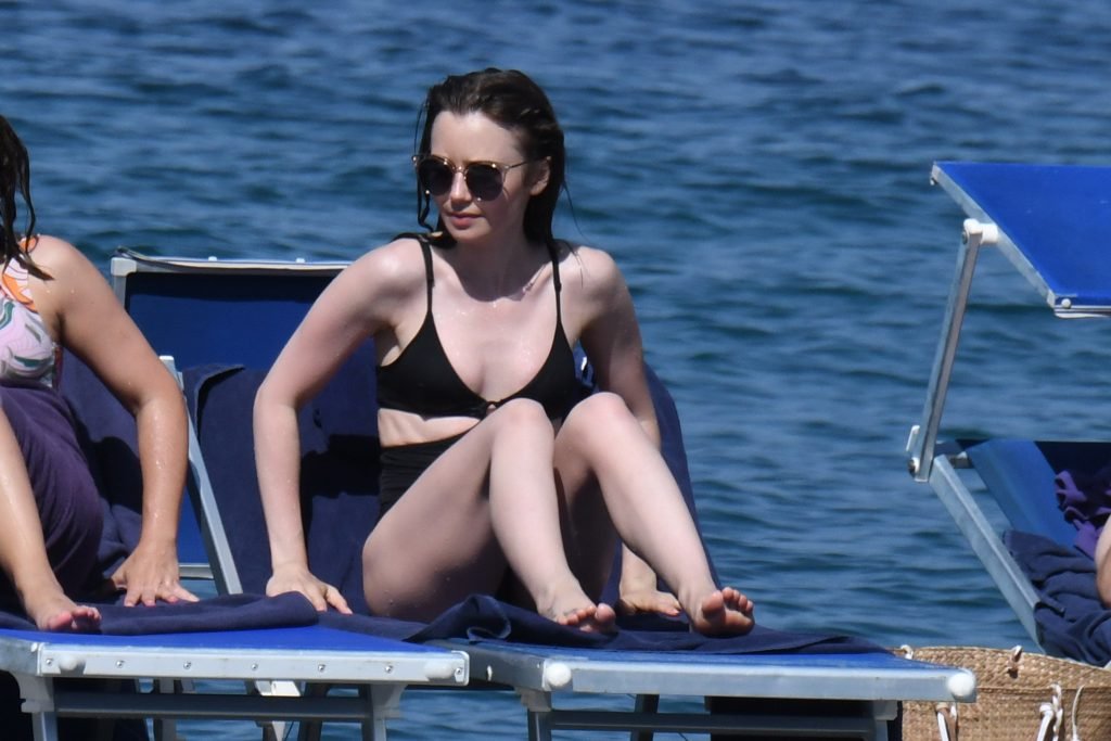 Lily Collins foi vista relaxando no Hotel Regina Isabella em Ischia Porto, Itália, 15/07/2018. A atriz de 29 anos foi vista usando um maiô preto.