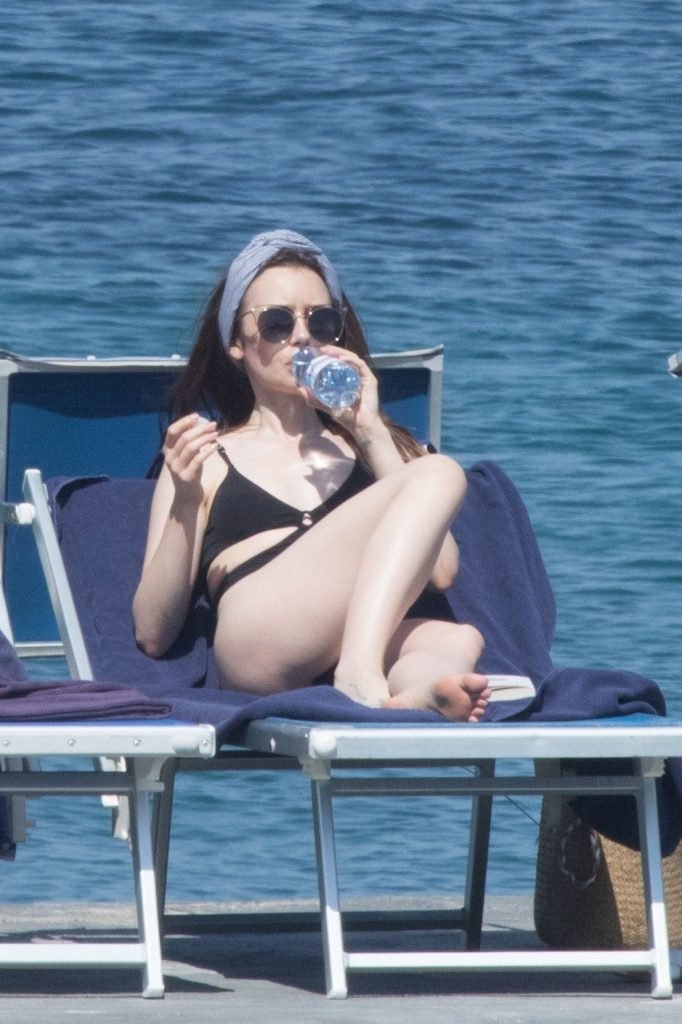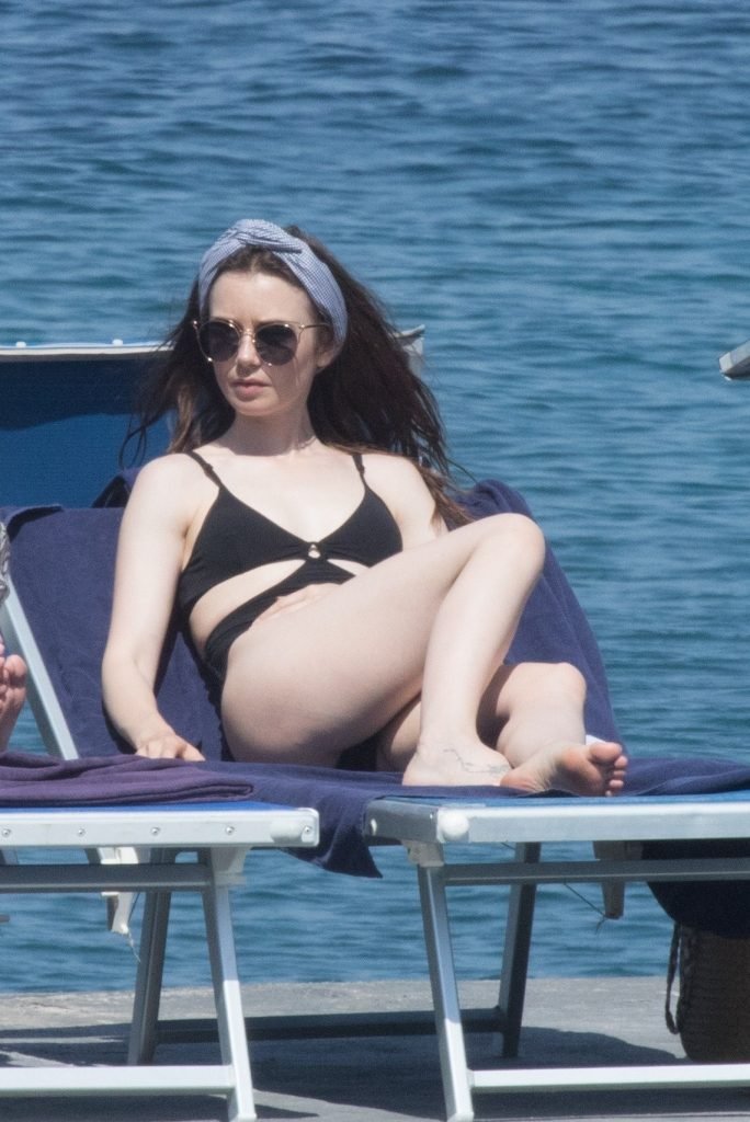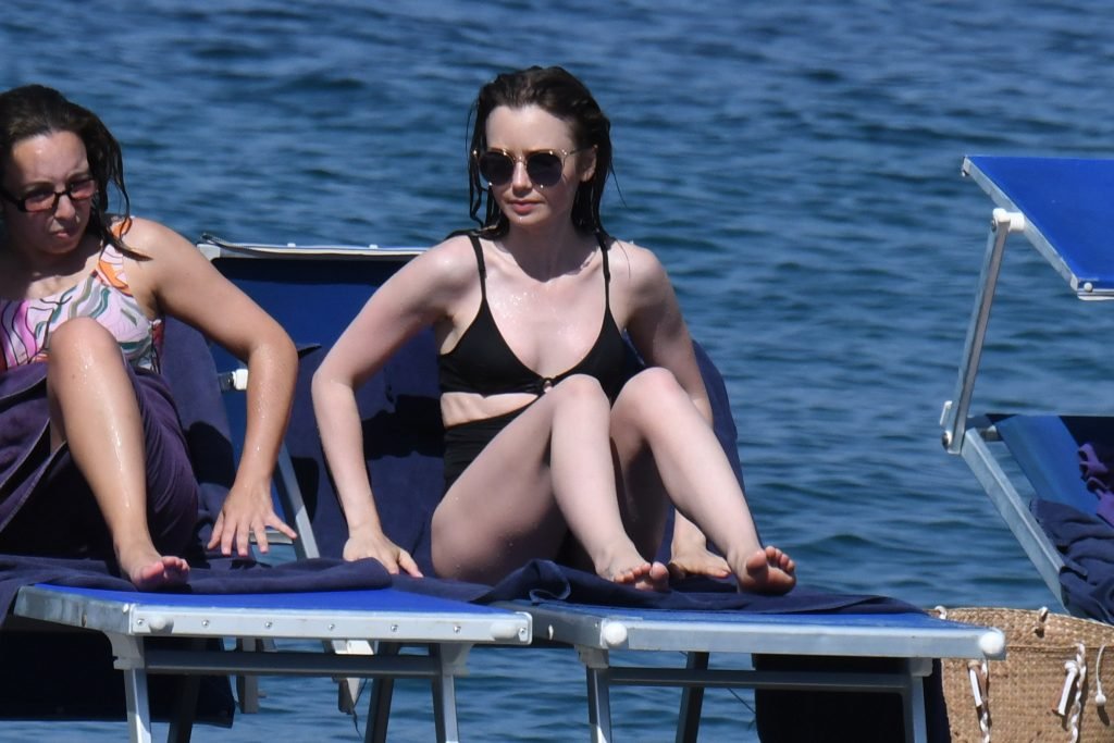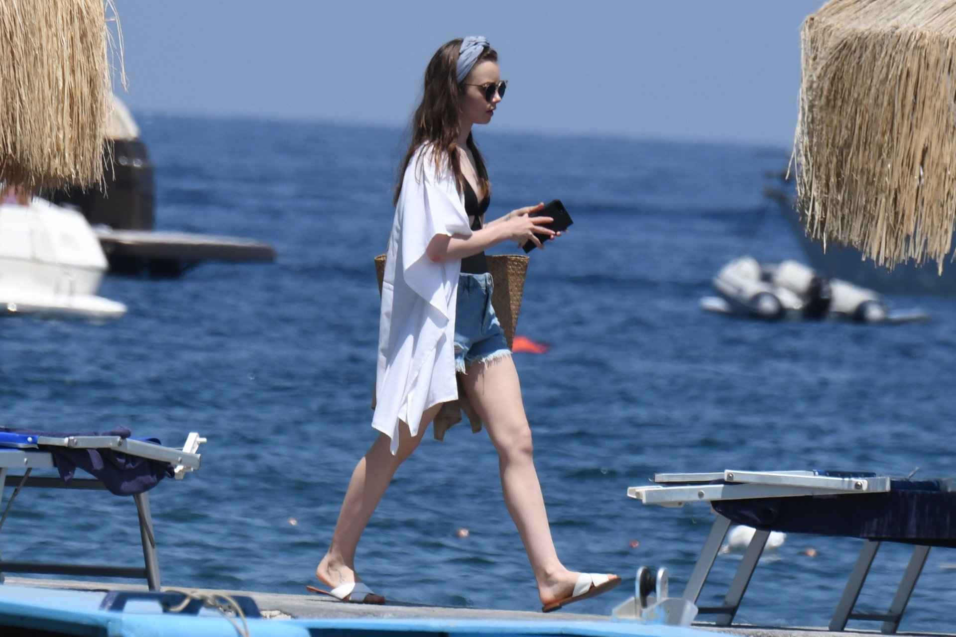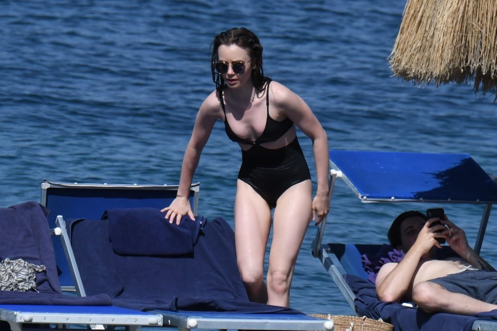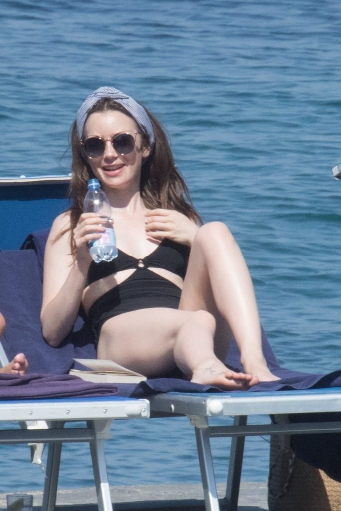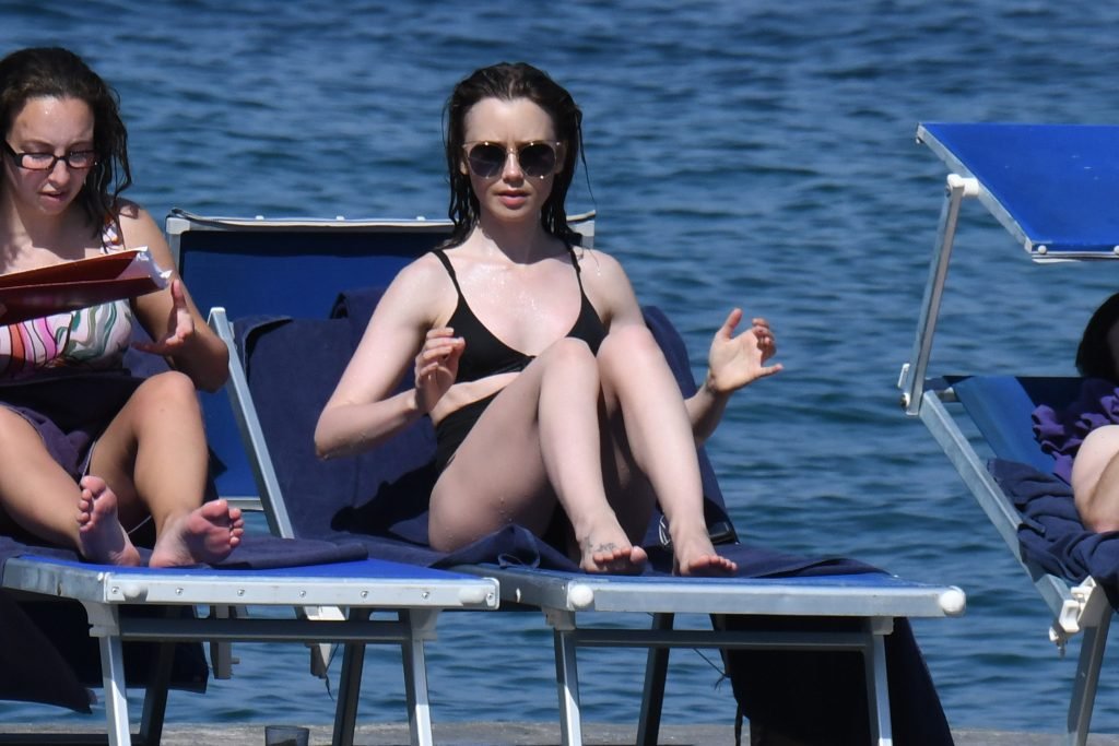 Lily Collins foi vista relaxando no Hotel Regina Isabella em Ischia Porto, Itália, 15/07/2018. A atriz de 29 anos foi vista usando um maiô preto.