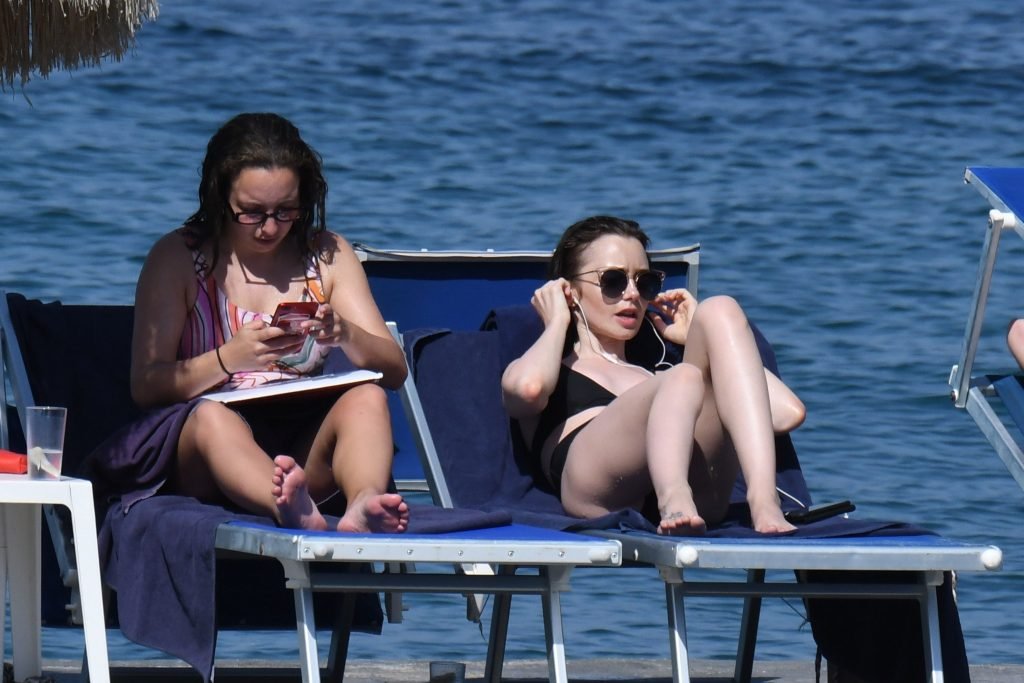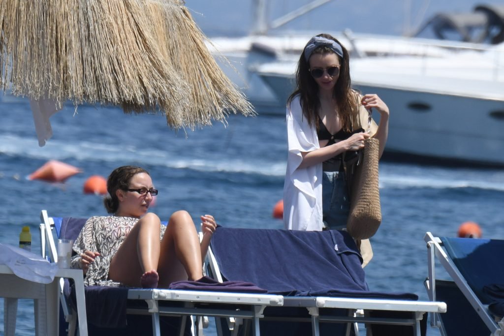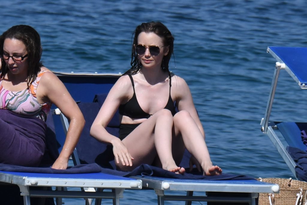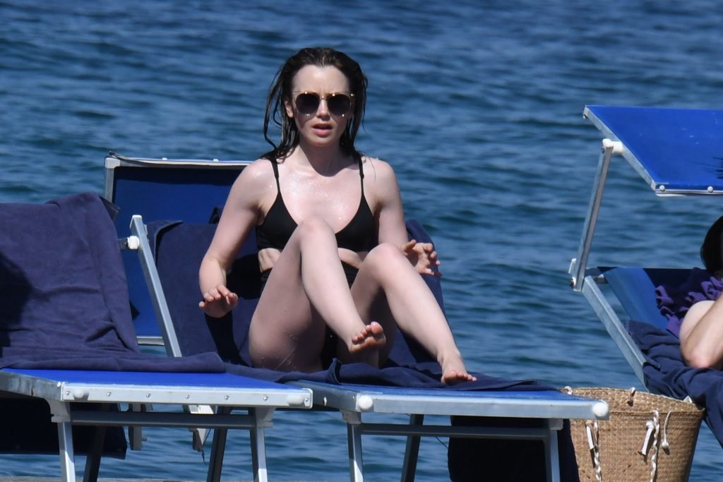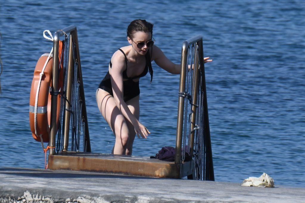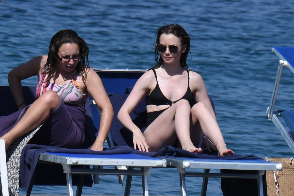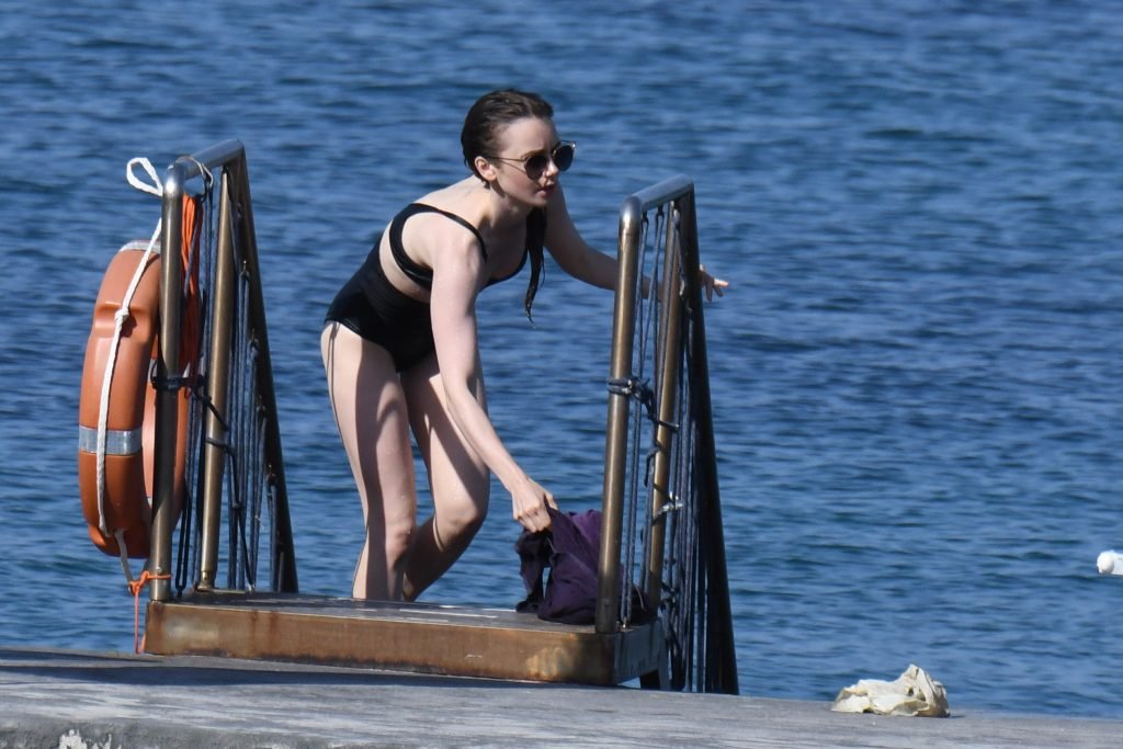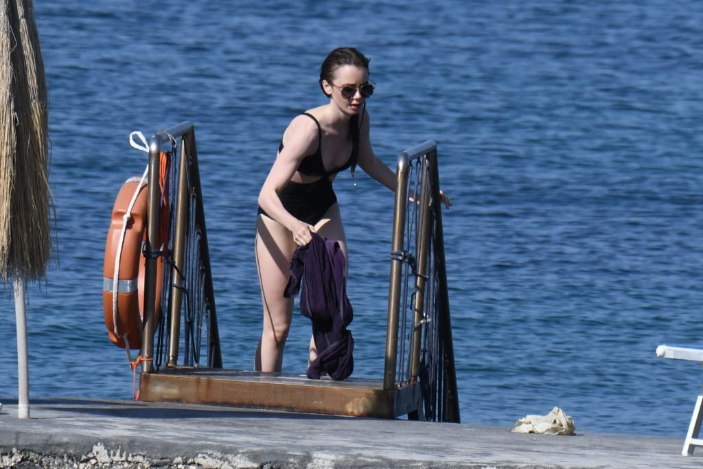 Lily Collins foi vista relaxando no Hotel Regina Isabella em Ischia Porto, Itália, 15/07/2018. A atriz de 29 anos foi vista usando um maiô preto.