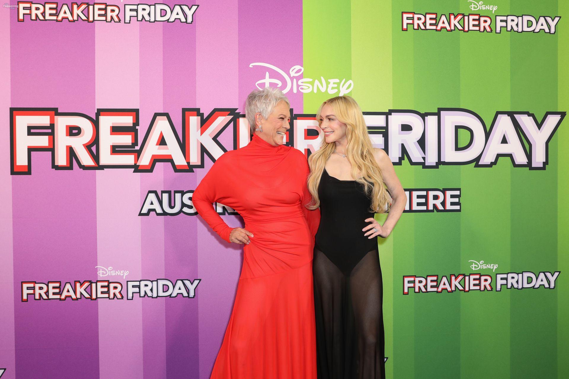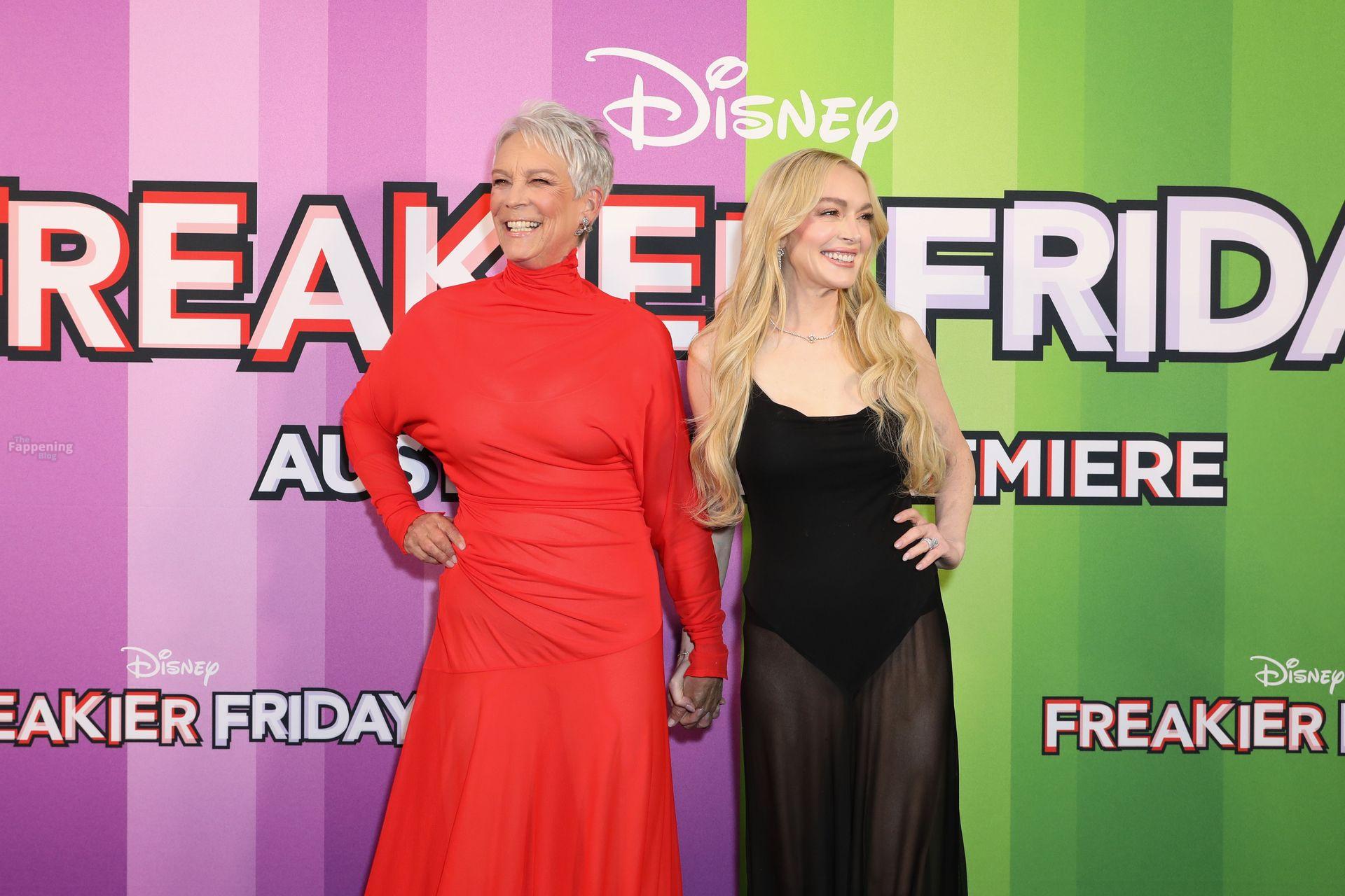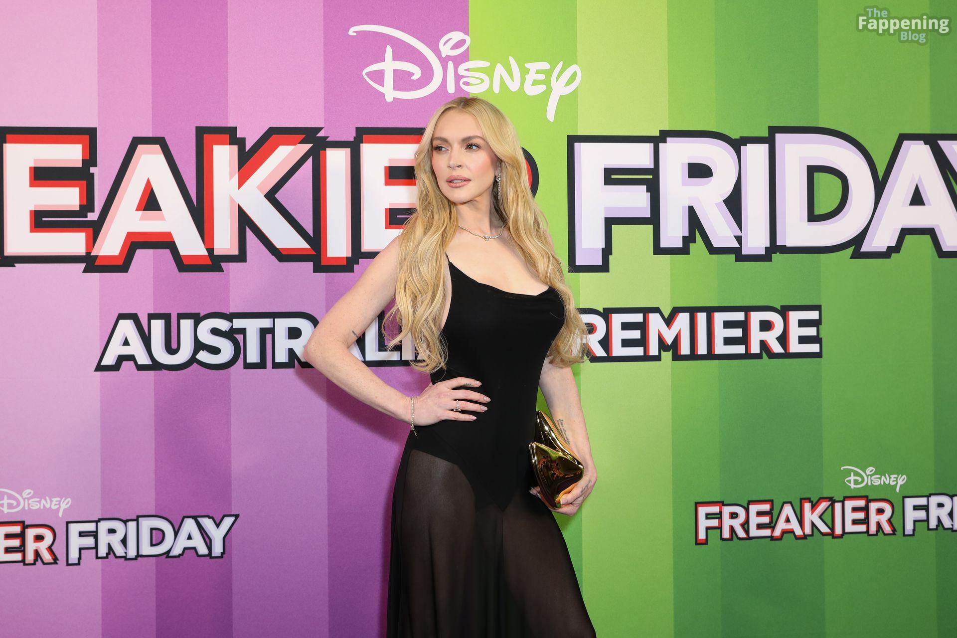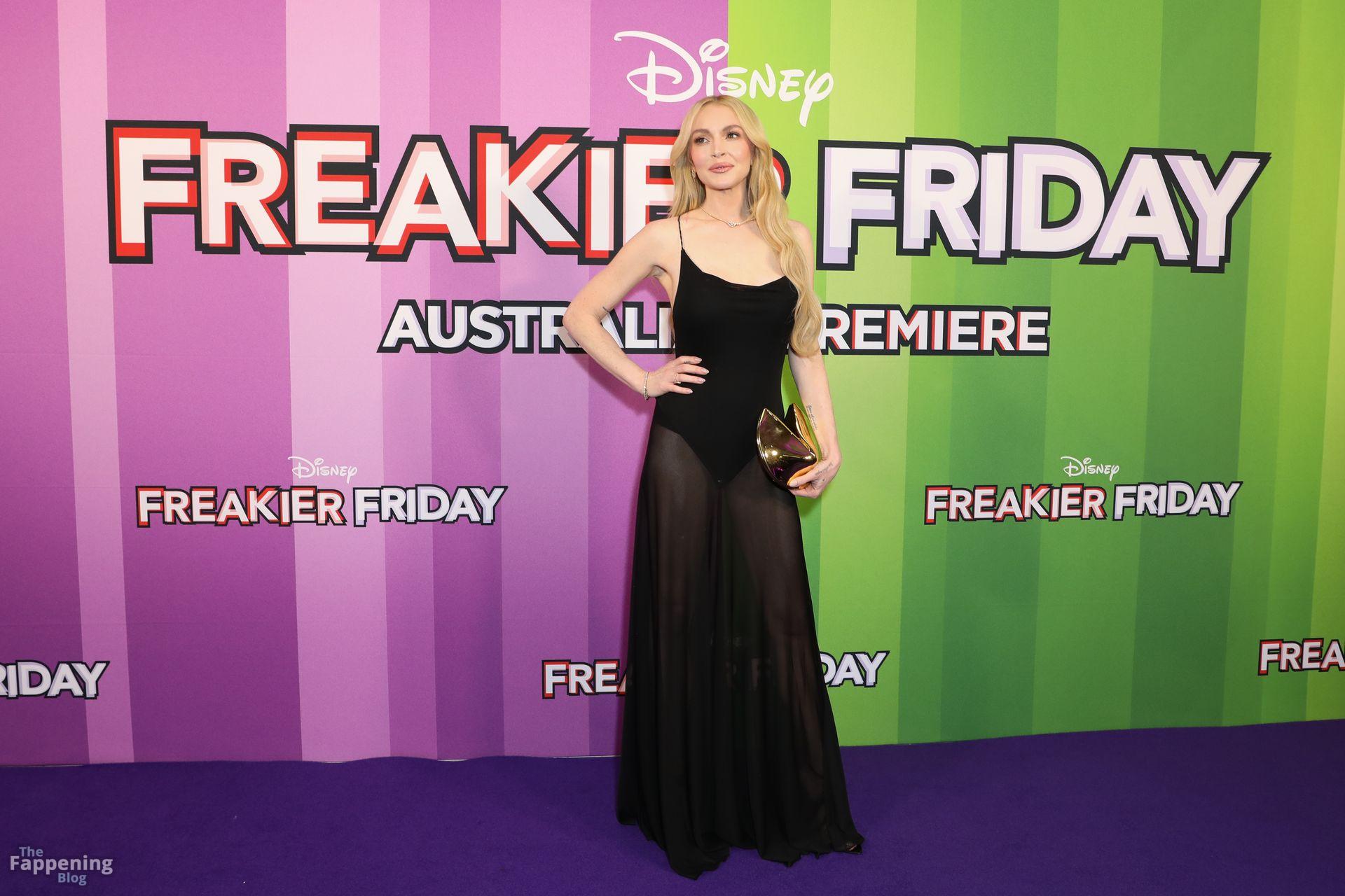 Lindsay Lohan exibe sua nova silhueta esbelta na premiere de “Freakier Friday” em Sydney, Austrália, arrasando com um vestido preto transparente.