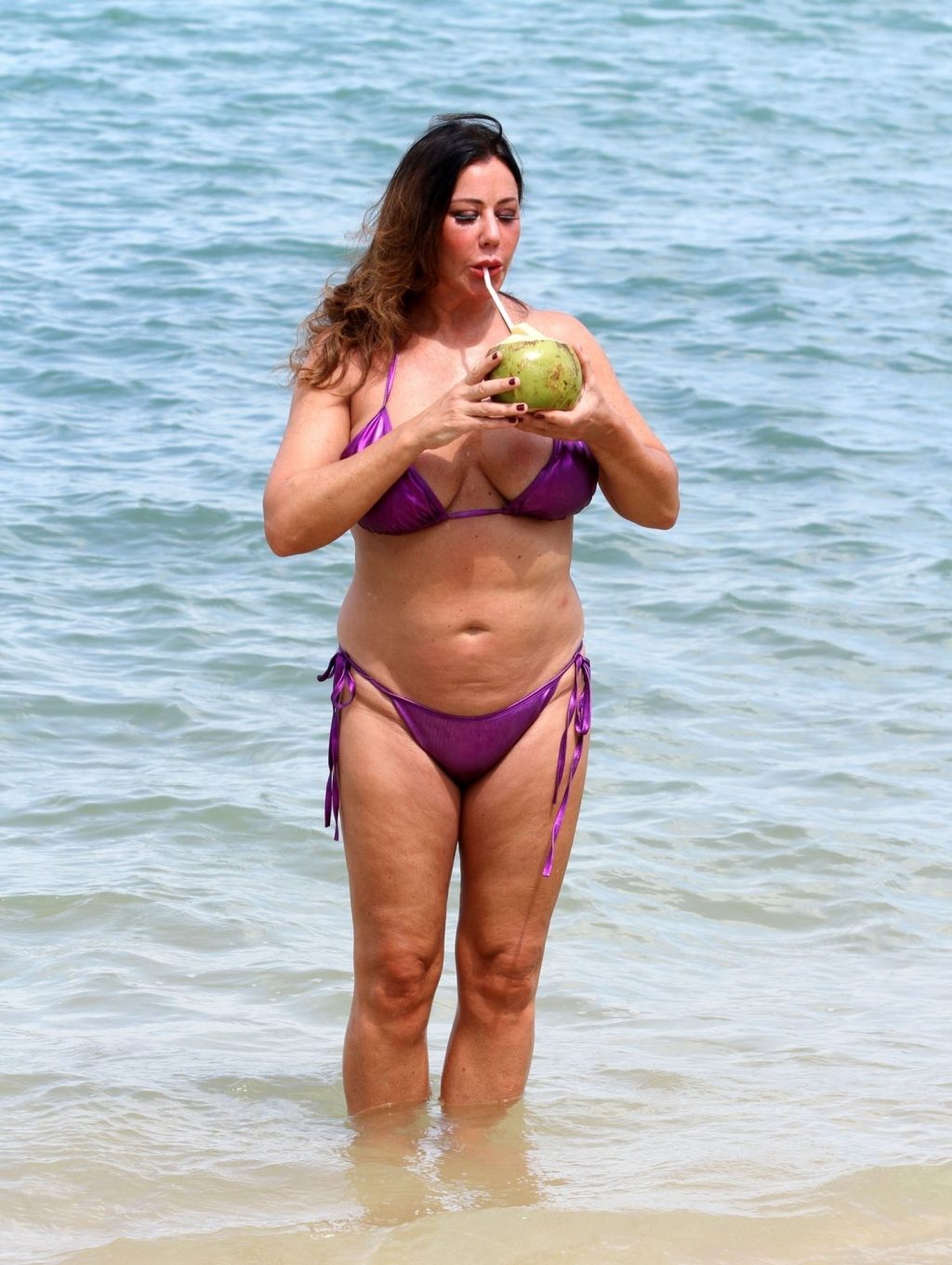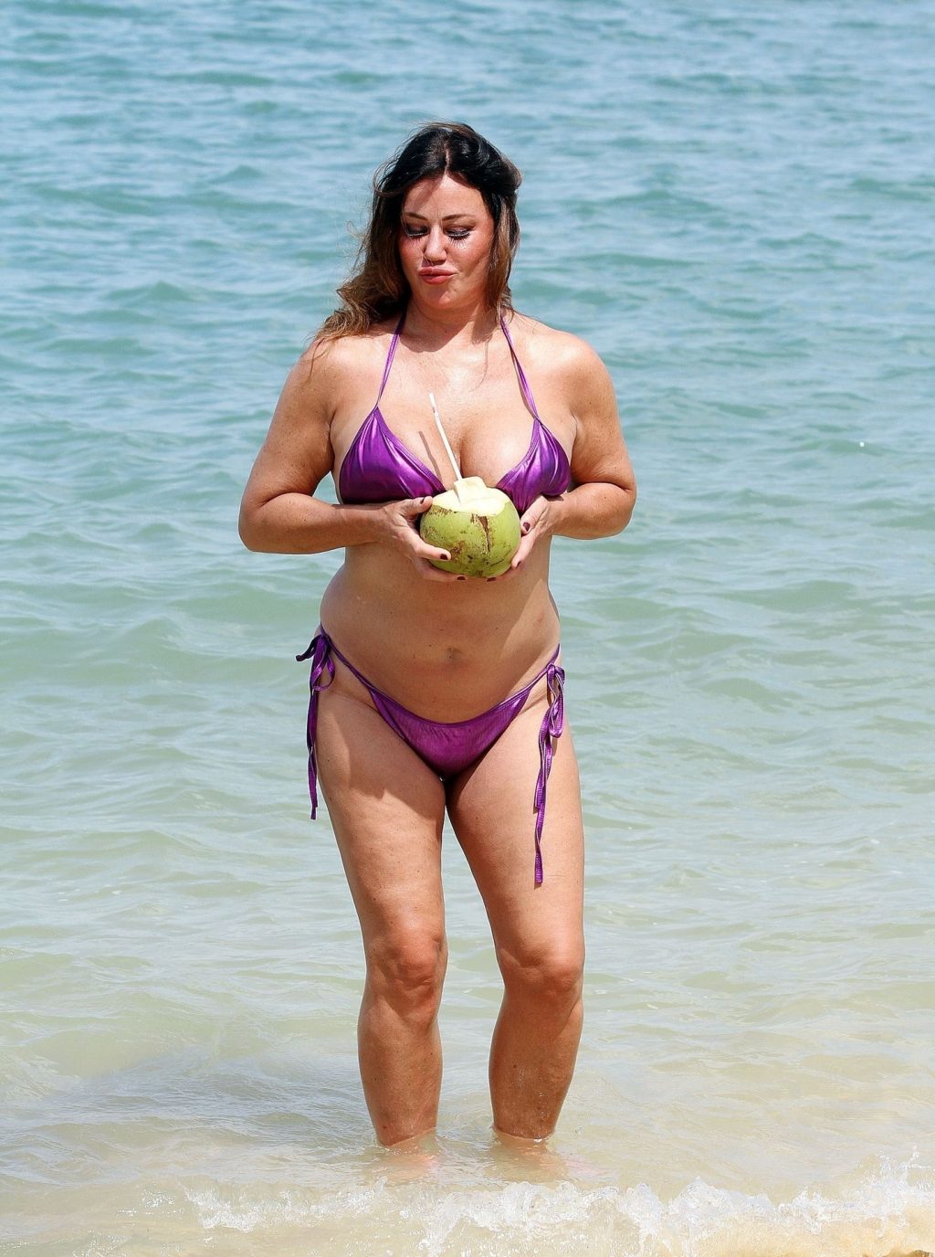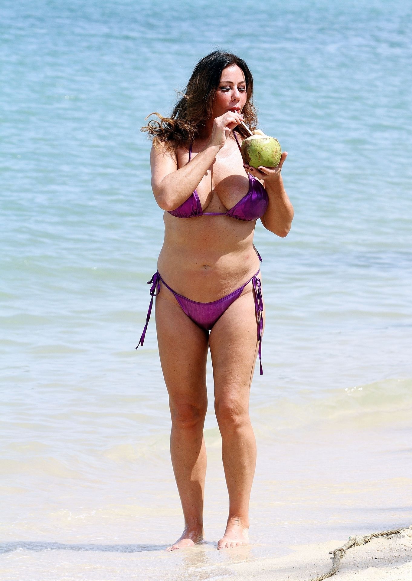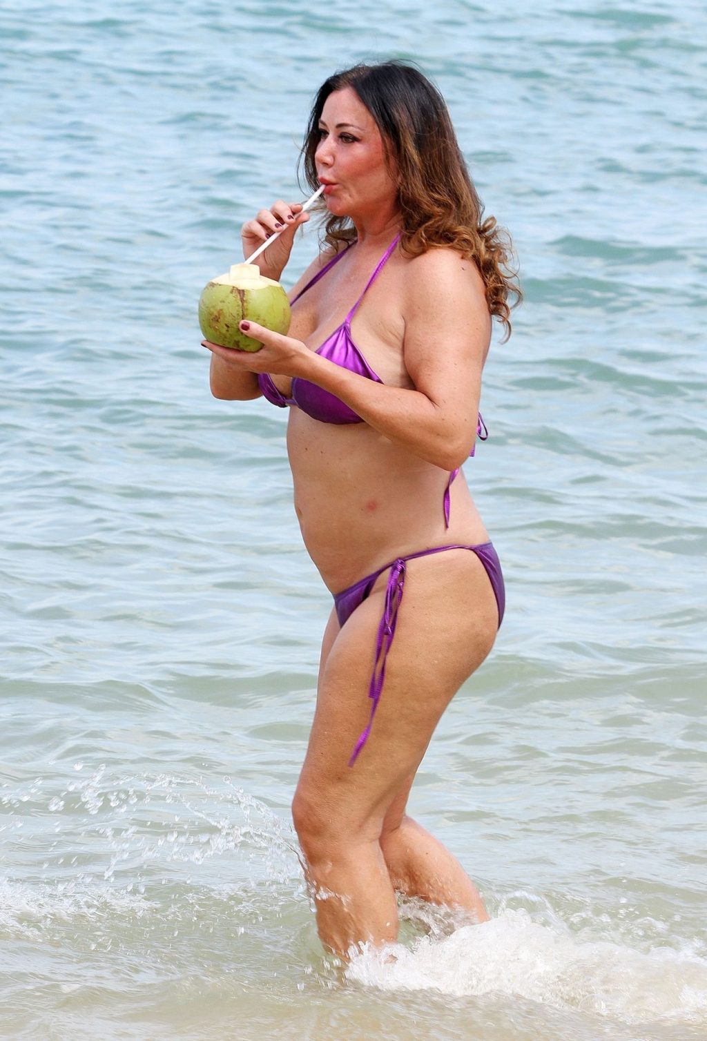 A estrela de reality show Lisa Appleton exibe seu corpo de praia em um biquíni roxo brilhante enquanto relaxa na praia, aproveitando uma bebida de coco durante as férias na Tailândia, 24/11/2019.