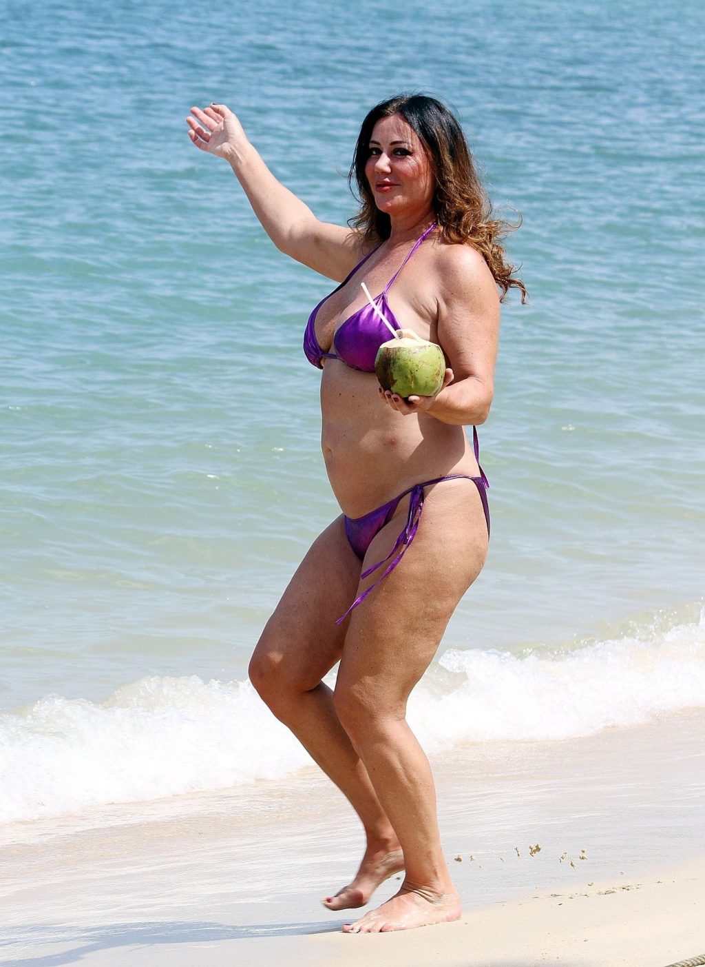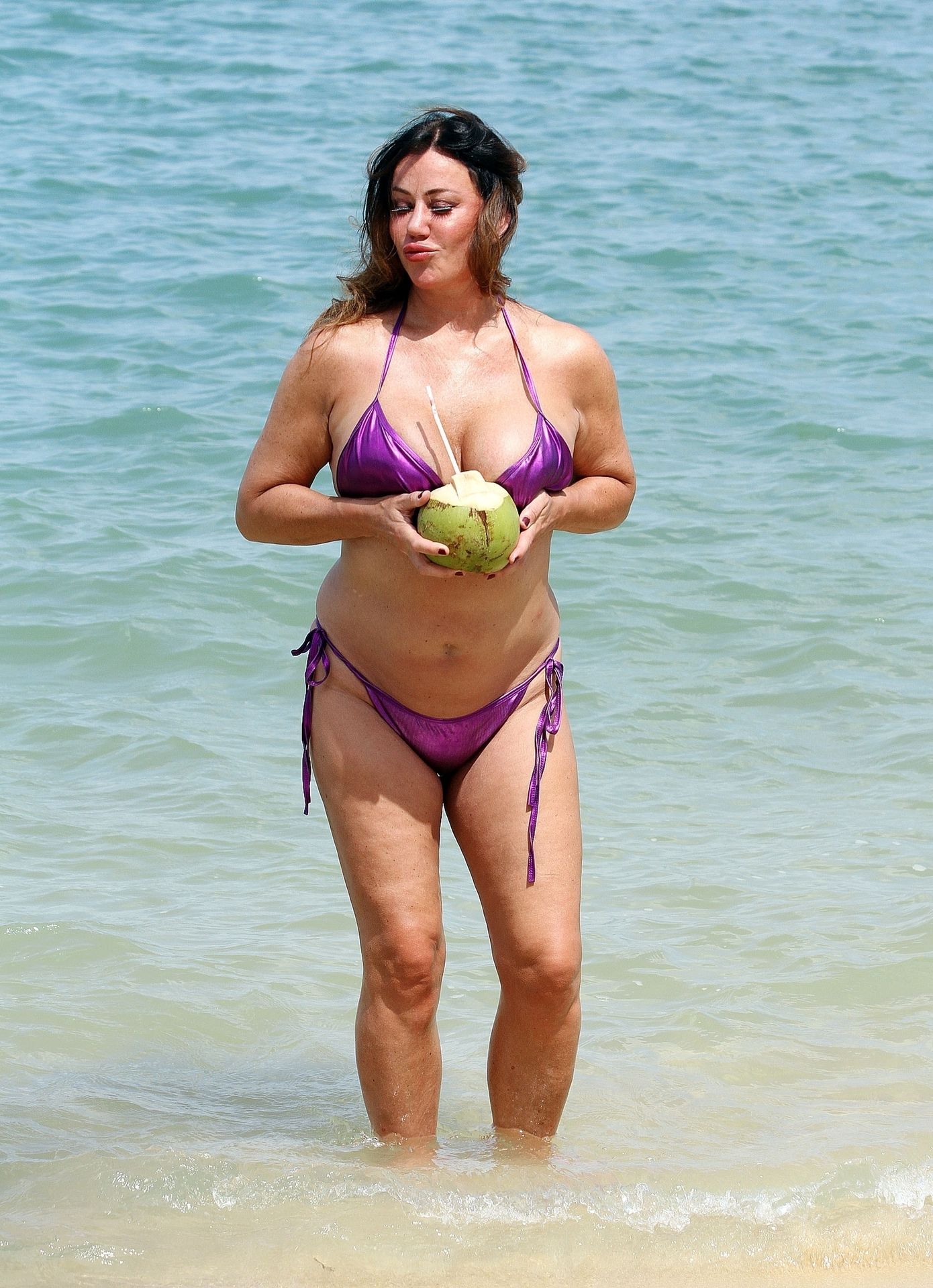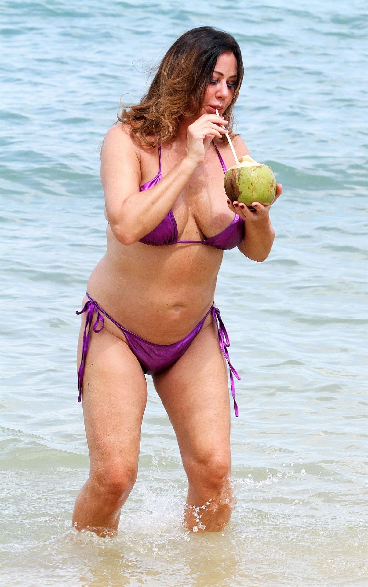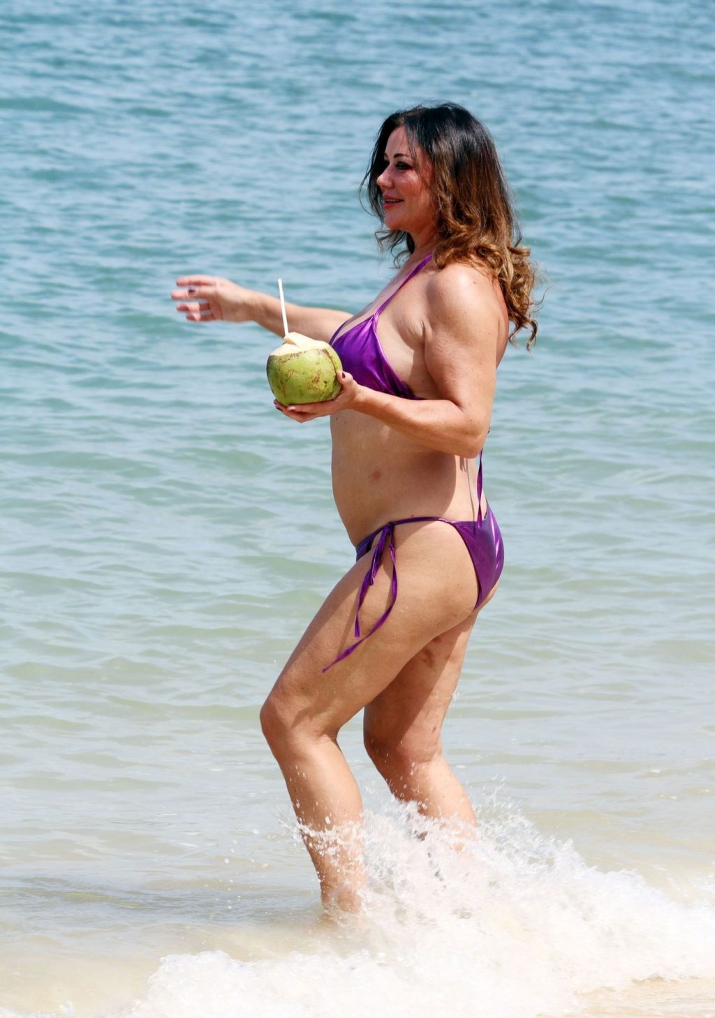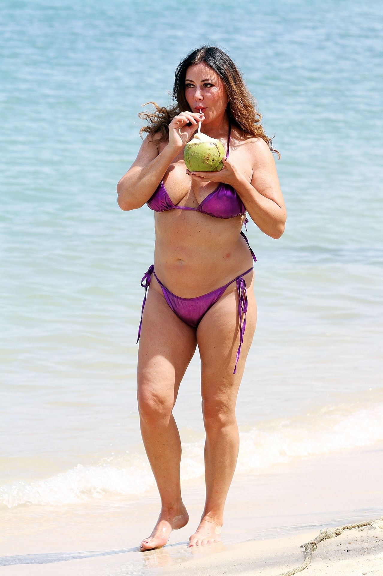 A estrela de reality show Lisa Appleton exibe seu corpo de praia em um biquíni roxo brilhante enquanto relaxa na praia, aproveitando uma bebida de coco durante as férias na Tailândia, 24/11/2019.