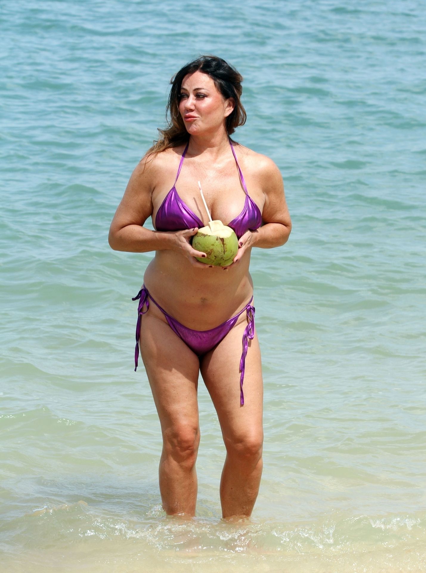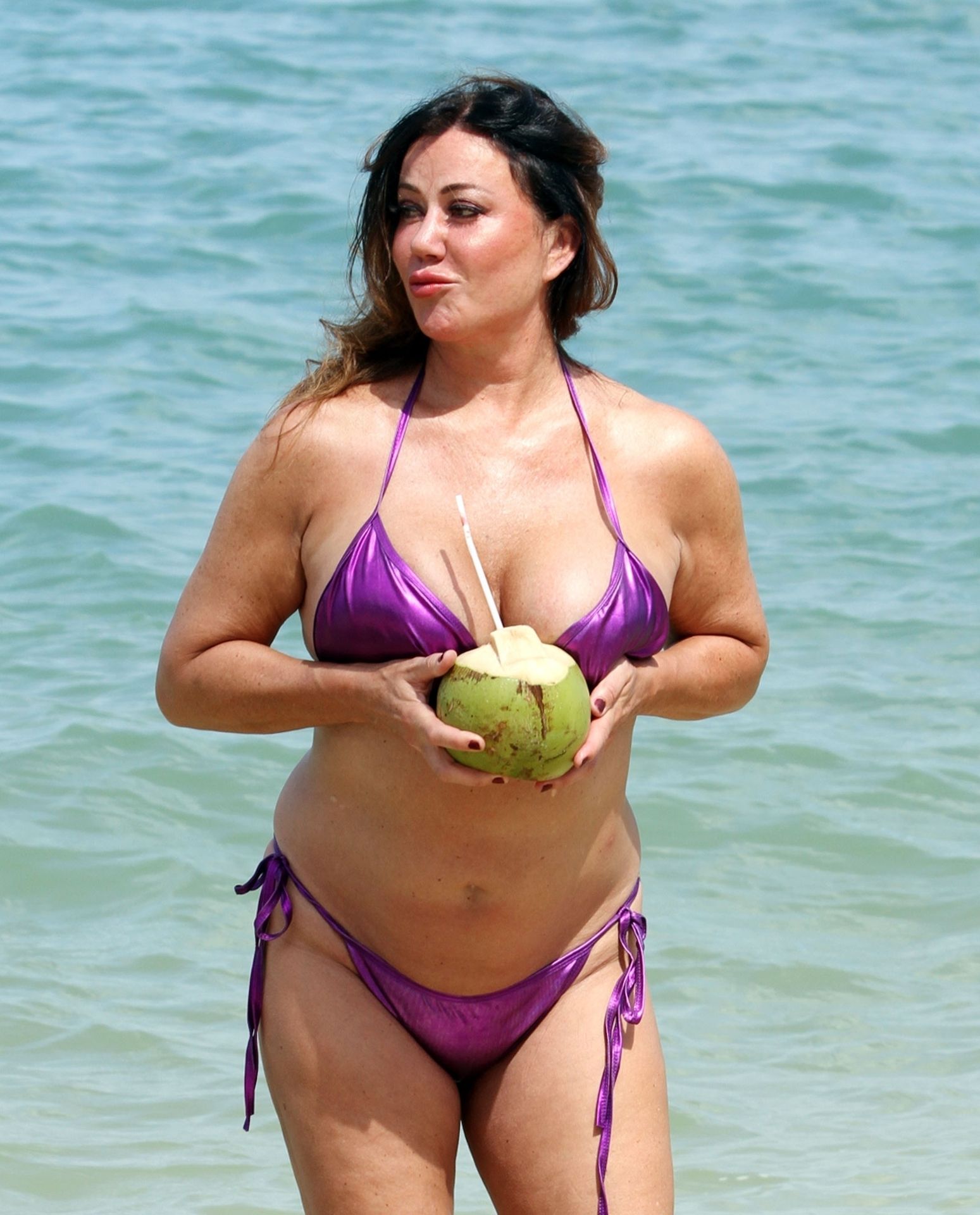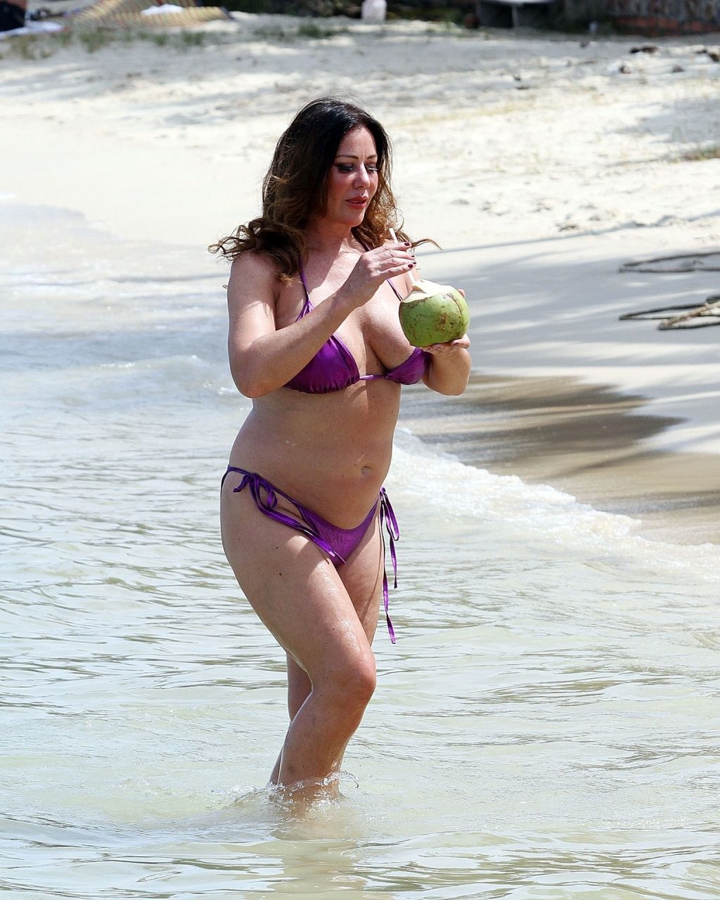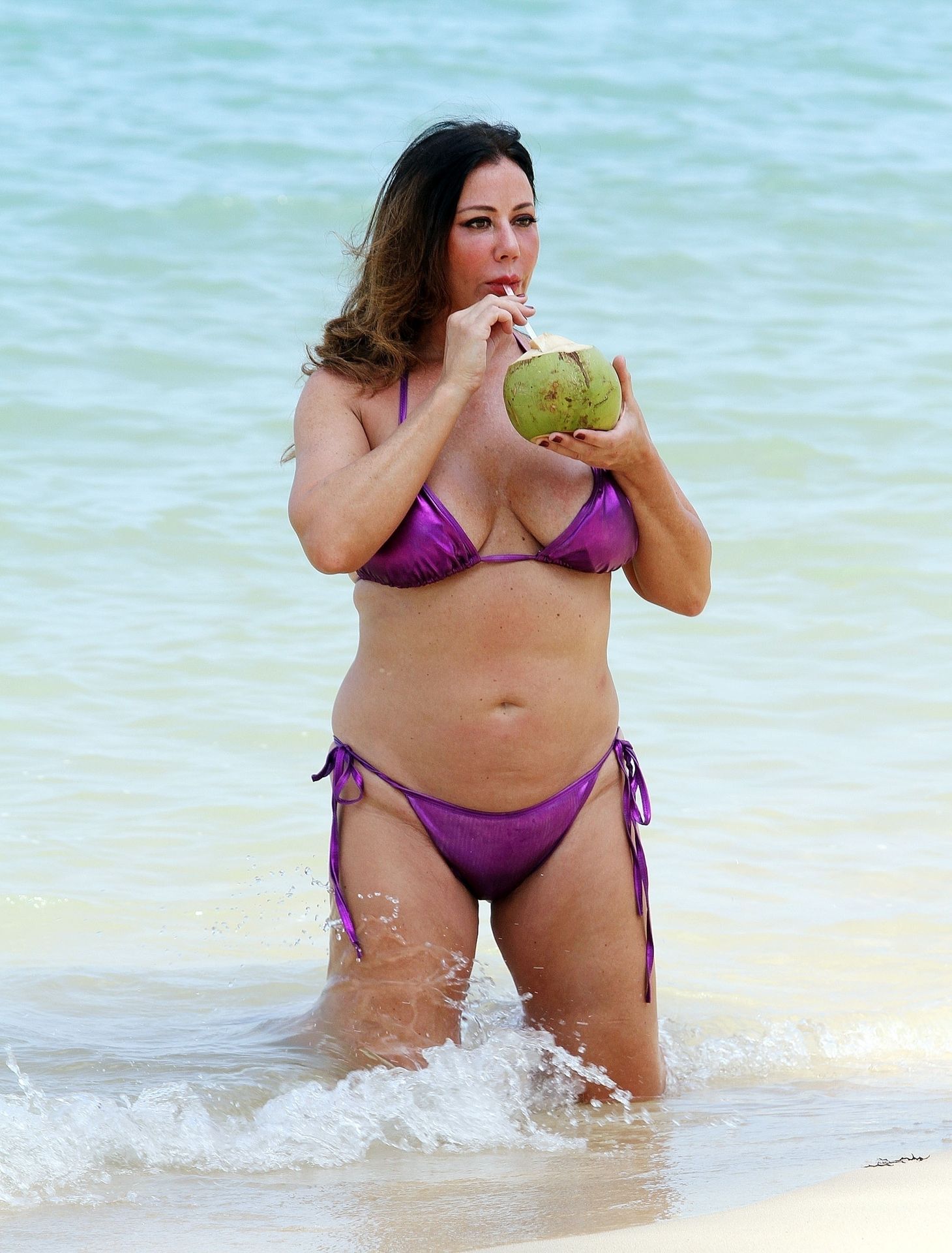 A estrela de reality show Lisa Appleton exibe seu corpo de praia em um biquíni roxo brilhante enquanto relaxa na praia, aproveitando uma bebida de coco durante as férias na Tailândia, 24/11/2019.