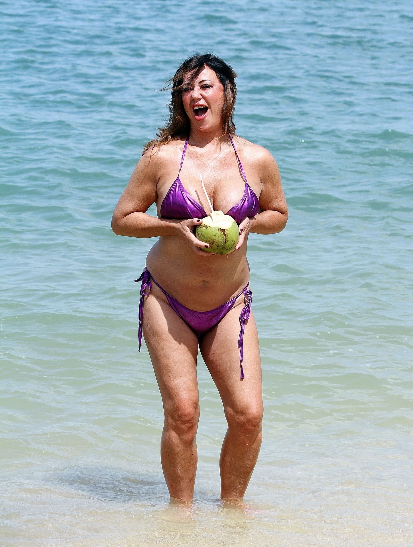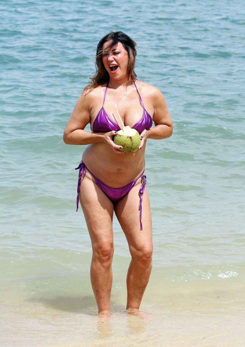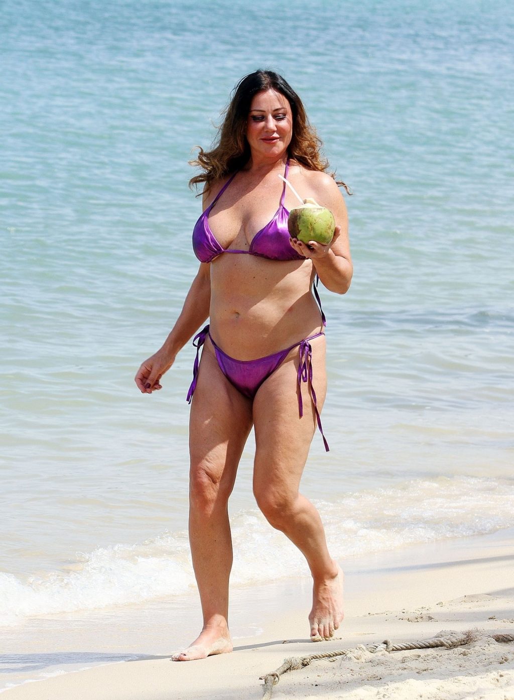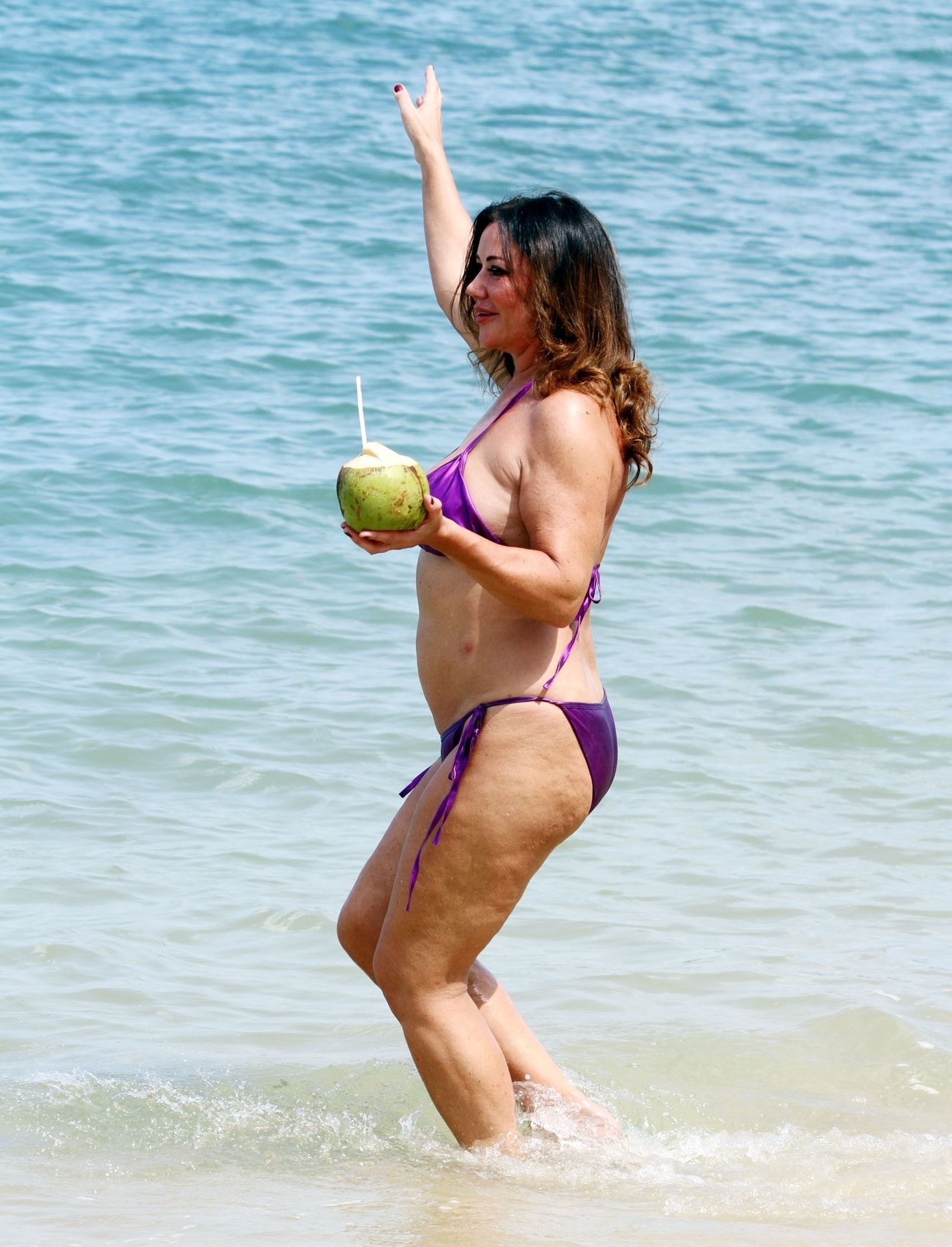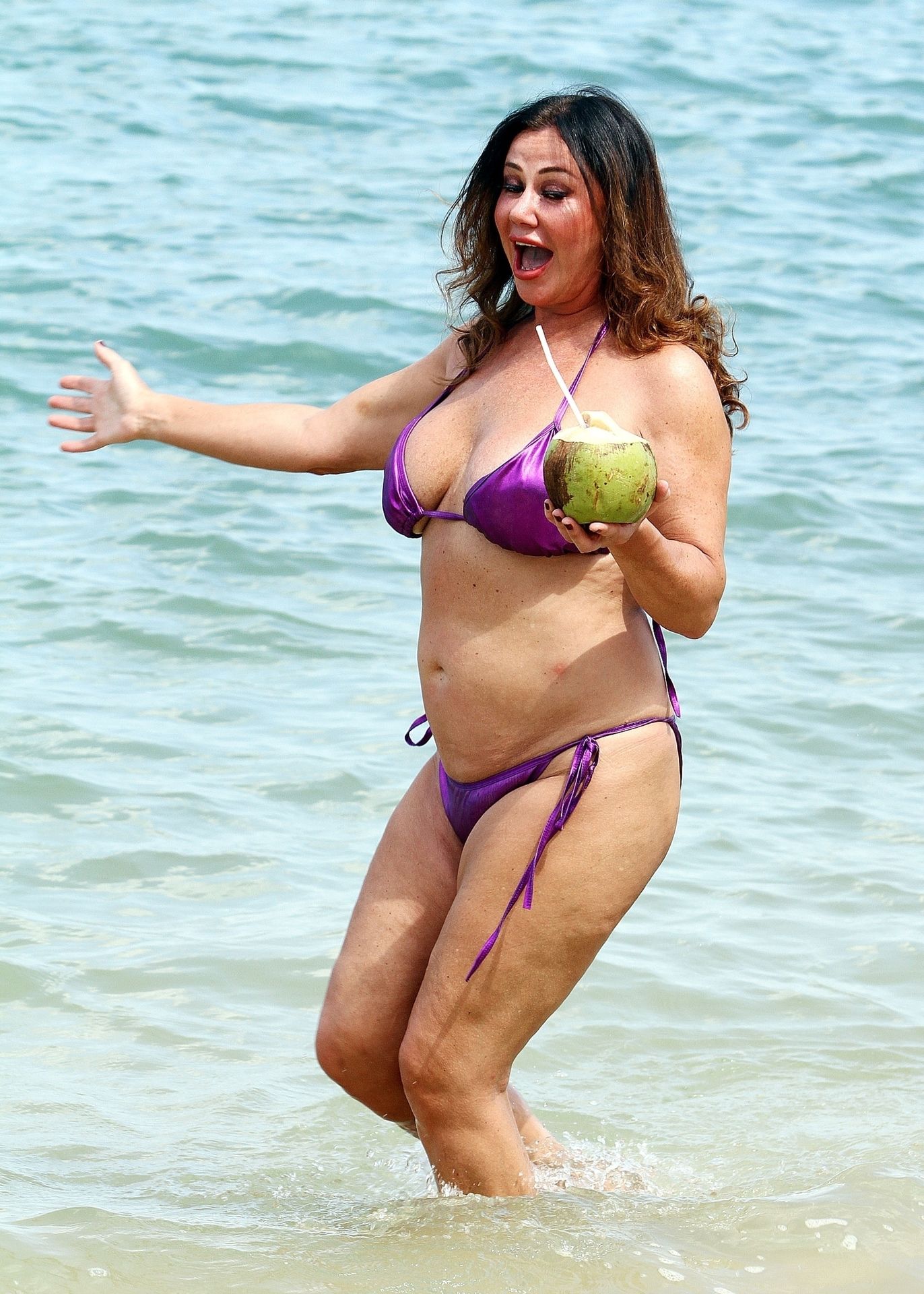 A estrela de reality show Lisa Appleton exibe seu corpo de praia em um biquíni roxo brilhante enquanto relaxa na praia, aproveitando uma bebida de coco durante as férias na Tailândia, 24/11/2019.