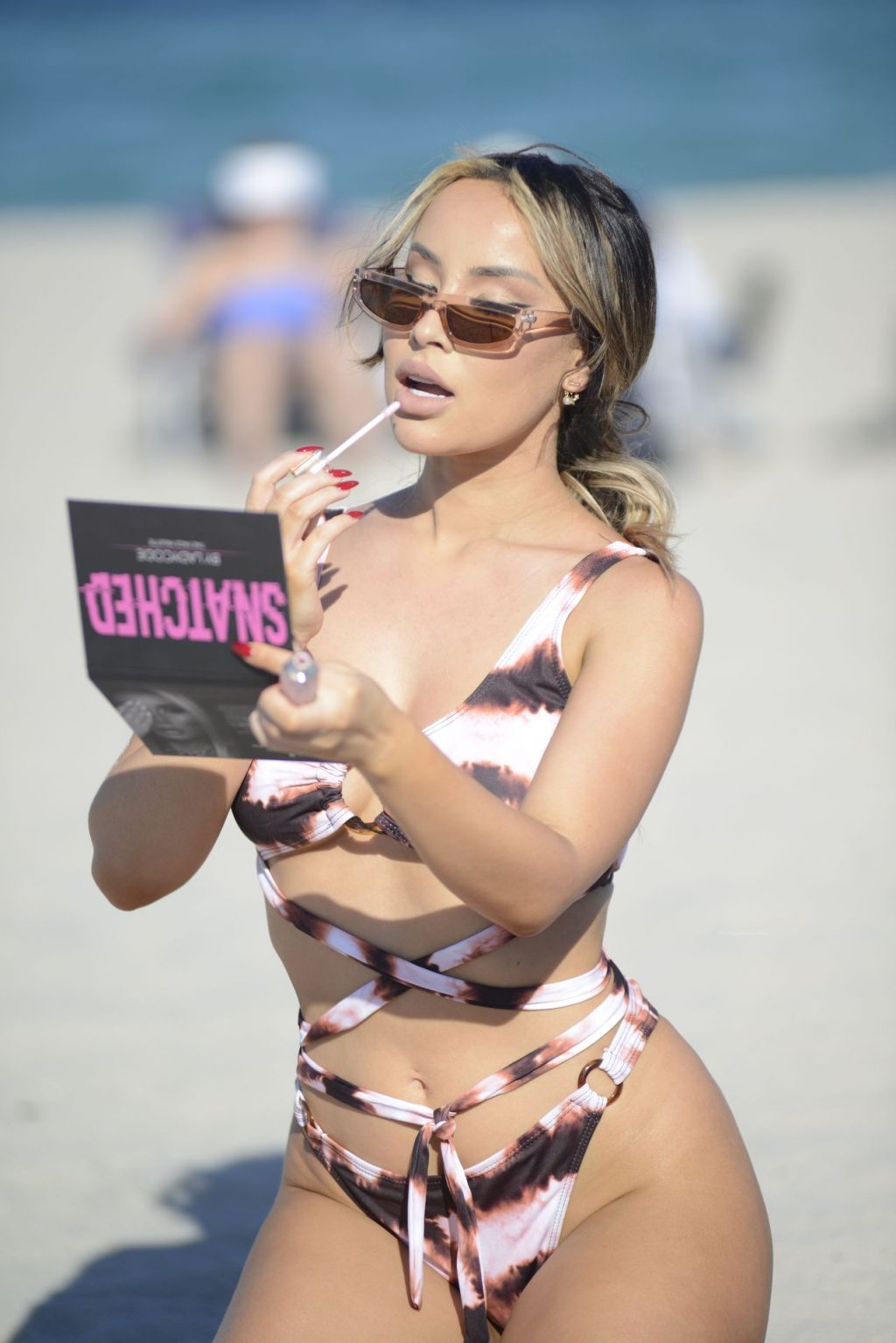 Lisa Opie chamou atenção enquanto relaxava na praia em Miami, 24/04/2021. Sempre linda e pronta para fotos, a estrela da beleza de 28 anos retocou sua maquiagem e tirou selfies.