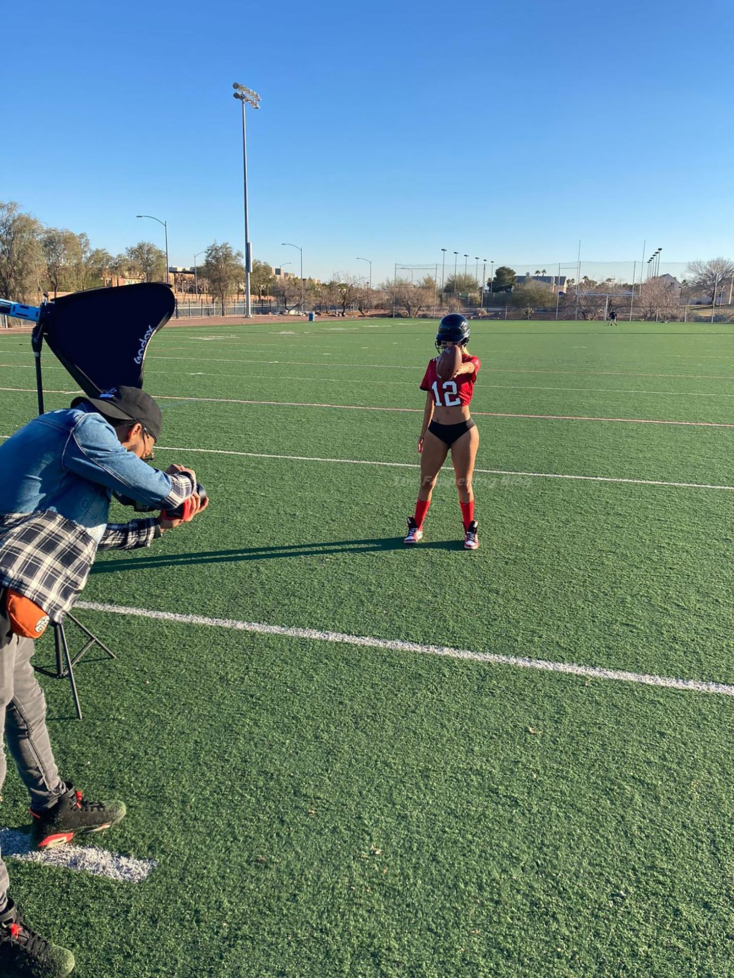 A modelo loira não tomou riscos com seu equipamento de segurança enquanto fazia um ensaio fotográfico divertido – mas acabou rindo ao perceber que seu capacete era para beisebol, não para a NFL!